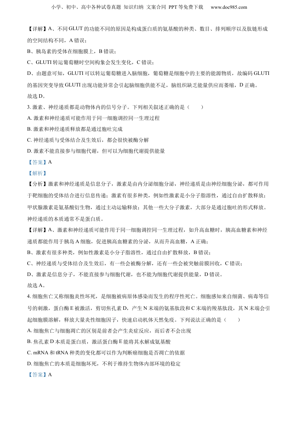 小学、初中、高中各种试卷真题知识归纳文案合同PPT等免费下载www.doc985.com2024年高考适应性考试(二)生物学试题一、单项选择题:本部分包括14题,每题2分,共计28分。每题只有一个选项最符合题意。1.下列关于细胞中化合物和细胞结构的叙述,正确的是()A.多糖的结构多样性与其单体的种类、数目、排列顺序有关B.细菌中DNA不与蛋白质结合成染色体,但能复制和表达C.线粒体外膜上存在运输葡萄糖和丙酮酸的转运蛋白D.叶绿体膜的内外侧蛋白质分布不对称,脂质对称分布【答案】B【解析】【分析】有氧呼吸的第一、二、三阶段的场所依次是细胞质基质、线粒体基质和线粒体内膜。有氧呼吸第一阶段是葡萄糖分解成丙酮酸和[H],合成少量ATP;第二阶段是丙酮酸和水反应生成二氧化碳和[H],合成少量ATP;第三阶段是氧气和[H]反应生成水,合成大量ATP。【详解】A、多糖中的淀粉、糖原和纤维素的单体都是葡萄糖,其结构的多样性与其单体的种类无关,A错误;B、细菌中DNA是裸露的,不与蛋白质结合成染色体,但能作为模板,进行复制和表达,B正确;C、葡萄糖不能进入线粒体中,线粒体外膜上不存在运输葡萄糖的载体蛋白,C错误;D、叶绿体膜的内外侧蛋白质分布不对称,脂质也不是对称分布,D错误。故选B。2.人体细胞有多种葡萄糖转运蛋白(GLUTs),其中GLUTI主要负责葡萄糖进入红细胞和跨越血-脑屏障,GLUT4对胰岛素较为敏感。以下叙述正确的是()A.不同GLUT的功能不同的根本原因是氨基酸的种类不同B.胰岛素与细胞内受体结合后会促进含GLUT4的囊泡与细胞膜融合C.GLUTI转运葡萄糖进入人体的红细胞时空间构象不会发生改变D.编码GLUTI的基因突变可能导致脑组织缺乏能量供应而萎缩【答案】D【解析】【分析】自由扩散的方向是从高浓度向低浓度,不需载体和能量;协助扩散的方向是从高浓度向低浓度,需要转运蛋白,不需要能量;主动运输的方向是从低浓度向高浓度,需要载体和能量等。小学、初中、高中各种试卷真题知识归纳文案合同PPT等免费下载www.doc985.com【详解】A、不同GLUT的功能不同的原因是构成蛋白质的氨基酸的种类、数目、排列顺序以及肽链形成的空间结构不同,A错误;B、胰岛素的受体在细胞膜上,B错误;C、GLUTI转运葡萄糖时空间构象会发生变化,C错误;D、由题意可知,GLUTI可以转运葡萄糖进入脑细胞,葡萄糖是细胞中的主要的能源物质,故编码GLUTI的基因突变导致GLUTI出现功能异常会引起脑细胞供能不足,脑组织缺乏能量供应而萎缩,D正确。故选D。3.激素、神经递质都是动物体内的信号分子。下列相关叙述正确的是()A.激素和神经递质可能作用于同一细胞调控同一生理过程B.激素和神经递质释放都是通过胞吐完成C.神经递质与受体结合及生效后,都会很快被酶分解D.激素不能直接参与细胞代谢,但可以为细胞代谢提供能量【答案】A【解析】【分析】激素和神经递质是信息分子,激素是由内分泌细胞分泌,神经递质是由神经细胞分泌,都可作用于靶细胞的受体结合进行信息传递;激素有很多种类,例如性激素是小分子脂溶性,通过自由扩散释放;甲状腺激素是氨基酸衍生物,通过主动运输释放;其他一些大分子激素,大部分是通过胞吐的形式释放。神经递质的本质通常不是蛋白质。【详解】A、激素和神经递质可能作用于同一细胞调控同一生理过程,如升高血糖时,胰高血糖素和神经递质都能作用于胰岛A细胞,促进胰高血糖素的分泌,从而升高血糖,A正确;B、激素有很多种类,例如性激素是小分子脂溶性,通过自由扩散释放,B错误;C、神经递质与受体结合及生效后,有一些会被酶分解,还有一些会被突触前膜回收,C错误;D、激素是信息分子,不能直接参与细胞代谢,也不能为细胞代谢提供能量,D错误。故选A。4.细胞焦亡又称细胞炎性坏死,是细胞被病原体感染而发生的程序性死亡。细胞感知来自细菌、病毒等信号的刺激,蛋白酶E被激活,剪切焦孔素D,产生N末端的氨基肽段和C末端的羧基肽段,其N末端会引起细胞膜溶解,释放大量炎性细胞因子,快速启动机体天然免疫。下列说法正确的是()A.细胞焦亡与细胞凋亡的区别是前者会产生炎症反应,而后者不会出现B.焦孔素D本质是蛋白质,激活蛋白酶E能将其水解成氨基酸C.mR...