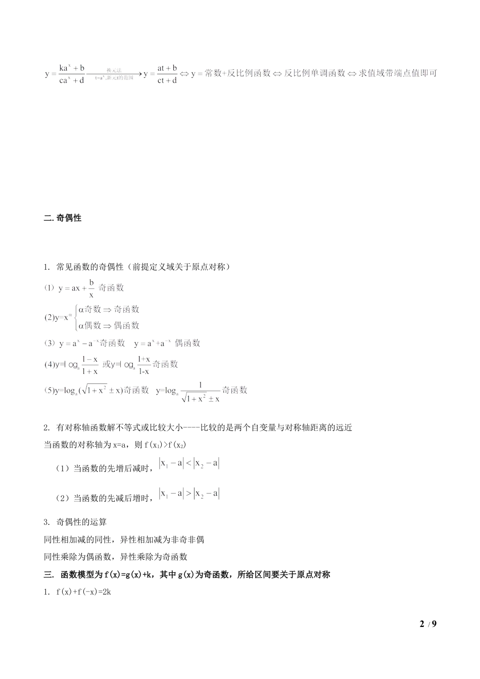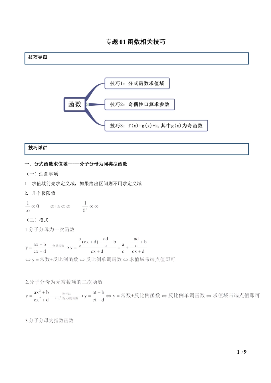 1/9专题01函数相关技巧一.分式函数求值域-----分子分母为同类型函数(一)注意事项1.求值域前先求定义域,如果给出区间则不用求定义域2.几个极限值(二)模式技巧导图技巧详讲2/9二.奇偶性1.常见函数的奇偶性(前提定义域关于原点对称)2.有对称轴函数解不等式或比较大小----比较的是两个自变量与对称轴距离的远近当函数的对称轴为x=a,则f(x1)>f(x2)(1)当函数的先增后减时,(2)当函数的先减后增时,3.奇偶性的运算同性相加减的同性,异性相加减为非奇非偶同性乘除为偶函数,异性乘除为奇函数三.函数模型为f(x)=g(x)+k,其中g(x)为奇函数,所给区间要关于原点对称1.f(x)+f(-x)=2k3/9推导:f(x)+f(-x)=g(x)+k+g(-x)+k=g(x)-g(-x)+2k=2k2.f(x)max+f(x)min=2k推导:f(x)max+f(x)min=g(x)max+k+g(x)min+k=2k(奇函数的最大值与最小值成相反数)3.如何找k---f(0)=k推导:f(0)=g(0)+k=k技巧1分式函数求值域【例1】(1)(2020山西省太原市实验中学)已知函数的取值范围。(2)(2020湖南省长沙市第一中学)函数的值域为。【举一反三】1.(2019上海市普陀区曹杨第二中学函数),的值域是________;2.(2020广东省东莞市北师大东莞石竹附属学校)函数的值域是。3.(2020陕西省西安市高新一中)函数的值域为________.技巧2口算奇偶性求参数【例2】(1)(2020·福建漳州·高三其他(文))若函数是偶函数,则技巧举证4/9实数()A.B.0C.1D.(2)(2020·河南高三月考(理))已知是奇函数,且实数满足,则的取值范围是()A.B.C.D.【举一反三】1.(2020·沙坪坝·重庆南开中学高三月考(理))已知函数,则不等式的解集为()A.B.C.D.2.(2020·河北桃城·衡水中学高三其他(文))若函数,则不等式的解集为()A.B.C.D.3.(2020·河南罗山·高三月考(理))已知函数f(x)的图象关于y轴对称,且f(x)在(-∞,0]上单调递减,则满足的实数x的取值范围是()5/9A.B.C.D.技巧3形如f(x)=奇函数+常数【例3】(1)(2020·河南平顶山·高三月考(文))已知函数,若,则()A.B.C.1D.2(2)(2019秋•市中区校级月考)已知,,,若的最大值为,的最小值为,则等于A.0B.2C.D.(3)(2020·五华·云南师大附中高三月考(文))已知函数,则()A.2019B.2020C.4038D.4040【举一反三】1.(2019秋•椒江区校级期中)已知函数的最大值为,最小值为,则的值等于6/9A.2B.4C.D.2.(2021·宁夏银川二十四中高三月考(理))若,且,则()A.B.C.D.3.已知函数f(x)=In(x+)+1,若实数a满足f(-a)=2,则f(a)等于()A.1B.0C.D.4.(2020·云南师大附中高三月考(理))已知函数,则()A.2019B.2020C.4038D.40405.(2020·全国高三月考(理))已知函数,则()A.2B.0C.D.1.(2019江苏省盐城市)函数的值域为______.技巧强化7/92.函数的值域是______.3.(2020黑龙江省哈尔滨师范大学附中)函数的值域为________.4.(2020·江西省信丰中学高三月考(文))已知函数,且,则函数的值是5.(2020·山西大同·高三月考(文))设函数的最大值为5,则的最小值为6(2020·广东霞山·湛江二十一中高三月考)已知函数的最大值为M,最小值为m,则.7.(2019·杏花岭·山西实验中学高三月考)已知函数,其中为函数的导数,则.8.(2019·山东任城·济宁一中高三月考)设函数,若8/9,.9.(2019·湖南娄底·高三期末(文))已知函数,其导函数为,则的值为10.(2019秋•渝中区校级月考)已知,则在区间,上的最大值最小值之和为.11(2020秋•广东月考)已知函数在,上的最大值为,最小值为,则.12.(2019秋•宁波期中)已知函数的最大值为,最小值为,则M+m.13.(2020·陕西西安·高三月考(理))已知:,:函数为奇函数,则是成立的().A.充分不必要条件B.必要不充分条件C.充要条件D.既不充分也不必要条件14.(2019·河南周口·高三月考)设函数,则使得成立的的取值范围是.9/915.(2020·福建厦门双十中学高三月考(文))已知函数是奇函数,则的值等于.16.若函数为奇函数,则=.17.若函数是奇函数,则。18.已知函数为偶函数,则。