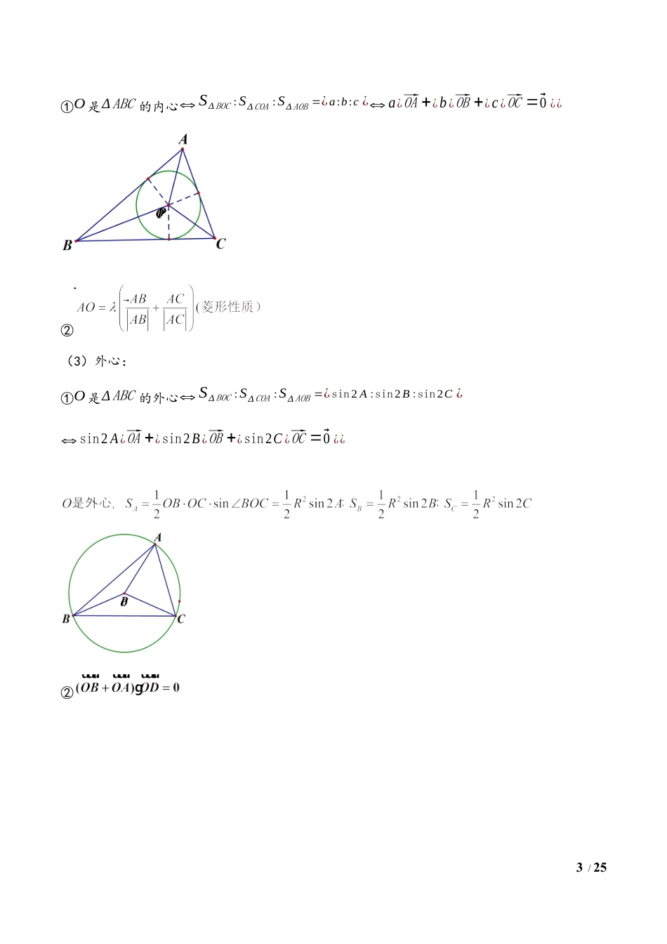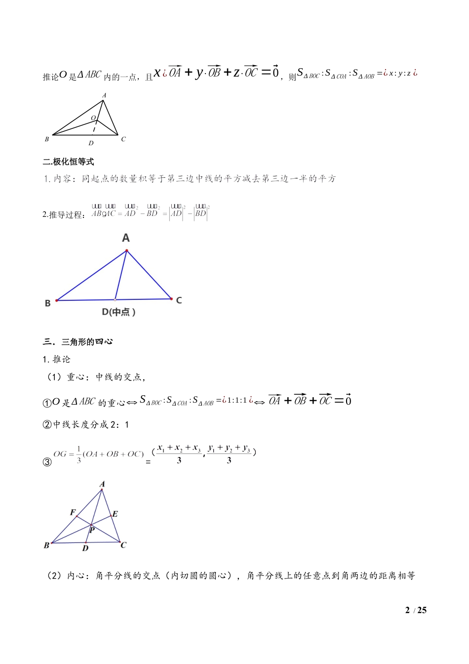 1/25专题02平面向量一:奔驰定理1:奔驰定理内容---三角形的面积比等于其所对应的系数比已知O是ΔABC内的一点,ΔBOC,ΔAOC,ΔAOB的面积分别为SA,SB,SC,求证:SA¿⃗OA+¿SB¿⃗OB+¿SC¿⃗OC=⃗0¿¿2.推导过程证明方法一:如图延长OA与BC边相交于点D则BDDC=SΔABDSΔACD=SΔBODSΔCOD=SΔABD−¿SΔBODSACD−¿SΔCOD=SCSB¿¿⃗OD=DCBC⃗OB+BDBC⃗OC=SBSB+SC⃗OB+SCSB+SC⃗OC ODOA=SBODSBOA=SCODSCOA=SBOD+SCODSBOA+SCOA=SASB+SC∴⃗OD=−SASB+SC⃗OA∴−SASB+SC⃗OA=SBSB+SC⃗OB+SCSB+SC⃗OC∴SA¿⃗OA+¿SB¿⃗OB+¿SC¿⃗OC=⃗0¿¿技巧导图技巧详讲2/25推论O是ΔABC内的一点,且x¿⃗OA+y⋅⃗OB+z⋅⃗OC=⃗0,则SΔBOC:SΔCOA:SΔAOB=¿x:y:z¿DOABC二.极化恒等式2.推导过程:三.三角形的四心1.推论(1)重心:中线的交点,①O是ΔABC的重心⇔SΔBOC:SΔCOA:SΔAOB=¿1:1:1¿⇔⃗OA+⃗OB+⃗OC=⃗0②中线长度分成2:1③=(2)内心:角平分线的交点(内切圆的圆心),角平分线上的任意点到角两边的距离相等3/25①O是ΔABC的内心⇔SΔBOC:SΔCOA:SΔAOB=¿a:b:c¿⇔a¿⃗OA+¿b¿⃗OB+¿c¿⃗OC=⃗0¿¿②(3)外心:①O是ΔABC的外心⇔SΔBOC:SΔCOA:SΔAOB=¿sin2A:sin2B:sin2C¿⇔sin2A¿⃗OA+¿sin2B¿⃗OB+¿sin2C¿⃗OC=⃗0¿¿②OO4/25(4)垂心:高线的交点,高线与对应边垂直①O是ΔABC的垂心:⇔SΔBOC:SΔCOA:SΔAOB=¿tanA:tanB:tanC¿⇔tanA¿⃗OA+¿tanB¿⃗OB+¿tanC¿⃗OC=⃗0¿¿OCABD证明:如图O为三角形的垂心,tanA=CDAD,tanB=CDDB⇒tanA:tanB=DB:ADSΔBOC:SΔCOA=DB:AD∴SΔBOC:SΔCOA=¿tanA:tanB¿同理得SΔCOA:SΔAOB=¿tanB:tanC¿,SΔBOC:SΔAOB=¿tanA:tanC¿∴SΔBOC:SΔCOA:SΔAOB=¿tanA:tanB:tanC¿②由,得,即,所以.同理可证,.5/25技巧1奔驰定理【例1】是内一点,满足,则()A.B.C.D.【答案】B【解析】技巧法:公共点P,三角形ABC,则常规法:是内一点,且满足,.延长到,使得,延长到,使得,连结、、,则.是的重心,设,则,,,,.故选:.技巧举证6/25【举一反三】1.已知所在平面内一点,满足,则与的面积的比值为()A.B.C.D.【答案】C【解析】技巧法,所以,即公共点为P,三角形ABC,则所对应的向量,其系数为2,为整个三角形,其所对应技巧法注意事项1.条件一般是3个同起点的向量相加减且等于零向量,若系数有正有负则公共点在三角形外,系数都为正则公共点在三角形内2.三角形所对应的向量的找法(1)图像法:三角形顶上的向量(2)顶点法:公共点即起点,剩余3点构成三角形的三个顶点,对应的向量两个点其中一个点为公共点,另外一点则是三角形的顶点。7/25的系数为三个向量的系数,6,所以面积比为常规法:如图所示,,所以,即,所以,设和的中点分别为,则由可得,即,即点是的中位线上靠近点的三等分点,所以,故选:C2.(广东省深圳外国语学校2020)点是所在平面上一点,若,则与的面积之比是()A.3B.2C.D.【答案】D【解析】技巧法:公共点为A,三角形为PCB,则与8/25对应的向量为,则与的面积之比为常规法:点是所在平面上一点,过作,如下图所示:由,故,所以与的面积之比为,故选:D.3.(天津市红桥区2019)已知点O是内一点,满足,,则实数m为()A.2B.-2C.4D.-4【答案】D【解析】技巧法:,常规法:由得:设,则三点共线如下图所示:9/25与反向共线本题正确选项:技巧2三角形的四心【例2-1】点O是△ABC所在平面内的一点,满足,则点O是的__________心.【答案】垂【解析】,即同理可得:,点为的垂心本题正确结果:垂【例2-2】(黑龙江省哈尔滨市哈尔滨师范大学附属中学)在中,设,则动点M的轨迹必通过的()A.垂心B.内心C.重心D.外心【答案】D【解析】10/25设为中点,则为的垂直平分线轨迹必过的外心本题正确选项:【举一反三】1.(河北省保定市)过内一点任作一条直线,再分别过顶点作的垂线,垂足分别为,若恒成立,则点是的()A.垂心B.重心C.外心D.内心【答案】B【解析】本题采用特殊位置法较为简单.因为过内一点任作一条直线,可将此直线特殊为过点A,则,有.如图:则有直线AM经过BC的中...