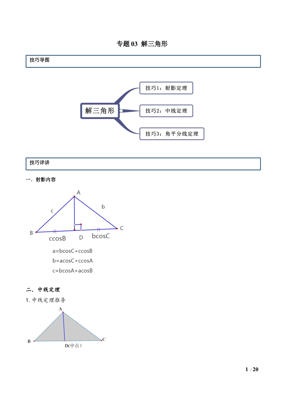 1/20专题03解三角形一.射影内容二.中线定理1.中线定理推导技巧导图技巧详讲2/202.三角形面积3.三角形的周长三.角平分线定理1.角平分线上的点到两边的距离相等2.三角形的一个角的角平分线,这个角平分线其对边所成的两条线段与这个角的两邻边对应成比例即3/20技巧一三角形的射影定理【例1】(2017•新课标Ⅱ)的内角,,的对边分别为,,,若,则.【答案】【解析】技巧法:由射影定理可得,,,故答案为:常规法:,由正弦定理可得,,,,,,故答案为:【举一反三】1.(2020•青岛模拟)在中,内角,,所对的边分别是,,,若,且,则B=【答案】技巧举证4/20【解析】技巧法:由射影定理可得,因为,则.常规法:因为,由正弦定理可得,,因为,所以,所以,因为,则.2(2020•安徽模拟)在中,角,,的对边分别为,,.若,,,则的面积为。【答案】【解析】技巧法:由射影定理可得,,得.,解得.则的面积.常规法:,,,即,,解得,,解得.5/20,解得.则的面积.3(2020•南充模拟)的内角,,的对边分别为,,,若,则内角C=。【答案】【解析】技巧法:由射影定理可得故,又,所以.常规法:由正弦定理得:,即,即,由于,故,又,所以.技巧2三角形的中线定理【例2】(2020·梅河口市第五中学高三(理))在中,,已知边上的中线,则面积的最大值为__________.【答案】.【解析】技巧法:常规法:在△ABC中,,BC边上的中线AD=3,,设AB=c,AC=b,6/20平方可得9=.化简可得,,∴bc≤36,当且仅当时成立,故△ABC的面积S=故答案为【举一反三】1.(2020·广东高三月考(理))在中,,已知BC边上的中线,则面积的最大值为______.【答案】【解析】技巧法:常规法:中,,边上的中线长为3,,设,,平方可得:,化简可得,,可得:,故的面积.7/20故答案为:.2.(2020·全国)在锐角三角形中,角、、的对边分别为、、,向量,,且.(1)求角;(2)若,且的面积为,求边上的中线的大小.【答案】(1);(2).【解析】(1)因为,,,所以,由正弦定理得.因为,所以,所以,因为,所以;(2)因为的面积为,所以,因为,,所以.在中,为的中点,,由余弦定理得.所以.8/20技巧3角平分线的定理【例3】(2020·梅河口市第五中学)已知中,.是的角平分线,交于.(Ⅰ)求的值;(Ⅱ)求的长.【答案】(I);(II).【解析】(Ⅰ)在中,,在中,因为是的角平分线,所以(Ⅱ)法一:由题知,所以,所以法二:所以【举一反三】9/201.(2019·江苏)在中,,,角A的角平分线,则______.【答案】【解析】由题意,,,角的角平分线,在中,由正弦定理:,可得,则,所以,那么,则,所以.在中,由正弦定理:,所以.可得.故答案为:.2.(2020·梅河口市第五中学高一期末(文))已知中,是的角平分线,交于.10/20(1)求的值;(2)若,求.【答案】(1);(2).【解析】(1)在中,,在中,,因为是的角平分线,所以.(2)设,则,所以,所以,所以.3.(2019·河南高考模拟(理))在中,,,为的内角平分线,.(Ⅰ)求的值(Ⅱ)求角的大小【答案】(Ⅰ)2;(Ⅱ).【解析】(Ⅰ)在三角形ABD中,由正弦定理得:11/20在三角形ACD中,由正弦定理得:因为(Ⅱ)在三角形ABD中,由余弦定理得在三角形ACD中,由余弦定理得又解得又1.(2020春•上饶月考)在中,角,,的对边分别是,,,且面积为,若,,则角等于【答案】【解析】技巧法:由射影定理可得所以,故,,,,故,则角.技巧强化12/20常规法:因为,由正弦定理可得,,即,因为,所以,故,,,,故,则角.2.(2020春•路南区校级月考)在中,内角,,所对的边分别为,,,且.若,的面积为,则b+c=【答案】4【解析】技巧法:由射影定理可得所以即,所以,,所以,因为,由余弦定理可得,,故.常规法:因为.由正弦定理可得,.因为,所以即,所以,,所以,因为,由余弦定理可得,,故.3.(2019·福建高三(理))已知为等腰三角形,,边上的中线的长为7,则的面积为__________.【答案】13/20【解析】【分析】先设等腰三角形的腰长为,进而可得底边的长,再由余弦定理列出方程,即可求出,从而可得结果.【...
