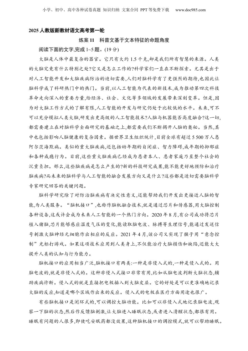 小学、初中、高中各种试卷真题知识归纳文案合同PPT等免费下载www.doc985.com2025人教版新教材语文高考第一轮练案11科普文基于文本特征的命题角度阅读下面的文字,完成1~5题。(19分)大脑是人体中最复杂的器官。它只有大约1.5千克,却是我们所有智慧的来源。人类的大脑究竟有什么特别之处?它又是怎么工作的?科学家们一直在不断探索。尤其是出于对人工智能开发和大脑疾病防治的迫切需要,人们对脑科学有了更强烈的期待,也因此让脑科学成了科研热门中的热门。当前,以人工智能为代表的新技术,成为推动第四次科技革命走向深入的重要力量,给经济、社会、文化等多领域的发展带来深刻变革。但是,因为对大脑工作方式的了解有限,人工智能的开发与研究仍处于比较低的水平。未来,可不可以充分模拟人类大脑,研发出更高级的人工智能技术?人脑与机器能否高度融合?这一切,都需要建立在对脑科学全面研究的基础之上,都需要我们不断揭开人脑的奥秘。当然,其中也包括影响人脑健康的复杂因素。据世界卫生组织统计,目前全球有超过5500万人患阿尔茨海默病。类似的重大脑疾病,还包括幼年期的自闭症、智力障碍,成年期的抑郁症和各种成瘾行为。目前,这些重大脑疾病已经成为患者本人、患者家庭乃至整个社会的沉重负担。那么,这些脑疾病是怎么产生的?新的科技研究成果,能不能更好地预防和治疗脑疾病?而未来的脑科学与人工智能的融合发展方向又是什么?这些都是迫切需要脑科学专家研究回答的关键问题。脑科学研究除了对防治脑疾病有决定性意义,还能帮助我们开发出更接近人脑的智能,为人类服务。“脑机接口”,也称作脑机融合技术,就是通过芯片和传感器,用大脑控制各种设备,这或许会成为未来人工智能的一个热门方向。2020年8月,有公司成功将芯片植入猪脑,芯片能够感应温度气压的变化,能读取脑电波、脉搏等生理信号,能通过发送信号刺激大脑神经元细胞作出相应的反应。2021年4月,该公司又实现了猴子用“意念控制”光标打游戏。如果这项技术应用到人类身上,不仅能治疗大脑损伤和缺陷,还能大大提升人类的认知与行为能力。脑机接口的应用相当广泛,脑机接口有两类:一种是非侵入式的,一种是侵入式的。用脑电波的,就是非侵入式的。这种非侵入式接口非常有用,比如从脑电波判断大脑状态,辅助疾病诊断。侵入式的就是直接把电极插入到大脑皮层。它的好处是可以更准确地记录大脑的反应,知道是哪个区域作出来的反应。侵入式的电极在医疗方面用途也很广。有些脑机接口是闭环式的,可以调控大脑功能。比如可以非侵入式地记录脑电波,观察一下脑的状态,然后作反馈脑刺激,让大脑进入睡眠状态,或者进入清醒状态,都很有用。睡眠有问题的人很多,即使吃安眠药都没效果,这种脑机接口的调控模式,就可以帮助睡眠。小学、初中、高中各种试卷真题知识归纳文案合同PPT等免费下载www.doc985.com还有长途驾驶时,可以通过观测司机的大脑状态,及时作出提醒,这样使司机能够保持正常工作状态。类脑人工智能属于前沿科技,也会遇到很多社会伦理问题。比如说现在,我们研究人员可以控制别人的大脑,可以电刺激,可以读别人的大脑,谁有权来控制这个?父母可不可以对孩子做这个行为?医生什么情况下可以调控患者的大脑?这些行为都要有伦理标准。现在研究大脑,研究脑疾病,研究各种药物治疗、各种康复手段,都是要修复大脑,保护大脑。还有一个路径,就是增强大脑智能。但也存在社会伦理问题。比如运动员吃兴奋剂,就可以跑得比别人快,这个就是不被允许的。还有一个问题就是,人工智能可以取代什么职业。现在的大公司,都想发展通用人工智能。以前的机器人都是做一样的工作,就是做装配,现在出现更强的机器人,很多人就被替代了。大公司当然愿意用机器人,因为省钱,机器人可以一天工作24小时。那么,社会上就会出现失业问题,而每个国家面临的情况又不一样,发展中国家跟发达国家也不一样,这些都是发展类脑人工智能要面临的问题。假如有一天,真正跟人差不多的一群机器人出现,这群机器人有自我思考能力,那时的社会应该是什么样的社会,这是我们需要认真考虑的。这可以算是伦理问题,也是社会问题。我们必须设计出一种模式,将来发展出来的人工智能,通过管控,能够更好地服务人类、造福人类,...