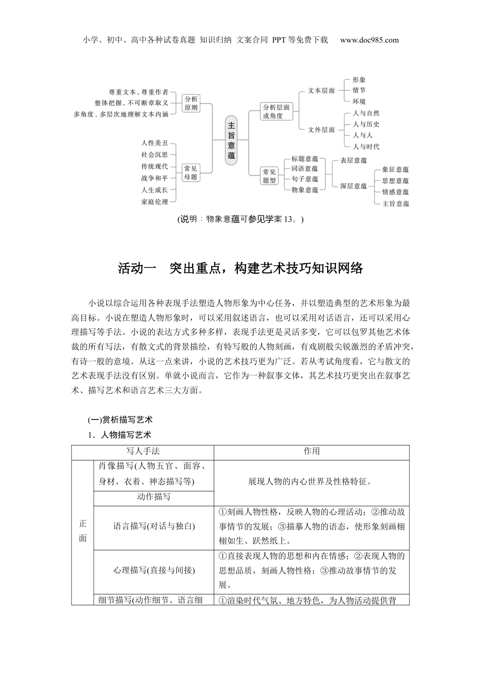 小学、初中、高中各种试卷真题知识归纳文案合同PPT等免费下载www.doc985.com学案14赏析艺术技巧,分析主旨意蕴——精准判断,多方思考复习任务1.构建小说艺术技巧知识网络,精准答好艺术技巧赏析题。2.能够从不同的层面与角度分析主旨意蕴,掌握常见主旨意蕴题的分析要领。考情微观1.赏析艺术技巧年份卷别篇名提问方式设题角度命题特点2023新高考Ⅱ卷《社戏(节选)》本文是如何描写社戏的仪式感的?请结合全文简要说明。(4分)综合描写艺术①小说艺术技巧是一个广泛的概念,考查重心在描写艺术和语言艺术上,要求能准确判断技巧,细致分析表达效果。②艺术技巧赏析是新课标核心素养中“审美素养”的重要内容。随着新课标的落地实施,这方面的命题将会加强,将会以短评、札记、评点题的形式出现。全国乙卷《长出一地的好荞麦》文中画线部分的描写,人、牛、犁浑然一体,这种艺术效果是如何营造出来的?请简要赏析。(6分)场景描写艺术2019全国Ⅰ卷《理水(节选)》鲁迅说:“我们从古以来,就有埋头苦干的人,有拼命硬干的人,有为民请命的人,有舍身求法的人,……这就是中国的脊梁。”请谈谈本文是如何具体塑造这样的“中国的脊梁”的。(6分)写人手法赏析全国Ⅱ卷《小步舞》请以老舞蹈师形象为例,谈谈小说塑造人物形象时运用了哪些表现手法。(6分)写人手法赏析全国Ⅲ卷《到梨花屯去》两个乘客为什么沉默?小说为什么首尾均有这一细节?请结合全文分析。(6分)细节描写作用小学、初中、高中各种试卷真题知识归纳文案合同PPT等免费下载www.doc985.com2.分析主旨意蕴年份卷别篇名提问方式设题角度命题特点2023新高考Ⅱ卷《社戏(节选)》文中记述社戏的筹备及演出过程,多处使用“依照往年成例”“照习惯”“照例”等,含有哪些意味?请结合全文谈谈你的理解。(6分)词语意蕴①探究题有时冠以“探究”字样,更多的是以“分析”字样出现。②命题点多为对标题、关键句子或物象意蕴的分析探究。2021新高考Ⅰ卷《石门阵》小说中多次出现的“门”,在不同层面有不同含义,请结合文本加以分析。(6分)物象意蕴2020新高考Ⅱ卷《大师(节选)》父亲说“我们下棋是下棋”,怎样理解这句话?请结合全文具体分析。(6分)句子意蕴1.艺术技巧2.主旨意蕴小学、初中、高中各种试卷真题知识归纳文案合同PPT等免费下载www.doc985.com(明:物象意可案说蕴参见学13。)活动一突出重点,构建艺术技巧知识网络小说以综合运用各种表现手法塑造人物形象为中心任务,并以塑造典型的艺术形象为最高目标。小说在塑造人物形象时,可以采用叙述语言,也可以采用对话语言,还可以采用心理描写等手法。小说的表达方式多种多样,表现手法更是灵活多变,它可以包罗其他艺术体裁的所有写法,有散文式的背景描绘,有特写般的人物刻画,有戏剧般尖锐激烈的矛盾冲突,有诗一般的意境。从这一点来讲,小说的艺术技巧更为广泛。若从考试角度看,它与散文的艺术表现手法没有区别。单就小说而言,它作为一种叙事文体,其艺术技巧更突出在叙事艺术、描写艺术和语言艺术三大方面。(一)赏析描写艺术1.人物描写艺术写人手法作用正面肖像描写(人物五官、面容、身材、衣着、神态描写等)展现人物的内心世界及性格特征。动作描写语言描写(对话与独白)①刻画人物性格,反映人物的心理活动;②推动故事情节的发展;③描摹人物的语态,使形象刻画栩栩如生、跃然纸上。心理描写(直接与间接)①直接表现人物的思想和内在情感;②表现人物的思想品质,刻画人物性格;③推动故事情节的发展。细节描写(动作细节、语言细①渲染时代气氛、地方特色,为人物活动提供背小学、初中、高中各种试卷真题知识归纳文案合同PPT等免费下载www.doc985.com节、服饰细节、表情细节等)景;②细腻逼真地刻画人物性格;③推动故事情节的发展;④照应上下文的某个情节;⑤烘托人物心情,暗示人物命运;⑥营造某种氛围;⑦深化主题。侧面景物(环境)烘托①烘托人物心情;②衬托人物性格。他人对比衬托①突出另一人物的性格特征;②深化主题。(明:人手法很广泛,像常用的比、托、抑等表手法及修手法都可以用到说写对衬扬现辞写人中。)阅读下面的描写片段,指出运用的描写方法...
