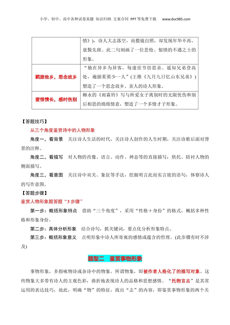 小学、初中、高中各种试卷真题知识归纳文案合同PPT等免费下载www.doc985.com第七章古代歌诗鉴赏歌形象鉴赏诗所谓形象就是主观情意和外在物象融合的结晶,是浸润着作者浓郁主观情感的意象。对于叙事诗而言,诗中的“人”和“事”是形象;对于写景诗、状物诗而言,诗中的“景”和“物”是形象;对于抒情诗而言,诗中的“抒情主人公”是形象。近年来从考查题型来看,高考主要从以下三大角度命题:人物形象鉴赏、事物形象鉴赏、景物形象鉴赏。题型一鉴赏人物形象诗歌中的人物形象有两类。一类是主人公形象,即诗歌中塑造的人物形象。如《氓》刻画了勤劳善良而又清醒刚烈的女主人公形象。王昌龄的《出塞》塑造了戍边战士忠心报国、献身边塞的形象。另一类是诗人形象。诗人“我”的形象也就是抒情主人公的形象,实际上小学、初中、高中各种试卷真题知识归纳文案合同PPT等免费下载www.doc985.com是“诗化了的作者”,是作者在诗中的“代言人”。古典诗歌中的人物形象一般不如小说中的形象丰满、完整,对其描绘可以是一个神态、一个笑容、一个动作、一个微妙的心理变化,或者一组人物的语言、声音,或是一个典型的细节,等等。这些形象往往以片断的形式表现出来,需要读者用自己的联想和想象去进一步补充。教材古代诗歌中常见的九类人物形象形象类型举例分析忧国忧民,心系社稷“国破山河在,城春草木深”(杜甫《春望》)描写了一片萧条的景象,展现了诗人忧国忧民、心系社稷的形象。历经磨难,坚持追求“亦余心之所善兮,虽九死其犹未悔”“虽体解吾犹未变兮,岂余心之可惩”(屈原《离骚》)展现诗人不愿同流合污、执着追求真理的志士形象。胸怀宽广,豪放洒脱“莫听穿林打叶声,何妨吟啸且徐行。竹杖芒鞋轻胜马,谁怕?一蓑烟雨任平生”(苏轼《定风波》)让我们看到一个在风雨中拄着竹杖、穿着草鞋、吟啸徐行、豪放洒脱的词人形象。征战沙场,保家卫国“大漠风尘日色昏,红旗半卷出辕门。前军夜战洮河北,已报生擒吐谷浑”[王昌龄《从军行七首(其五)》]中我们仿佛看到了一群英勇作战的战士们,即使战争的艰辛与磨难,也不能改变他们保家卫国的雄心壮志。寄情山水,热爱田园“晨兴理荒秽,带月荷锄归”[陶渊明《归园田居(其三)》],表现了一个归隐田园、从事农耕、热爱田园生活的诗人形象。藐视权贵,傲岸不羁“安能摧眉折腰事权贵,使我不得开心颜”(李白《梦游天姥吟留别》),表现了诗人淡泊名利、傲视权贵的品质,也反映了诗人傲岸不羁、豪放洒脱的性格。怀才不遇,壮志难酬“塞上长城空自许,镜中衰鬓已先斑”(陆游《书小学、初中、高中各种试卷真题知识归纳文案合同PPT等免费下载www.doc985.com愤》),诗人大志落空,而揽镜自照,却发现年华不再,衰鬓先斑。此二句刻画了一位悲怆、郁愤的不遇之士的形象。羁旅他乡,思念故乡“独在异乡为异客,每逢佳节倍思亲。遥知兄弟登高处,遍插茱萸少一人”(王维《九月九日忆山东兄弟》)塑造了一个思念故乡、亲人的诗人形象。爱恨情长,感时伤别柳永的《雨霖铃》写与所爱女子离别时的无限忧伤和别后相思的绵绵情意,塑造了一个多情才子形象。【答题技巧】从三个角度鉴赏诗中的人物形象角度一,看背景关注诗人生活的时代,关注诗人创作的人生时期,关注诗歌后面对背景的注释。角度二,看描写对人物的肖像、语言、动作、神态等的直接描写;烘托、陪衬人物的侧面描写。角度三,看意图关注诗中双关、象征等手法,挖掘明言此而实言彼的语句,体察诗人的写作意图。【答题步骤】鉴赏人物形象题答题“3步骤”第一步:概括形象特点借助“三个角度”,采用“性格+身份”的格式,概括多种性格和形象身份。第二步:具体分析形象结合诗句,抓关键词,要点化分析形象特点。第三步:概括形象意义点明形象中诗人所寄寓的感情或蕴含的哲理。(此步骤有时不涉及)题型二鉴赏事物形象事物形象,多指咏物诗或杂诗中的物象。所谓物象,即被作者人格化了的描写对象。这些物象大多带有诗人的主观色彩,曲折地表现诗人的品格和思想感情。“托物言志”是其常运用的表达技巧,故此,明确“物”的特征,找出“志”的内容,即鉴赏事物形象的两个关小学、初中、高中各种试卷真题知...