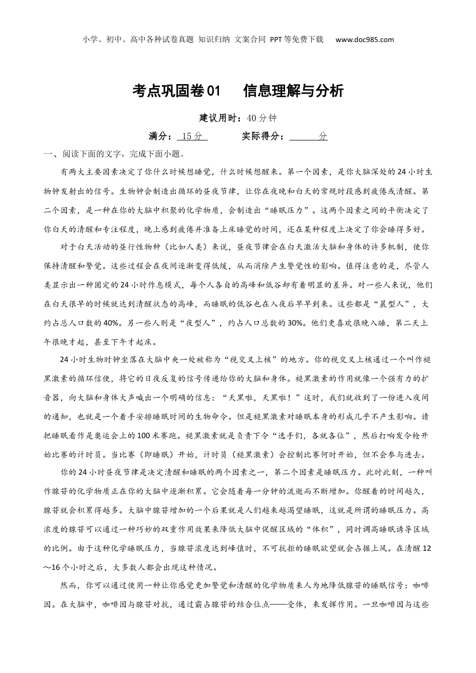 小学、初中、高中各种试卷真题知识归纳文案合同PPT等免费下载www.doc985.com考点巩固卷01信息理解与分析建议用时:40分钟满分:15分实际得分:分一、阅读下面的文字,完成下面小题。有两大主要因素决定了你什么时候想睡觉,什么时候想醒来。第一个因素,是你大脑深处的24小时生物钟发射出的信号。生物钟会制造出循环的昼夜节律,让你在夜晚和白天的常规时段感到疲倦或清醒。第二个因素,是一种在你的大脑中积聚的化学物质,会制造出“睡眠压力”。这两个因素之间的平衡决定了你白天的清醒和专注程度,晚上感到疲倦并准备上床睡觉的时间,还在某种程度上决定了你会睡得多好。对于白天活动的昼行性物种(比如人类)来说,昼夜节律会在白天激活大脑和身体的许多机制,使你保持清醒和警觉。这些过程会在夜间逐渐变得低缓,从而消除产生警觉性的影响。值得注意的是,尽管人类显示出一种固定的24小时作息模式,每个人各自的高峰和低谷却有着明显的差异。对一些人来说,他们在白天很早的时候就达到清醒状态的高峰,而睡眠的低谷也在入夜后早早到来。这些都是“晨型人”,大约占总人口数的40%。另一些人则是“夜型人”,约占人口总数的30%。他们更喜欢很晚入睡,第二天上午很晚才起,甚至下午才起床。24小时生物时钟坐落在大脑中央一处被称为“视交叉上核”的地方。你的视交叉上核通过一个叫作褪黑激素的循环信使,将它的日夜反复的信号传递给你的大脑和身体。褪黑激素的作用就像一个强有力的扩音器,向大脑和身体大声喊出一个明确的信息:“天黑啦,天黑啦!”这时,我们就收到了一份进入夜间的通知,也就是一个着手安排睡眠时间的生物命令。但是褪黑激素对睡眠本身的形成几乎不产生影响。请把睡眠看作是奥运会上的100米赛跑。褪黑激素就是负责下令“选手们,各就各位”,然后打响发令枪开始比赛的计时员。当比赛(即睡眠)开始,计时员(褪黑激素)会控制比赛何时开始,但不会参与进去。你的24小时昼夜节律是决定清醒和睡眠的两个因素之一,第二个因素是睡眠压力。此时此刻,一种叫作腺苷的化学物质正在你的大脑中逐渐积累。它会随着每一分钟的流逝而不断增加。你醒着的时间越久,腺苷就会积累得越多。大脑中腺苷增加的一个后果就是人们越来越渴望睡眠,这就是所谓的睡眠压力。高浓度的腺苷可以通过一种巧妙的双重作用效果来降低大脑中促醒区域的“体积”,同时调高睡眠诱导区域的比例。由于这种化学睡眠压力,当腺苷浓度达到峰值时,不可抗拒的睡眠欲望就会占据上风。在清醒12~16个小时之后,大多数人都会出现这种情况。然而,你可以通过使用一种让你感觉更加警觉和清醒的化学物质来人为地降低腺苷的睡眠信号:咖啡因。在大脑中,咖啡因与腺苷对抗,通过霸占腺苷的结合位点——受体,来发挥作用。一旦咖啡因与这些小学、初中、高中各种试卷真题知识归纳文案合同PPT等免费下载www.doc985.com受体结合,它并不会像腺苷那样刺激受体来使你产生困意。相反,它会阻塞并有效地抑制受体,起到掩蔽剂的作用。这就相当于用手指堵住耳朵来隔绝声音。通过胁迫和占据这些受体,咖啡因阻断了腺苷向大脑正常传递的困觉信号。结果是:尽管腺苷水平高到正常情况下足以让你入睡,咖啡因还是会诱使你感觉十分清醒。如果你想通过喝咖啡在深夜保持清醒,那么等到肝脏清除掉你体内所有的咖啡因之后,你就要准备好接受一个恼人的后果,即人们常说的“咖啡因崩溃”现象。就像一个玩具机器人的电量耗尽一样,你的精力水平会直线下降。你会觉得很难再去集中精力工作,并再一次陷入强烈的睡意中。暂时不考虑咖啡因,你也许会认为调节睡眠的两种主导力量——视交叉上核的24小时昼夜节律和腺苷产生的睡眠压力信号——会相互交流来将它们的影响联合起来。事实上,并不会。它们是两个截然不同、相互独立的系统,并不知道对方的存在。它们不会结合,不过,它们通常处于统一战线。现在,让我们来一起看看这有趣的过程。图1调节睡眠和清醒的两个因素图1从左到右囊括了48小时的时间——两个白天和两个夜晚。图中的虚线是昼夜节律,称为过程C。它就像正弦波一样,有规律、重复性地先上升再下降,然后再一次上升和下降。从最...