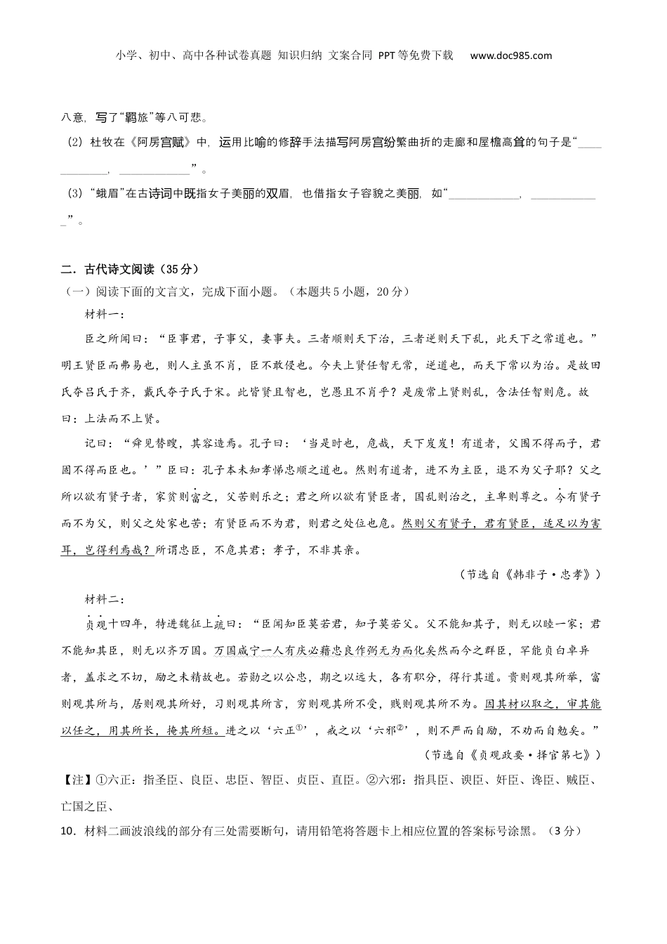 小学、初中、高中各种试卷真题知识归纳文案合同PPT等免费下载www.doc985.com阶段性检测卷02古代诗文阅读建议用时:90分钟满分:105分实际得分:分一.古代诗文阅读(35分)(一)文言文阅读(本题共5小题,20分)阅读下面文言文,完成10~14题。淮阴侯韩信者,淮阴人也,始为布衣时,贫无行,不得推择为吏。又不能治生商贾,常从人寄食饮,人多厌之者。常数从其下乡南昌亭长寄食,数月。亭长妻患之,乃晨炊蓐食①食时信往,不为具食。信亦知其意,怒,竟绝去。信钓于城下,诸母漂②。有一母见信饥,饭信,竟漂数十日。信喜,谓漂母曰:“吾必有以重报母。”母怒曰:“大丈夫不能自食,吾哀王孙而进食,岂望报乎!”淮阴屠中少年有侮信者,曰:“若虽长大,好带刀剑,中情怯耳。”众辱之曰信能死刺我不能死出我胯下于是信孰视之俯出胯下蒲伏③。一市人皆笑信,以为怯……汉王之困固陵,用张良计,召齐王④信,遂将兵会垓下。项羽已破,高祖袭夺齐王军。汉五年正月,徙齐王信为楚王,都下邳。信之国,召所从食漂母,赐千金。及下乡南昌亭长,赐百钱,曰:“公小人也,为德不卒,”召辱已之少年令出胯下者,以为楚中尉。告诸将相曰:“此壮士也。方辱我时,我宁不能杀之邪?杀之无名,故忍而就于此。”(节选自《史记·淮阴侯列传》)【注】①蓐食:在睡觉时用的草垫子上吃饭。②漂:漂洗衣服。③蒲伏:通“匍匐”,在地上爬行。④齐王,破楚之前,韩信灭齐,被封齐王。10.下列对文中画波浪线部分的断句,正确的一项是()(3分)A.众辱之曰/信能死刺我/不能死出/我胯下于是/信孰视之俯出/胯下蒲伏/B.众辱之曰/信能死/刺我/不能死/出我胯下/于是信孰视之/俯出胯下/浦伏/C.众辱之曰/信能死刺我/不能死/出我胯下于是/信孰视之俯出/胯下蒲伏/D.众辱之曰/信能死/刺我不能死出/我胯下/于是信孰视之/俯出跨下/蒲伏/11.下列对文中加点词语的相关内容的解说,不正确的一项是()(3分)A.侯,爵位名,是古代帝王对贵戚或功臣的封赐名号之一,传统五等爵位的第二等。B.布衣,借指平民。富贵人家穿绸煅,平民穿麻、葛织物;后也称没有做官的读书人。C.高祖,刘邦的年号。年号是中国封建王朝用来纪年的一种名号,始自汉高祖。D.国,本义指疆域,引申指地区、区域,又指分封的诸侯国或国都,后泛指国家。12.下列对原文有关内容的概括和分析,不正确的一项是()(3分)A.韩信家境贫寒,当初为平民时,一连数月在南昌亭长家寄食,被亭长妻子赶了出来。B.韩信知恩图报。他尽管穷困潦倒,但对多日赐饭的漂母,仍表示将来要重重地报答。C.韩信能屈能伸。面对“屠中少年”的挑衅、侮辱,能够审时度势,隐忍不发,委曲求全。小学、初中、高中各种试卷真题知识归纳文案合同PPT等免费下载www.doc985.comD.韩信恩怨分明。发达后,召见当年给他饭吃的漂母,赏赐千金;而只给了南昌亭长百钱。13.把下列句子翻译成现代汉语。(8分)(1)召辱己之少年令出胯下者,以为楚中尉。(2)相与枕藉乎舟中,不知东方之既白。14.韩信为什么没有惩治那个曾经侮辱过自己的“屠中少年”,反倒给他封了官?请简要说明。(3分)(二)古代诗歌阅读(本题共2小题,9分)阅读下面两首诗,完成下面小题。忆菊【注】怅望西风抱闷思,蓼红苇白断肠时。空篱旧圃秋无迹,瘦月清霜梦有知。念念心随归雁远,寥寥坐听晚砧痴。谁怜我为黄花病,慰语重阳会有期。咏菊无赖诗魔昏晓侵,绕篱欹石自沉音。毫端蕴秀临霜写,口齿噙香对月吟。满纸自怜题素怨,片言谁解诉秋心?一从陶今平章后,千古高风说到今。【注】《红楼梦》第三十八回,“海棠诗社”举行了第二次活动,由史湘云和薛宝钗拟定十二道题目,宝玉、黛玉、宝钗、湘云、探春等五人自由选题作诗。这两首诗分别出自宝钗和黛玉。15.下列对这两首诗的理解和赏析,不正确的一项是(3分)A.《忆菊》颈联营造出壮阔辽远的意境,表现出思妇对远方亲人的思念之情。B.《咏菊》首联“昏晓侵”“自沉音”把为诗情所困、急需表达的形象刻画得淋漓尽致。C.《忆菊》尾联言诗人思念菊花成疾,只好自我安慰:来年重阳节,再次与菊相逢。D.《咏菊》颈联对仗工整,“自怜”“谁解”...