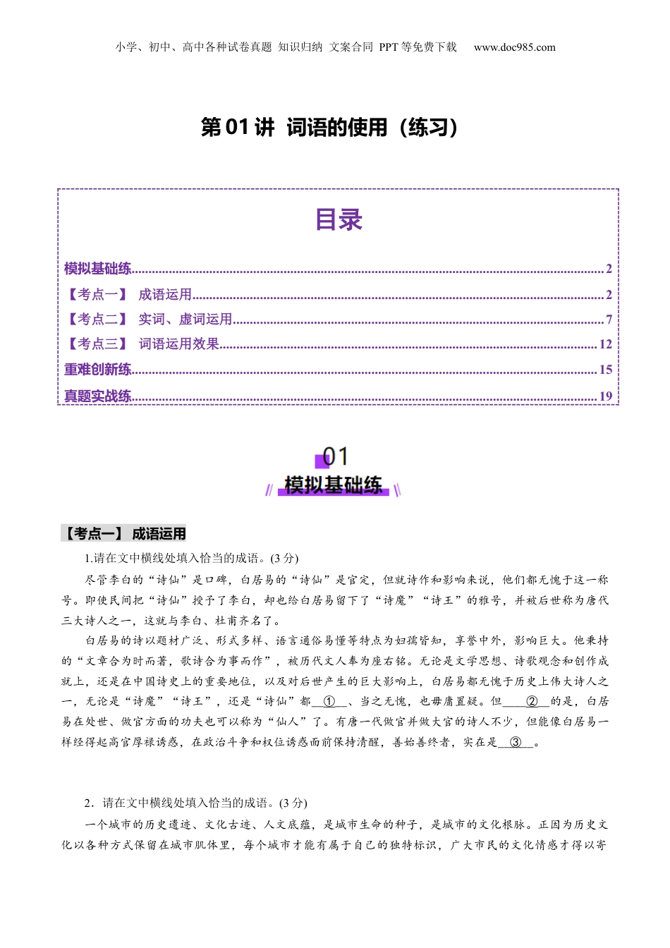 小学、初中、高中各种试卷真题知识归纳文案合同PPT等免费下载www.doc985.com第01讲词语的使用(练习)【考点一】成语运用1.请在文中横线处填入恰当的成语。(3分)尽管李白的“诗仙”是口碑,白居易的“诗仙”是官定,但就诗作和影响来说,他们都无愧于这一称号。即使民间把“诗仙”授予了李白,却也给白居易留下了“诗魔”“诗王”的雅号,并被后世称为唐代三大诗人之一,这就与李白、杜甫齐名了。白居易的诗以题材广泛、形式多样、语言通俗易懂等特点为妇孺皆知,享誉中外,影响巨大。他秉持的“文章合为时而著,歌诗合为事而作”,被历代文人奉为座右铭。无论是文学思想、诗歌观念和创作成就上,还是在中国诗史上的重要地位,以及对后世产生的巨大影响上,白居易都无愧于历史上伟大诗人之一,无论是“诗魔”“诗王”,还是“诗仙”都__①__、当之无愧,也毋庸置疑。但____②__的是,白居易在处世、做官方面的功夫也可以称为“仙人”了。有唐一代做官并做大官的诗人不少,但能像白居易一样经得起高官厚禄诱惑,在政治斗争和权位诱惑面前保持清醒,善始善终者,实在是__③__。2.请在文中横线处填入恰当的成语。(3分)一个城市的历史遗迹、文化古迹、人文底蕴,是城市生命的种子,是城市的文化根脉。正因为历史文化以各种方式保留在城市肌体里,每个城市才能有属于自己的独特标识,广大市民的文化情感才得以寄目录模拟基础练............................................................................................................................................2【考点一】成语运用..........................................................................................................................2【考点二】实词、虚词运用..............................................................................................................7【考点三】词语运用效果................................................................................................................12重难创新练..........................................................................................................................................15真题实战练..........................................................................................................................................19小学、初中、高中各种试卷真题知识归纳文案合同PPT等免费下载www.doc985.com托。在城市建设发展过程中,不可避免地会涉及城市中的历史文化遗产,一方面是城市发展的需要,另一方面是历史文化保护的责任,如何__①__地处理好二者的关系,考验城市管理者的智慧和担当。城市的建设与保护,并不是__②__的关系。妥善保护好城市中的历史文化遗产,关键在于理念的更新,不能盲目拆除,也不必圈禁封闭,完全可以探索出一条保护与利用并行不悖的路径。比如,上海小里弄、石库门和老弄堂等特色建筑__③__地修旧如旧,既守住了历史文化,也不妨碍居民的正常生活和城市功能,历史文化遗产得以持续活化利用,并完美融入了现代城市功能,为历史文化遗产保护开启新的维度。3.阅读下面的文字,完成后面的题目。(3分)在一片翠绿之间,星罗棋布地点缀着一块金黄的色彩,颜色稍微跳脱,但并不显得突兀。这便是山里的麦田。山里不比平地,没有广袤的__①__的土地,也没有如黑土地般膏腴的土壤,不过勤劳的山里人总能用他们的智慧去创造出耕地。一次次挥锄,一次次弯腰,一趟趟担肥,他们清除荒草,拣尽石块,让原本硬结的土地变得松软、肥沃。于是,山间就有了耕田。一块块、一洼洼、一行行,大的能顶上两个篮球场,最小的还不过三五尺见方。因为只能依据地势而开垦,它们的形状也各不相同,有长方形的,有圆形的,更多的是叫不出名字的不规则图形,几乎没有方方正正的标准的农田。进入五月,麦穗开始泛黄,麦芒恣意,被包裹着的麦粒开始膨胀、饱满,麦秆弯曲,就像满载而归的乡亲们,手捧着沉甸甸的喜悦。初夏的风一起,它们便欢腾起来,笑得__②__。一株麦穗倒...