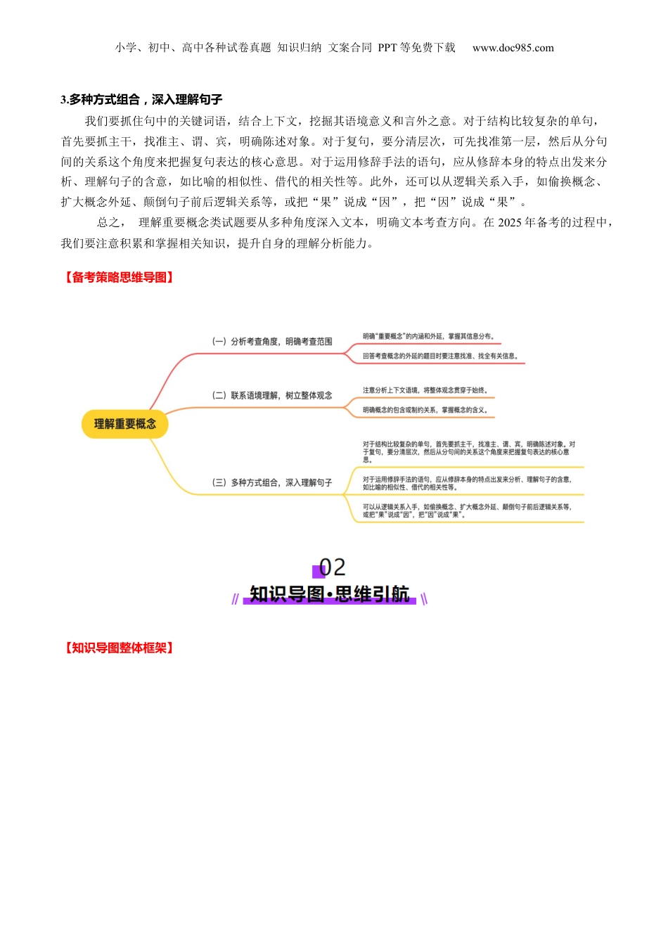 小学、初中、高中各种试卷真题知识归纳文案合同PPT等免费下载www.doc985.com第05讲理解重要概念目录01考情分析·备考策略...............................................................................................................................................102知识导图·思维引航...............................................................................................................................................203考点突破·考法探究...............................................................................................................................................604真题感悟·命题洞见.............................................................................................................................................10【考点考情分析】【备考策略】1.分析考查角度,明确考查范围“重要概念”有内涵和外延之分,概念的内涵是指事物的本质属性,信息一般集中在文中的某一段落或层次,有比较具体的解释说明。概念的外延是指事物的外部特征,表现在各个方面,信息也分散在原文不同的段落或层次。回答考查概念的外延的题目时要注意找准、找全有关信息。2.联系语境理解,树立整体观念在具体解答的过程中,我们要注意分析上下文语境,将整体观念贯穿于始终,明确概念的包含或制约关系,掌握概念的含义。小学、初中、高中各种试卷真题知识归纳文案合同PPT等免费下载www.doc985.com3.多种方式组合,深入理解句子我们要抓住句中的关键词语,结合上下文,挖掘其语境意义和言外之意。对于结构比较复杂的单句,首先要抓主干,找准主、谓、宾,明确陈述对象。对于复句,要分清层次,可先找准第一层,然后从分句间的关系这个角度来把握复句表达的核心意思。对于运用修辞手法的语句,应从修辞本身的特点出发来分析、理解句子的含意,如比喻的相似性、借代的相关性等。此外,还可以从逻辑关系入手,如偷换概念、扩大概念外延、颠倒句子前后逻辑关系等,或把“果”说成“因”,把“因”说成“果”。总之,理解重要概念类试题要从多种角度深入文本,明确文本考查方向。在2025年备考的过程中,我们要注意积累和掌握相关知识,提升自身的理解分析能力。【备考策略思维导图】【知识导图整体框架】小学、初中、高中各种试卷真题知识归纳文案合同PPT等免费下载www.doc985.com【主要考法归纳】理解重要概念部分主要有两个细化设题角度,分别是理解重要词语和重要句子。在解答的过程中,对于词语作用,我们要关注表意和深意;而对于句子作用,我们则要关注文本中的核心句、关键句等。【设误类型及辨误方法】论述类文本阅读题的三道选择题,大多要求选“非”,即选出设误项。下面介绍一下论述类文本阅读题设误的选项中常见的几类命题陷阱。小学、初中、高中各种试卷真题知识归纳文案合同PPT等免费下载www.doc985.com论述类文本阅读题题型相当稳定,全是选择题,要求考生根据材料,选出符合(或不符合)原文意思(或题干要求)的选项。而这些选择题的选项一般不会抄录原文语句,而是对原文语句或文中涉及的观点态度进行一番改造,改造有“删”“添”“调”“改”“漏”“凑”。经过这些方式改造出来的选项,有的改变了原文的意思,有的没有改变原文的意思,而改变了原文的意思的选项就是“不正确的一项”小学、初中、高中各种试卷真题知识归纳文案合同PPT等免费下载www.doc985.com删(删减):删除原文的定语、状语、补语成分,从而改变原意。添(添加):添加定语、状语、中心语或其他词语,造成概念偷换或文意曲解。调(调换):调换词序、语序,造成逻辑错误,改变句意;调换表述的对象、时间,造成时态混乱等现象。改(改变):改换词语(名词、代词、副词、关联词等),导致曲解文意。漏(遗漏):看似保留原文词句,但暗中漏掉了重要信息,具有较大迷惑性。凑(拼凑):将意义有关或无关的几个词语(句子)凑在一起造成错误。【重要概念“两个区别”】(1)“正确”与“最准确”的区别。如果题干中出现了“正确(不正确)”这一要求,那么...