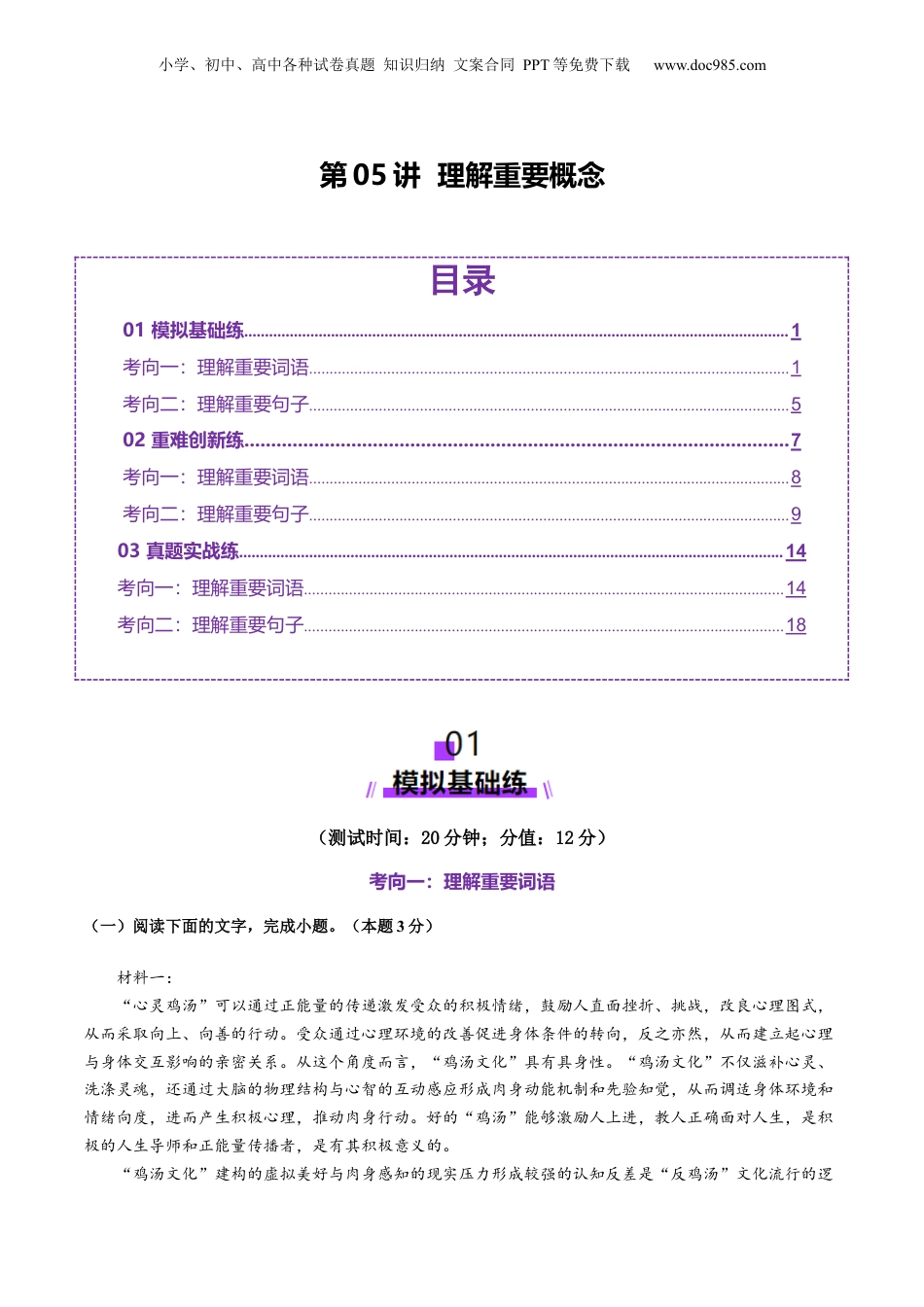 小学、初中、高中各种试卷真题知识归纳文案合同PPT等免费下载www.doc985.com第05讲理解重要概念目录01模拟基础练....................................................................................................................................1考向一:理解重要词语.....................................................................................................................1考向二:理解重要句子.....................................................................................................................502重难创新练......................................................................................................7考向一:理解重要词语.....................................................................................................................8考向二:理解重要句子.....................................................................................................................903真题实战练....................................................................................................................................14考向一:理解重要词语.....................................................................................................................14考向二:理解重要句子.....................................................................................................................18(测试时间:20分钟;分值:12分)考向一:理解重要词语(一)阅读下面的文字,完成小题。(本题3分)材料一:“心灵鸡汤”可以通过正能量的传递激发受众的积极情绪,鼓励人直面挫折、挑战,改良心理图式,从而采取向上、向善的行动。受众通过心理环境的改善促进身体条件的转向,反之亦然,从而建立起心理与身体交互影响的亲密关系。从这个角度而言,“鸡汤文化”具有具身性。“鸡汤文化”不仅滋补心灵、洗涤灵魂,还通过大脑的物理结构与心智的互动感应形成肉身动能机制和先验知觉,从而调适身体环境和情绪向度,进而产生积极心理,推动肉身行动。好的“鸡汤”能够激励人上进,教人正确面对人生,是积极的人生导师和正能量传播者,是有其积极意义的。“鸡汤文化”建构的虚拟美好与肉身感知的现实压力形成较强的认知反差是“反鸡汤”文化流行的逻小学、初中、高中各种试卷真题知识归纳文案合同PPT等免费下载www.doc985.com辑起点。“心灵鸡汤”书写的美好故事,提炼的哲理慧语,是他者的体会与认知,而青少年具身认知源于对日常生活的体察与感悟。时空转向与急功近利带来的压力与焦虑,驱动着他们在移动场域寻找减压或释放情绪的话语表达。“反鸡汤”大都是部分年轻网民在日常生活场域的细微感受与社会结构性现实之间紧张关系的一种戏谑化的表达。“反鸡汤”通过对鸡汤话语的改造与创异,采用逃避策略矮化主体性,否定正能量叙事和理想主义,建构灰色空朦的心灵世界,达到情感宣泄的目的。“心灵鸡汤”的浅表意蕴易成为“反鸡汤”嘲弄反讽现实的由头或者铺垫。“心灵鸡汤”缺乏深厚的逻辑基础、文化底蕴以及实质性的指导和具体的方法。“反鸡汤”代言人马薇薇认为:“心灵鸡汤的特质是给你立志,但是不给你操作方案。没有逻辑的正能量就是负能量。”比如,“假如生活欺骗了你,不要悲伤,不要心急,反正明天也一样。”挪用鸡汤语式反映无力、无奈的社会现实;一些自媒体或者商业机构的公众号批量生产的鸡汤文受商业主义和功利主义的影响,一味追求流量,而缺乏实际助力。凡此种种,让一些受众产生反感和厌恶,“反鸡汤”遂成为“逆意公众"进行抵抗、调侃、嘲笑的话语武器。“反鸡汤”是具有相同或者相近价值观的群体挪用鸡汤文的语式、修辞或语境建构一套观念反转、情绪灰暗、抵抗主流的话语模式。与“心灵鸡汤”一样,“反鸡汤”话语也是刻意制造的情感文本。在传统媒体难以栖身的“反鸡汤”通过文字、图片、视频、音频、弹幕、直播等多模态话语在网络...