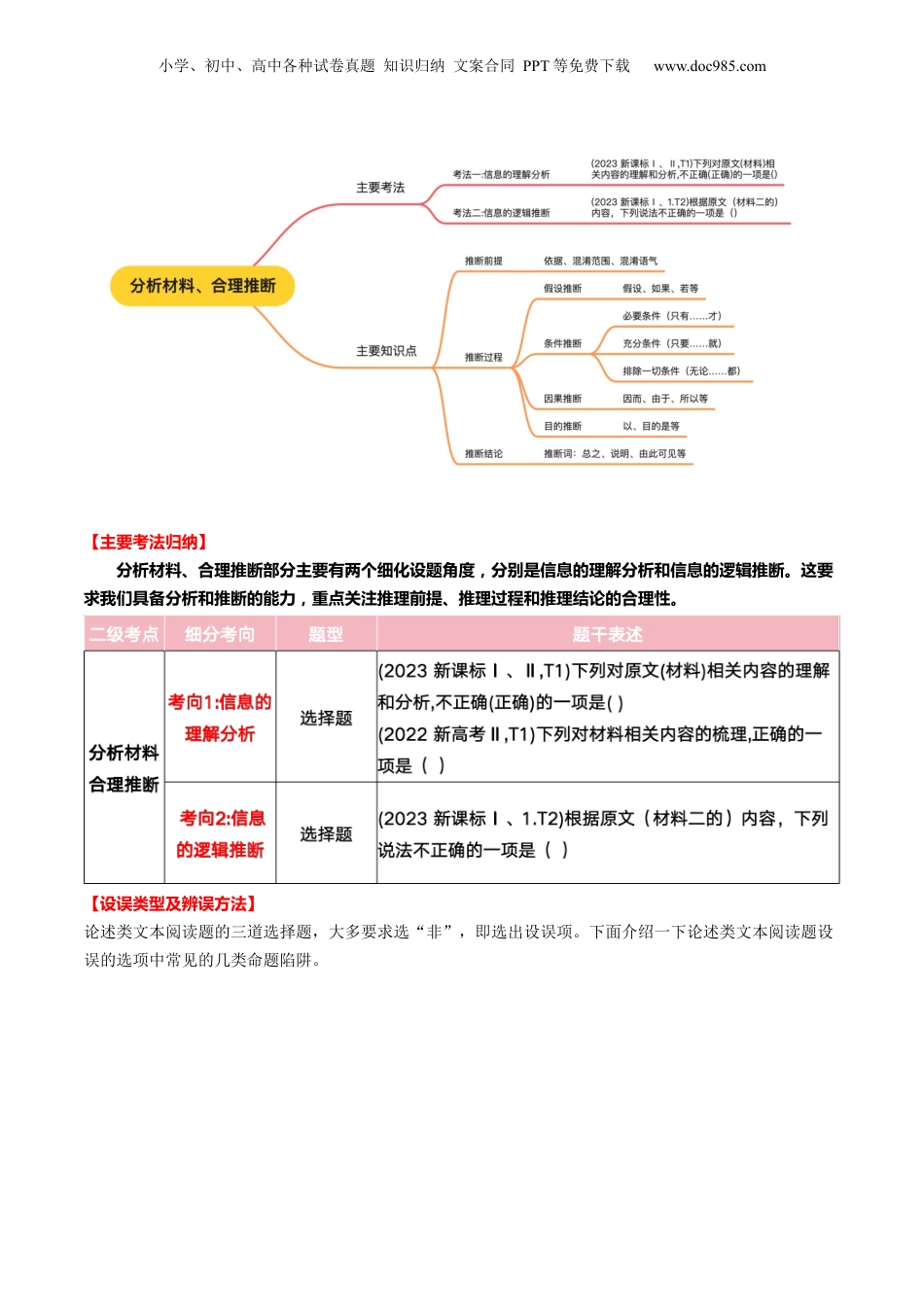 小学、初中、高中各种试卷真题知识归纳文案合同PPT等免费下载www.doc985.com第02讲分析材料、合理推断目录01考情分析·备考策略...............................................................................................................................................102知识导图·思维引航...............................................................................................................................................203考点突破·考法探究...............................................................................................................................................704真题感悟·命题洞见..............................................................................................................................................11【考点考情分析】【备考策略】1.关注现实生活,明确考点考法分析材料、合理推断考点不仅有对文本信息的理解分析,还有基于现实生活的信息逻辑推断。我们在学习的过程中,应重点积累现实生活中的相关例子,熟悉考点的出题规律,提升自身应试能力。2.分析前提结论,强化逻辑意识小学、初中、高中各种试卷真题知识归纳文案合同PPT等免费下载www.doc985.com在解答分析材料、合理推断类试题过程中,我们要重点关注推断的前提和结论,分析它们推断是否有根据,结论是否合理。除此之外,更应该关注推断过程中的逻辑推断,例如:假设推断、条件推断、因果推断以及目的推断等。通过强化自身的逻辑意识,提升做题效率。3.组合训练,提升答题应试能力相比较信息筛选、整合、辨析类试题来说,分析材料、合理推断类试题需要考虑的因素更多,难度也相应更大。我们在备考的过程中,可以通过限时练、题型组合练习的方式,提升答题应试手感和能力。总之,分析材料、合理推断类试题难度较大,需要同学们在掌握基础知识的基础上,关注现实生活条件,强化语文逻辑思维意识。通过不断组合练习,提升自身答题应试能力,为解答2025年高考分析材料、合理推断类试题打下坚实的基础。【备考策略思维导图】【知识导图整体框架】小学、初中、高中各种试卷真题知识归纳文案合同PPT等免费下载www.doc985.com【主要考法归纳】分析材料、合理推断部分主要有两个细化设题角度,分别是信息的理解分析和信息的逻辑推断。这要求我们具备分析和推断的能力,重点关注推理前提、推理过程和推理结论的合理性。【设误类型及辨误方法】论述类文本阅读题的三道选择题,大多要求选“非”,即选出设误项。下面介绍一下论述类文本阅读题设误的选项中常见的几类命题陷阱。小学、初中、高中各种试卷真题知识归纳文案合同PPT等免费下载www.doc985.com论述类文本阅读题题型相当稳定,全是选择题,要求考生根据材料,选出符合(或不符合)原文意思(或题干要求)的选项。而这些选择题的选项一般不会抄录原文语句,而是对原文语句或文中涉及的观点态度进行一番改造,改造有“删”“添”“调”“改”“漏”“凑”。经过这些方式改造出来的选项,有的改变了原文的意思,有的没有改变原文的意思,而改变了原文的意思的选项就是“不正确的一项”小学、初中、高中各种试卷真题知识归纳文案合同PPT等免费下载www.doc985.com删(删减):删除原文的定语、状语、补语成分,从而改变原意。添(添加):添加定语、状语、中心语或其他词语,造成概念偷换或文意曲解。调(调换):调换词序、语序,造成逻辑错误,改变句意;调换表述的对象、时间,造成时态混乱等现象。改(改变):改换词语(名词、代词、副词、关联词等),导致曲解文意。漏(遗漏):看似保留原文词句,但暗中漏掉了重要信息,具有较大迷惑性。凑(拼凑):将意义有关或无关的几个词语(句子)凑在一起造成错误。【推断三原则分析】一、分析推断前提是否有据不论选项呈现形式如何,考查的实质是推断,因此判断选项是否正确,要根据推断的前提、结论、推断过程,做好“三分析”【内涵解读】分析推断前提是否有据,就是分析前提是否合乎文本内容,也就是作为推断的依据与原文内容是否一致。【...