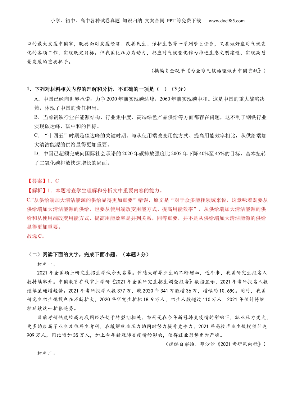 小学、初中、高中各种试卷真题知识归纳文案合同PPT等免费下载www.doc985.com第02讲分析材料、合理推断目录01模拟基础练....................................................................................................................................1考向一:信息的理解分析................................................................................................................1考向二:信息的逻辑推断................................................................................................................802重难创新练......................................................................................................12考向一:信息的理解分析................................................................................................................12考向二:信息的逻辑推断................................................................................................................1603真题实战练....................................................................................................................................22考向一:信息的理解分析................................................................................................................22考向二:信息的逻辑推断................................................................................................................24(测试时间:20分钟;分值:15分)考向一:信息的理解分析(一)阅读下面的文字,完成小题。(本题3分)材料一:力争2030年前实现碳达峰,2060年前实现碳中和,是我国基于推动构建人类命运共同体的责任担当和实现可持续发展的内在要求做出的重大战略决策,也是我国向世界做出的庄严承诺。这不仅表明我国保护环境、应对气候变化的决心,也是在为各行各业的低碳转型明确时间表,谋划路线图。“十四五”时期是碳达峰的关键期、窗口期。对于众多能耗领域来说,这意味着既要从供给端加大清洁能源的供给,也要从使用端改变用能方式、提高用能效率。数据显示,作为电力行业的“能耗大户”,我国制冷用电量占全社会用电量15%以上,大中城市空调用电负荷约占夏季高峰负荷的60%。制造行业的低碳转型,势在必行,更大有可为。制造行业要为碳达峰、碳中和目标做出贡献,很大程度上取决于科技水平的提高和进步,尤其是在核小学、初中、高中各种试卷真题知识归纳文案合同PPT等免费下载www.doc985.com心技术上要实现创新突破。不久前,在全球制冷技术创新大奖赛上,格力电器与清华大学联合团队研发的“零碳源”空调技术,从全球近百个国家2100多支参赛团队中脱颖而出,实现节能85.7%,在大赛中夺冠。据预测,普及这种空调技术,有潜力在2050年前实现累计全球碳减排达1000亿吨,相当于1160亿棵树100年的碳汇量。可以说,构建清洁低碳、安全高效的能源体系,推动绿色低碳技术实现重大突破,加快推广应用减污降碳技术,是走好生态优先、绿色低碳高质量发展道路的题中之义。应对全球气候变化是各国的共同挑战和责任,中国始终是全球生态文明建设重要的参与者、贡献者和引领者。“零碳源”空调技术已服务于全球6000多个项目,成为“中国创造”造福全世界的一个生动写照。这也从侧面说明,在应对气候变化、谋求可持续发展的大背景下,谁能抢占节能减排技术的高地,谁就能在世界竞争中占据优势地位。各行各业当为自身的转型升级谋先机,助推“中国创造”走出国门、走向世界,为全球节能减排、绿色转型贡献更多中国智慧、中国方案、中国力量,发挥中国在全球生态文明建设中的引领作用。(摘编自人民网《科技创新助力碳中和》)材料二:“不要孤立地看待碳达峰、碳中和。”中国工业经济联合会会长李毅中指出,碳达峰、碳中和事关调整优化产业结构、能源结构、产品结构,事关国民经济高质量发展。李毅中的观点在钢铁行业的体现尤为明显。当前能源结构不合理、行业集中度不高、高端绿色产品...