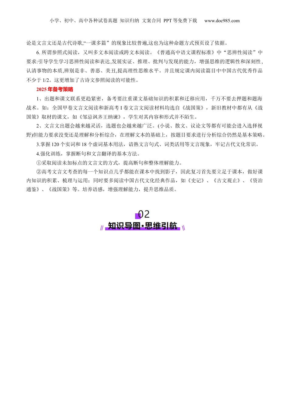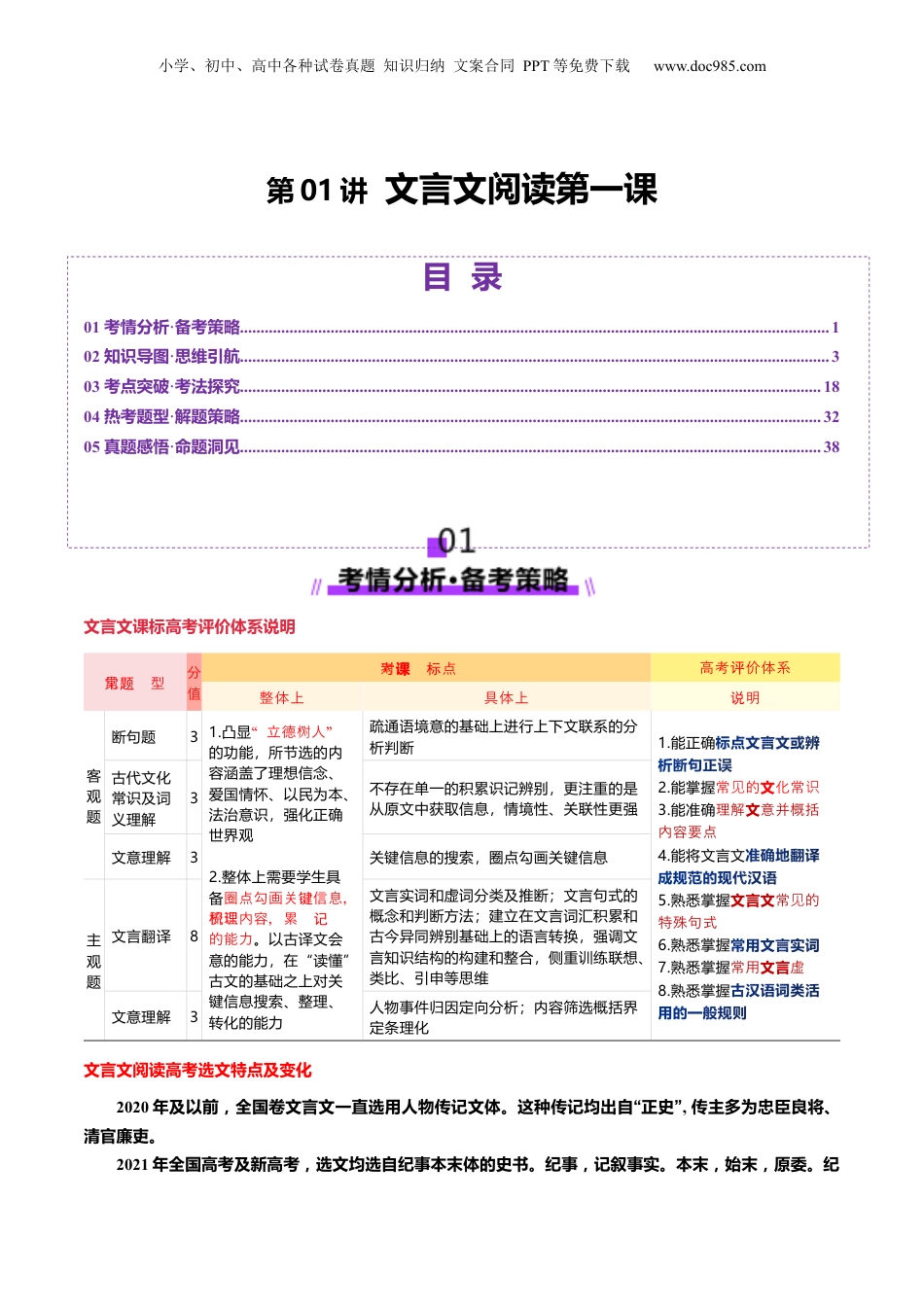小学、初中、高中各种试卷真题知识归纳文案合同PPT等免费下载www.doc985.com第01讲文言文阅读第一课目录01考情分析·备考策略...............................................................................................................................................102知识导图·思维引航...............................................................................................................................................303考点突破·考法探究.............................................................................................................................................1804热考题型·解题策略.............................................................................................................................................3205真题感悟·命题洞见.............................................................................................................................................38文言文课标高考评价体系说明常型题见分值课考点标对应高考价体系评整体上具体上明说客观题断句题31.凸显“立德人树”的功能,所节选的内容涵盖了理想信念、爱国情怀、以民为本、法治意识,强化正确世界观2.整体上需要学生具备圈点勾画关信息,键梳理内容,累记积识的能力。以古译文会意的能力,在“读懂”古文的基础之上对关键信息搜索、整理、转化的能力疏通语境意的基础上进行上下文联系的分析判断1.能正确2.能掌握文常的化常见识3.能准确文理解意并概括内容要点4.能将文言文5.熟悉掌握文言文常的见特殊句式6.熟悉掌握7.熟悉掌握文言常用虚8.熟悉掌握古代文化常识及词义理解3不存在单一的积累识记辨别,更注重的是从原文中获取信息,情境性、关联性更强文意理解3关键信息的搜索,圈点勾画关键信息主观题文言翻译8文言实词和虚词分类及推断;文言句式的概念和判断方法;建立在文言词汇积累和古今异同辨别基础上的语言转换,强调文言知识结构的构建和整合,侧重训练联想、类比、引申等思维文意理解3人物事件归因定向分析;内容筛选概括界定条理化文言文阅读高考选文特点及变化2020年及以前,全国卷文言文一直选用人物传记文体。这种传记均出自“正史”,传主多为忠臣良将、清官廉吏。2021年全国高考及新高考,选文均选自纪事本末体的史书。纪事,记叙事实。本末,始末,原委。纪小学、初中、高中各种试卷真题知识归纳文案合同PPT等免费下载www.doc985.com事本末就是较为完整地记录时间的首尾始终。先将重要的事件分门别类,形成独立的篇章,然后按照时间顺序,详述事件发生的原因、过程和结果。2022年,1卷和甲卷选文均出自《战国策》,2卷出自《东观汉记》(吴汉其人其事,是一部记载东汉光武帝至汉灵帝一段历史的纪传体史书,因官府于东观设馆修史而得名),乙卷出自《说苑》(探讨“德”,又名《新苑》,是汉代刘向所编纂的小说集,记述了一些春秋战国至汉代的遗闻轶事)。出处多样化,体裁多样化。近三年新高考课标卷选材变化卷别体裁出处字数选材变化2023新课标Ⅰ卷先秦子散诸文、记杂《非子韩·难一》和《孔丛子·答》问657于聚焦“赏罚”题,了法问展现和主的以及立家儒家差异两家张的,材料间形成交两料论论驳锋则一种张力(1)文本选材:2023年、2022年于多样化。趋不再像2021年选以叙择事为主的纪事本末论议体,突破了2020年以前从“四史二十”选人物择传记的材方。发取式展多类史书,料至料料杂史小说中选材。2023年出史传范。跳围(2)文言文文本形式由以往单一文本,变成2023年双文本。(3)文本内容侧重议论性。新课标Ⅱ卷事理论、答体著问书兵《战略》百奇和《唐太宗李》公卫问对583前是战史实及战略的者对淝水之记述,后是基于史实及战略的者评,材成料系论关两料构则对话2022新课标Ⅰ卷国别体史书《战国策·魏策三》589解孟君魏尝忧新课标Ⅱ卷纪传体史书《东观汉记》583吴汉忠国的事君迹2021新课标Ⅰ卷纪事本末《通鉴纪事本末·贞观君臣论治》641贞观时期任人唯贤、减赋爱民、反廉...