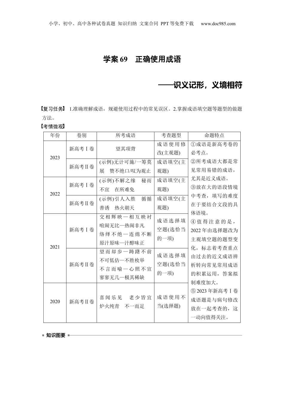 小学、初中、高中各种试卷真题知识归纳文案合同PPT等免费下载www.doc985.com学案69正确使用成语——识义记形,义境相符复习任务1.准确理解成语,规避使用过程中的常见误区。2.掌握成语填空题等题型的做题方法。考情微观年份卷别所考成语考查题型命题特点2023新高考Ⅰ卷望其项背成语使用修改(主观题)①成语是新高考卷的必考点。②所考成语大都是常见常用易错的成语,尤其是近义成语。③放在大的语段情境中考查,填写的难度在于要结合文段的具体语境。④值得注意的是,2022年由选择题改为主观填空题的题型变化,标志着考查重点由过去的近义成语辨析转向常见常用成语的积累运用,答案拟制难度加大。⑤2023年新高考Ⅰ卷成语题是与病句修改放在一起考查的,这一动向值得关注。新高考Ⅱ卷(示例)无计可施/一筹莫展赞不绝口/叹为观止成语填空(主观题)2022新高考Ⅰ卷(示例)不解之缘秘而不宣在所难免成语填空(主观题)新高考Ⅱ卷(示例)引人入胜循循善诱热火朝天成语填空(主观题)2021新高考Ⅰ卷交相辉映—相互映衬喧闹无比—热闹非凡络绎不绝—连绵不断原汁原味—汁醇味正成语选择填空题(选恰当的一项)新高考Ⅱ卷望而却步—踌躇不前不可低估—不胜枚举不言而喻—心照不宣寥寥无几—极其稀缺成语选择填空题(选恰当的一项)2020新高考Ⅱ卷喜闻乐见老少皆宜炉火纯青不一而足成语使用不当(选择题)小学、初中、高中各种试卷真题知识归纳文案合同PPT等免费下载www.doc985.com前备知识——成语及其来源结构一、成语特点成语是指语言中经过长期使用、锤炼而成的固定短语(词组),它是比词大而语法功能又相当于一个词的语言单位。大多由四个字组成。成语具有以下特点:1.意义的整体性。成语的词义往往超出字面,不能望文生义。例如:水落石出、三头六臂、泥牛入海。2.结构的凝固性。一般不能变动词序或更换其中的成分。3.色彩的文言性。保留了文言词和文言的格式。例如:草菅人命(草菅,意动用法)、富国强兵(富、强,使动用法)。4.感情的褒贬性。许多成语蕴含或褒或贬的感情色彩。例如:无所不为(贬)、无微不至(褒)。5.结构的丰富性。从成语的构词方式来看,有主谓结构、动宾结构、并列结构等,形式丰富多样。成语是中华文化的“活化石”,成语中包含着丰富的文化信息和文言现象。读懂成语,有助于学习文言知识,理解中华文化。二、成语来源和结构汉语中成语的来源主要有五个方面:一是神话传说,二是寓言故事,三是历史故事,四是文人作品,五是外来文化。神话传说夸父逐日、精卫填海寓言故事刻舟求剑、狐假虎威历史故事负荆请罪、破釜沉舟文人作品老骥伏枥、青出于蓝外来文化功德无量、火中取栗成语的内部构造比较复杂。从它的结构关系来看,有主谓关系、并列关系、动宾关系、偏正关系、补充关系等。小学、初中、高中各种试卷真题知识归纳文案合同PPT等免费下载www.doc985.com主谓关系人定胜天、脚踏实地并列关系情投意合、三番五次动宾关系平分秋色、大显身手偏正关系世外桃源、一盘散沙补充关系轻于鸿毛、遗臭万年理解小练按照成语的来源和结构两种不同的分类标准,梳理下列成语。三茅不下上兵朝三暮四顾庐耻问纸谈上添花想入非非中流砥柱天衣无锦缝痛改前非无不循蹈矩恨不成战胜规铁钢(1)来源:神话传说寓言故事历史故事文人作品外来文化(2)结构:主谓关系并列关系动宾关系偏正关系补充关系活动一精准理解其义,规避误用类型(一)辨关键语素,避望文生义成语的含义是约定俗成的,而且大多都有一定的典故,加之有些成语中的语素还含有生僻的古义,如果不把成语的确切含义弄清楚,仅从字面上去理解,就极易造成望文生义的错误。请判断下列句子中加点成语的使用是否正确,并作分析。(1)宋朝商品,在安,私旅街而立,非凡,尤其是西湖岸的湖景旅经济发达临营馆临热闹边,密密,令人馆匝匝左右盼顾。答:____________________________________________________________________________________________________________________________________________________小学、初中、高中各种试卷真题知识归纳文案合同PPT等免费下载www.doc985.com__________________________________________________________...