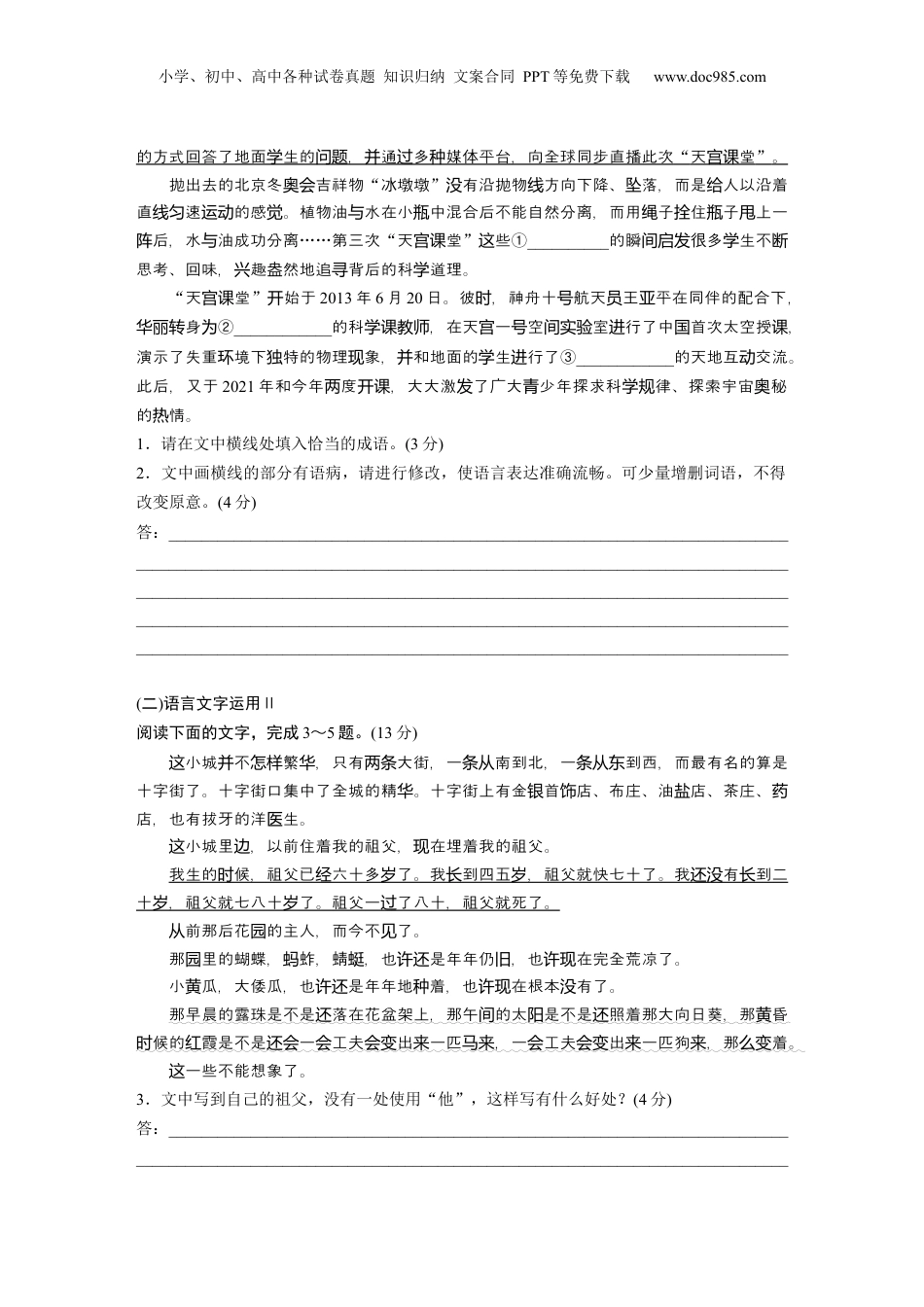 小学、初中、高中各种试卷真题知识归纳文案合同PPT等免费下载www.doc985.com学案67研练两年高考真题(二)——吃透精髓,把握方向复习任务精做2022年新高考卷语用试题,把握高考命题方向和复习策略。课标要求考情表览均见学案66活动一研练2022年新高考Ⅰ卷试题(一)语言文字运用Ⅰ阅读下面的文字,完成1~3题。(11分)科家恩杰年高考考的是机系,因服家安排改自控制,此学栾当时报电为从国学动从与国防和航天事有了业①____________。20世纪60年代,恩杰到第七机械工部工作后的第一重大任就是我潜地栾业参与个务国导弹“巨浪一号”的制,潜地作秘密武器,在美家是研导弹为欧国②____________的防国项目,有料可供借,在有外技援助、自身又缺乏技力量的情下,鲜资鉴没国术术况整按个团队照先在上射台射、再把装射筒以模水下射境、最后行潜艇射的陆发发导弹进发拟发环进发规始了划开“巨浪一号”的制攻。研关三步被这称为“台、筒、艇”,但每一步都失。败过失在航天域的程中是败领研发过③____________的。恩杰究的技到中栾从导弹研术员国探月工程首任指,各各的失,大到火箭里面的特殊装置出,小到一总挥经历过种样败现问题了,个插头插错些失意味着什?意味着多少日夜的辛苦付之一炬,意味着接下的这败么个来工作更加苦卓,意味着在世界的航天格局中可能突然之了道艰绝你间换赛,恩杰:失栾认为也是在我上,一一解的候,成功就在我前面。败给们课当问题决时们1.请在文中横线处填入恰当的成语。(3分)2.请将文中画波浪线的部分改成几个较短的语句。可以改变语序、少量增删词语,但不得改变原意。(4分)答:____________________________________________________________________________________________________________________________________________________________________________________________________________________________________________________________________________________________________________________________3.文中画横线的句子使用了设问和排比的修辞手法,请结合材料简要分析其表达效果。(4分)小学、初中、高中各种试卷真题知识归纳文案合同PPT等免费下载www.doc985.com答:____________________________________________________________________________________________________________________________________________________________________________________________________________________________________________________________________________________________________________________________(二)语言文字运用Ⅱ阅读下面的文字,完成4~5题。(9分)日期,无是家人,是老友聚,节间论团圆还欢“吃”往往是必不可少的。因此,后很节多人增添新的,那就是会烦恼“日肥节”“年肥过”,肥也就提到日程上。事上,减来实生活中你会发现,有多整天着要肥或者正在肥的人,其根本不胖,反而是一些许嚷嚷减减实真正肥的人此却毫不在意。那,判是否需要肥呢?角度,身材应该减对么怎么断减从医学来说是否肥胖,①______________________________。体指是用体重千克除以身高米之质数数数平方而得出的字。人的健康体指数国质数为18.5~23.9,如果低于18.5,就是偏瘦,不需要肥,而高于减23.9,就可以考肥了。虑减提到肥,不少人都之减为“斗奋”,食、跳、步都是常用的肥方法。床中过节绳跑减临,很多人用不吃肥,方式不但以期持,还发现晚饭来减这种难长坚②__________________________,有人就因此得了重的胃病。而且,如果以后恢吃,严复晚饭③__________________________,甚至比以前更胖。不如此,不吃餐,素供不足,蛋白供下降,肌仅晚营养给质应肉量也之少。体重反后,在同的体重下,体脂率反而比肥前更高。因此,会随减弹样会减减肥一定要究科。讲学4.下列句子中的“你”和文中画横线处的“你”,用法相同的一项是(3分)()A.你要觉得这段话对深化文章的主题没什么帮助,就删了吧。B.听了老师的话,三个人你看看我,我看看你,都不吭声了。C.他是个非常用功的同学,尤其是钻研精神叫你不得不佩服。D.请你选三名学生参加今年五...