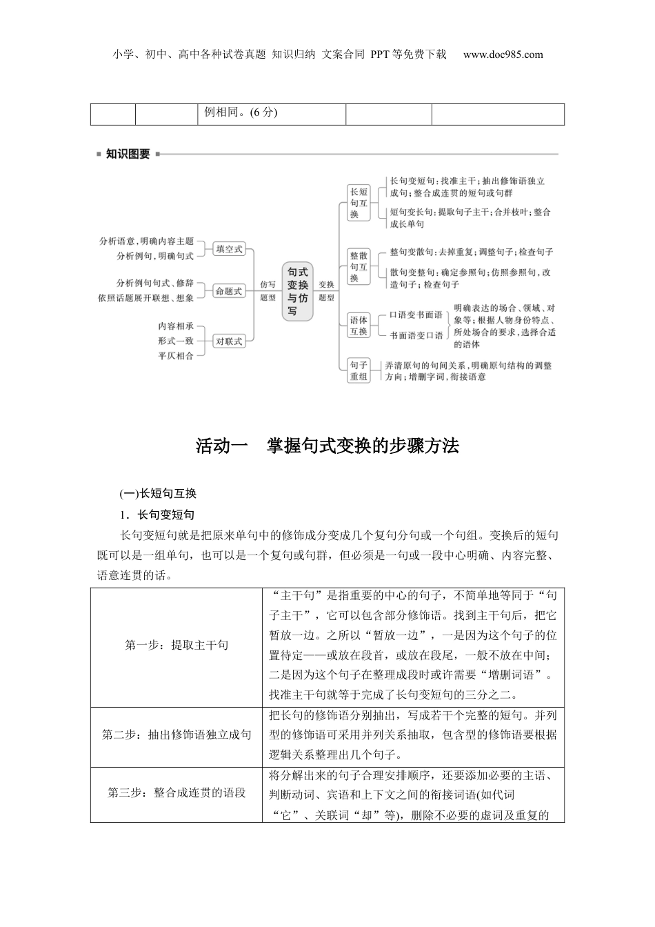 小学、初中、高中各种试卷真题知识归纳文案合同PPT等免费下载www.doc985.com学案78句式变换与句式仿写——变“式”到位,形神兼似复习任务1.掌握句式变换的原则和方法,重点掌握长短句变换。2.掌握句式仿写的要求和方法。考情微观1.句式变换年份卷别提问方式设题角度命题特点2022新高考Ⅰ卷请将文中画波浪线的部分改成几个较短的语句。可以改变语序、少量增删词语,但不得改变原意。(4分)长句变短句①句式变换是高考中的常规考点,已沉寂多年。近两年复出可谓“旧题新考”“老树新花”。虽说是常规考点,但与往常不同的地方在于改写的是镶嵌在一段话中的语句。②近两年考句式变换,考的均是长句变短句,表明长短句变换是一个重点与热点。③句式变换考点虽已复出,但它是一个综合性考点,与压缩语段、句子表达效果等考点题点放在一起综合考查。2021新高考Ⅱ卷文中画波浪线处是个长句,请改成几个较短的语句。可以改变语序、少量增删词语,但不得改变原意。(5分)长句变短句2.句式仿写年份卷别提问方式设题角度命题特点2023全国甲卷请在横线处仿照上句补写恰当的句子,要求内容正确贴切,语意完整连贯。(3分)嵌入式仿写(填空式仿写)①句式仿写是语言表达中的常规考点,近年成为冷考点。②仿写主要是命题式仿写,综合考查句式、修辞等考点。2018全国Ⅱ卷仿照下面的示例,利用所给材料续写三句话,要求内容贴切,句式与所给示命题式仿写(话题式仿写)小学、初中、高中各种试卷真题知识归纳文案合同PPT等免费下载www.doc985.com例相同。(6分)活动一掌握句式变换的步骤方法(一)长短句互换1.长句变短句长句变短句就是把原来单句中的修饰成分变成几个复句分句或一个句组。变换后的短句既可以是一组单句,也可以是一个复句或句群,但必须是一句或一段中心明确、内容完整、语意连贯的话。第一步:提取主干句“主干句”是指重要的中心的句子,不简单地等同于“句子主干”,它可以包含部分修饰语。找到主干句后,把它暂放一边。之所以“暂放一边”,一是因为这个句子的位置待定——或放在段首,或放在段尾,一般不放在中间;二是因为这个句子在整理成段时或许需要“增删词语”。找准主干句就等于完成了长句变短句的三分之二。第二步:抽出修饰语独立成句把长句的修饰语分别抽出,写成若干个完整的短句。并列型的修饰语可采用并列关系抽取,包含型的修饰语要根据逻辑关系整理出几个句子。第三步:整合成连贯的语段将分解出来的句子合理安排顺序,还要添加必要的主语、判断动词、宾语和上下文之间的衔接词语(如代词“它”、关联词“却”等),删除不必要的虚词及重复的小学、初中、高中各种试卷真题知识归纳文案合同PPT等免费下载www.doc985.com词语,然后按照句子内容的顺序(如时空、事理、逻辑等)调整词序、句序,从而组合成几个连贯的短句。(1)(2021·新高考Ⅱ)文中画波浪线处是个长句,请改成几个较短的语句。可以改变语序、少量增删词语,但不得改变原意。中究相生的意境美。老舍曾白石以国画讲虚实请齐“蛙十里出山泉声”作,十里为题画蛙,如何入?潺潺山泉,如何表?白石老人思考良久,于成了一幅典之作:声画达终画经六尾蝌蚪在山映下的山的石之中不涌出的潺潺泉里曳着尾巴流而下。峦衬涧内乱断清摇顺看过此的人无不拍案叫。画绝答:________________________________________________________________________________________________________________________________________________________________________________________________________________________________(2)请将文中画波浪线的部分改成三个较短的语句。可以改变语序、增删少量词语,但不得改变原意。“在起,中共党的中心任就是全各族人民全面建成社主代从现国产务团结带领国会义现化强、第二百年斗目,以中式代化全面推中民族大。国实现个奋标国现进华伟复兴”明确了新代新征程中共党的使命任的党的二十大告,向全党全出了全面建社时国产务报国发为设会主代化家、全面推中民族大而斗的令。义现国进华伟复兴团结奋动员答:_________________________________________________________________________________________...