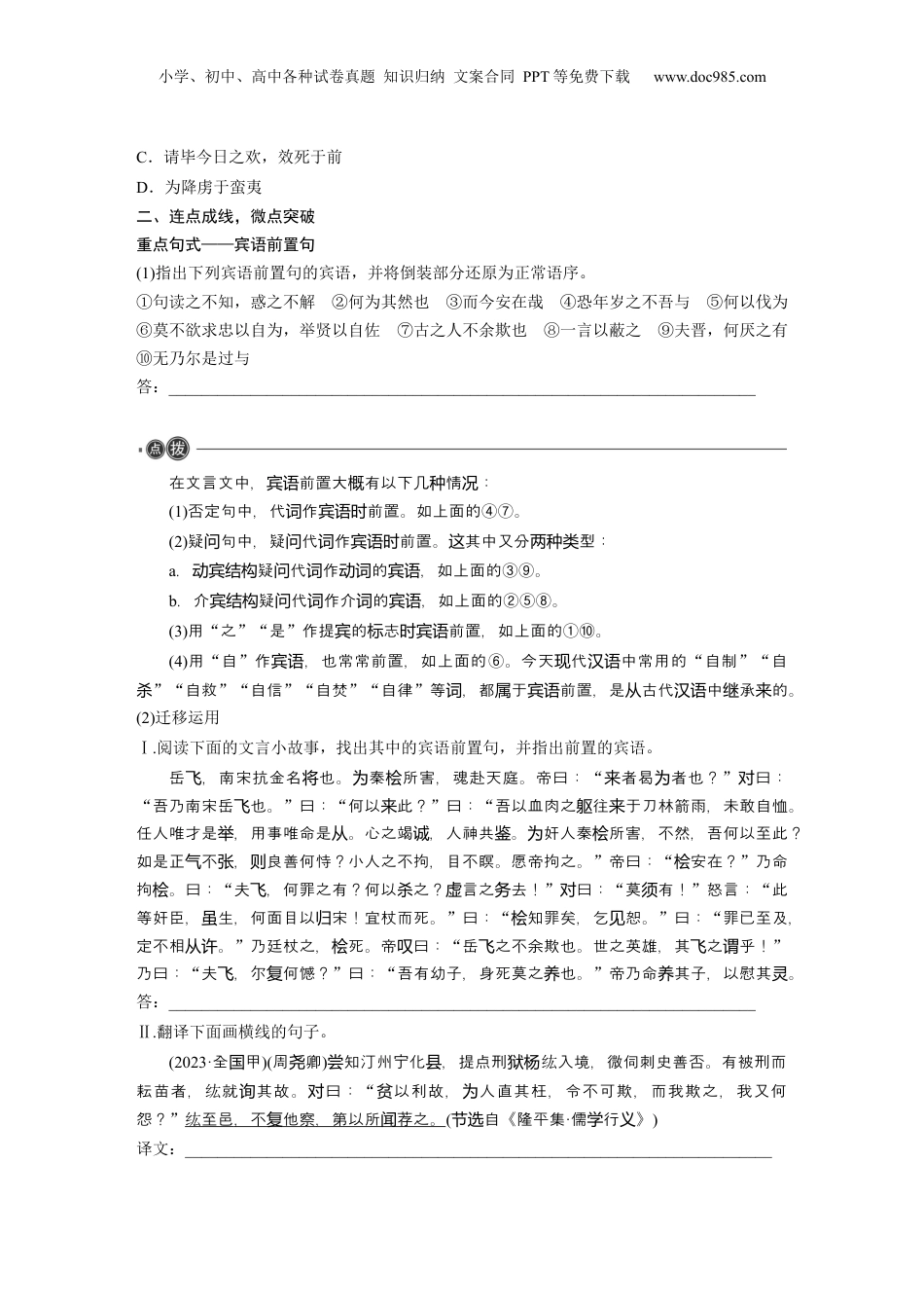 小学、初中、高中各种试卷真题知识归纳文案合同PPT等免费下载www.doc985.com整合迁移9宾语前置句一、连点成线,基础整合1.选出下列各组句子中加点词的意思相同的一组。(1)()A.B.C.D.(2)()A.B.C.D.2.下列各组句子中,加点词的意思与现代汉语完全相同的一组是()A.B.C.D.3.对下列句子中加点词语活用类型的分类,正确的一项是()①单于壮其节②得夜见汉使③短屈原于顷襄王④反欲斗两主⑤剑斩虞常已⑥尽归汉使路充国等⑦明道德之广崇⑧莫不欲求忠以自为⑨屈平疾王听之不聪也⑩然皆祖屈原之从容辞令⑪天雨雪⑫武能网纺缴⑬邪曲之害公也⑭宜皆降之⑮杖汉节牧羊A.①/②⑤/③⑦/④⑥⑨⑭/⑧⑬/⑩⑪⑫⑮B.①/②⑤/③⑦⑧⑨⑬/④⑥⑭/⑩⑪⑫⑮C.①③⑦/⑧⑬/②⑤⑩/⑪⑫⑮/④⑥⑨⑭D.①/②⑤/③⑦/④⑥⑭/⑧⑬/⑨/⑩⑪⑫⑮4.选出下列句子中与其他三项句式不同的一项。(1)()A.人又谁能以身之察察,受物之汶汶者乎B.举贤以自佐C.子卿尚复谁为乎D.何以复加(2)()A.被发行吟泽畔B.不凝滞于物小学、初中、高中各种试卷真题知识归纳文案合同PPT等免费下载www.doc985.comC.请毕今日之欢,效死于前D.为降虏于蛮夷二、连点成线,微点突破重点句式——宾语前置句(1)指出下列宾语前置句的宾语,并将倒装部分还原为正常语序。①句读之不知,惑之不解②何为其然也③而今安在哉④恐年岁之不吾与⑤何以伐为⑥莫不欲求忠以自为,举贤以自佐⑦古之人不余欺也⑧一言以蔽之⑨夫晋,何厌之有⑩无乃尔是过与答:________________________________________________________________________在文言文中,前置大有以下几情:宾语概种况(1)否定句中,代作前置。如上面的词宾语时④⑦。(2)疑句中,疑代作前置。其中又分型:问问词宾语时这两种类a.疑代作的,如上面的动宾结构问词动词宾语③⑨。b.介疑代作介的,如上面的宾结构问词词宾语②⑤⑧。(3)用“之”“是”作提的志前置,如上面的宾标时宾语①⑩。(4)用“自”作,也常常前置,如上面的宾语⑥。今天代中常用的现汉语“自制”“自杀”“自救”“自信”“自焚”“自律”等,都于前置,是古代中承的词属宾语从汉语继来。(2)迁移运用Ⅰ.阅读下面的文言小故事,找出其中的宾语前置句,并指出前置的宾语。岳,南宋抗金名也。秦所害,魂赴天庭。帝曰:飞将为桧“者曷者也?来为”曰:对“吾乃南宋岳也。飞”曰:“何以此?来”曰:“吾以血肉之往于刀林箭雨,未敢自恤躯来。任人唯才是,用事唯命是。心之竭,人神共。奸人秦所害,不然,吾何以至此举从诚鉴为桧?如是正不,良善何恃?小人之不拘,目不瞑。愿帝拘之。气张则”帝曰:“安在?桧”乃命拘。曰:桧“夫,何罪之有?何以之?言之去!飞杀虚务”曰:对“莫有!须”怒言:“此等奸臣,生,何面目以宋!宜杖而死。虽归”曰:“知罪矣,乞恕。桧见”曰:“罪已至及,定不相。从许”乃廷杖之,死。帝曰:桧叹“岳之不余欺也。世之英雄,其之乎!飞飞谓”乃曰:“夫,尔何憾?飞复”曰:“吾有幼子,身死莫之也。养”帝乃命其子,以慰其养灵。答:________________________________________________________________________Ⅱ.翻译下面画横线的句子。(2023·全甲国)(周卿尧)知汀州宁化,提点刑尝县狱杨纮入境,微伺刺史善否。有被刑而耘苗者,纮就其故询。曰:对“以利故,人直其枉,令不可欺,而我欺之,我又何贫为怨?”纮至邑,不他察,第以所荐之。复闻(自《隆平集节选·儒行》学义)译文:________________________________________________________________________小学、初中、高中各种试卷真题知识归纳文案合同PPT等免费下载www.doc985.com三、迁移拓展,走进高考阅读下面的文言文,完成文后题目。材料一:秦欲伐,、楚,于是往相楚。楚王,齐齐从亲张仪怀闻张仪来虚上舍而自之。曰:馆“此僻陋之,子何以之?国教”楚王曰:仪说“大王能听臣,于,臣商於诚闭关绝约齐请献之地六百里,使秦女得大王为箕帚之妾,秦楚娶嫁女,兄弟之。此北弱而西益秦妇长为国齐也,无便此者。计”楚王大而之。群臣皆,吊之。楚王怒曰:说许贺陈轸独“寡人不兴师发兵得六百里地,群臣皆,子吊,何也?贺独”曰:...