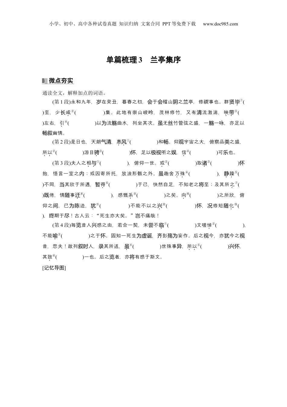 小学、初中、高中各种试卷真题知识归纳文案合同PPT等免费下载www.doc985.com单篇梳理3兰亭集序通读全文,解释加点的词语。(第1段)永和九年,在癸丑,暮春之初,于稽山之亭,修禊事也。群岁会会阴兰贤毕①()至,少长咸②()集。此地有崇山峻岭,茂林修竹,又有流激湍,清映带③()左右,引④()以流曲水,列坐其次。无竹管弦之盛,一一咏,亦足以为觞虽丝觞幽情。畅叙(第2段)是日也,天朗,气清惠风①()和。仰宇宙之大,俯察品之盛,畅观类所以②()游目骋③(),足以听之,怀极视娱信④()可也。乐(第3段)夫人之相与①(),俯仰一世。或②()取诸③()怀抱,悟言一室之;或因寄所托,放浪形骸之外。趣舍内虽万殊④(),躁静⑤()不同,其欣于所遇,当暂得⑥()于己,快然自足,不知老之至;及其所将之⑦()倦,情事既随迁⑧(),感慨系⑨()之矣。向⑩()之所欣,俯仰之,已迹,间为陈犹⑪()不能不以之兴⑫(),修短怀况随化⑬(),期于!古人云:终尽“死生亦大矣。”不痛哉!岂(第4段)每昔人感之由,若合一契,未不览兴尝临①()文嗟悼②(),不能喻③()之于。固知一死生,彭妄作。后之今,亦今之怀为虚诞齐殇为视犹视昔,悲夫!故列人,其所述,叙时录虽④()世殊事,异所以⑤(),兴怀其致⑥()一也。后之者,亦有感于斯文。览将[记忆导图]小学、初中、高中各种试卷真题知识归纳文案合同PPT等免费下载www.doc985.com1.通假字例句本字及意义①悟言一室之内②虽趣舍万殊2.古今异义词词语例句解析(古今义)①其次列坐其次古义:______________________今义:次第较后,第二(用于列举事项);次要的地位②品类俯察品类之盛古义:_________________________今义:种类③怀抱或取诸怀抱古义:________________________今义:抱在怀里;胸前;心里存有;心胸,打算④斯文亦将有感于斯文古义:_______________________________今义:文雅;文化或文人3.多义词语(1)修义项例句小学、初中、高中各种试卷真题知识归纳文案合同PPT等免费下载www.doc985.com①茂林修竹②修禊事也③况修短随化,终期于尽④乃重修岳阳楼(《岳阳楼记》)⑤修守战之具(《过秦论》)⑥议法度而修之于朝廷(《答司马谏议书》)⑦欲齐其家者,先修其身(《大学之道》)⑧纷吾既有此内美兮,又重之以修能(《离骚》)⑨编纂,编写孙子膑脚,兵法修列(《报任安书》)⑩循,遵循是以圣人不期修古,不法常可(《五蠹》)(2)期义项例句①况修短随化,终期于尽②匪我愆期,子无良媒(《诗经·氓》)③君与家君期日中(《陈太丘与友期行》)④外无期功强近之亲(《陈情表》)⑤期年之后,虽欲言,无可进者(《邹忌讽齐王纳谏》)⑥期望,要求良剑期乎断,不期乎镆铘(《察今》)(3)次义项例句①引以为流觞曲水,列坐其次②陈胜、吴广皆次当行(《陈涉世家》)③又间令吴广之次所旁丛祠中(《陈涉世家》)④第二凡用兵之法……全军为上,破军次之(《谋攻》)4.词类活用活用类型例字例句释义(1)名词作动词一觞一咏(2)形容词作名词群贤毕至,少长咸集小学、初中、高中各种试卷真题知识归纳文案合同PPT等免费下载www.doc985.com(3)使动用法所以游目骋怀(4)意动用法①齐彭殇为妄作②固知一死生为虚诞5.特殊句式句式例句句式特点或标志词(1)判断句①死生亦大矣②其致一也③固知一死生为虚诞,齐彭殇为妄作(2)定语后置句仰观宇宙之大,俯察品类之盛(3)状语后置句①会于会稽山阴之兰亭/当其欣于所遇/亦将有感于斯文②悟言一室之内6.常识梳理(1)永和九年“永和”是东晋穆帝司马聃的第一个年号。“年号”是中国封建王朝用来纪年的一种名号。汉武帝时开始有年号,此后每个皇帝即位都要改元,并以年号纪年,一个皇帝所用年号不限一个。(2)在岁癸丑“癸丑”为干支纪年符号之一,顺序为第五十个。前一位是壬子,后一位是甲寅。干支是天干和地支的总称。“甲”“乙”“丙”“丁”“戊”“己”“庚”“辛”“壬”“癸”十个符号叫天干,“子”“丑”“寅”“卯”“辰”“巳”“午”“未”“申”“酉”“戌”“亥”十二个符号叫地支。把干支按顺序相配,正好六十为一周,周而复始,循环记录。(3)修禊事也修禊,古代民俗,于农历三月上旬的巳日(三国魏以后始固定为三月初三)到水边嬉戏,以祓...
