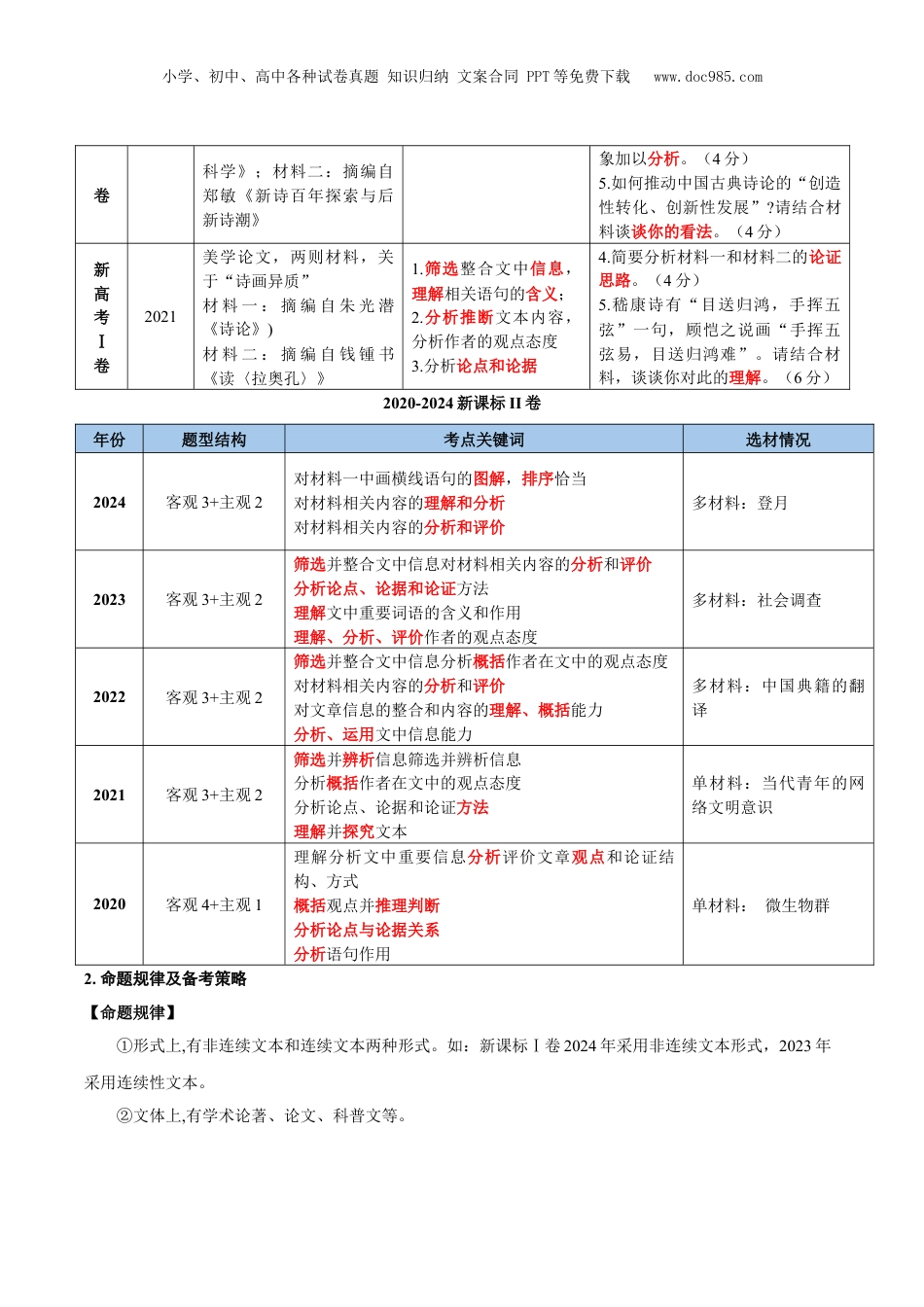 小学、初中、高中各种试卷真题知识归纳文案合同PPT等免费下载www.doc985.com考点01整体感知(信息类文本阅读)目录1.考情探究(考点分布、命题规律及备考策略)2.考点梳理(基础知识、选材特点、课内梳理、方法指导)3.考点精讲(文体特征、借思维导图读文本)4.好题冲关(基础、提升、真题)1.考点分布2021-2024新课标Ⅰ卷(含2023四省、2024九省命题)类型时间出处客观题主观题新课标Ⅰ卷2024政论文双文本毛泽东《论持久战》荣维木《中国共产党抗日持久战的战略与实践》1.下列对材料相关内容的理解和分析2.根据材料内容3.下列选项符合材料二中实施持久战的“内部条件”4.材料多处使用了设问句和反问句,请简要分析其论证效果。(4分)5.请根据材料谈谈《论持久战》对我们“看问题、想问题”有什么启示。(6分)九省联考2024科普文学术论文双文本关于“游牧业”话题摘编自韩茂莉《中国历史地理十五讲》|摘编自陈胜前《燕山——长城南北地区史前文化的适应变迁》1.筛选整合文中信息,理解相关语句的含义;2.分析推断文本内容,分析作者的观点态度3.分析论点和论据4.图表的解读5.哪些因素对欧亚大陆游牧业的产生起了重要作用?请结合材料简要概括。(6分)四省联考2023科普文,单篇,关于青藏高原研究摘编自星球研究所/中国青藏高原研究会《这里是中国》1.对内容理解和分析;2.对内容概括和分析;3.辨析内容理解4.东部季风区夏季气候的主要特点是什么?青藏高原在其气候的形成中起到了什么样的作用?(4分)5.好的科普文应该具备哪些要素?请结合文本材料进行分析。(4分)新课标Ⅰ卷2023单篇,关于信息传播摘编自赫克托·麦克唐纳《后真相时代》,刘清山译1.2对内容理解和分析3.最适合最为论据支撑第二段观点4.简要说明西方媒体在报道时使用了哪些“竞争性真相”(4分)5.作者采用哪些方法证明关于藜麦的新闻报道结论有误?概括。(6分)新高考Ⅰ2022学术论文,双文本,聚焦“中国古典诗歌与新诗”材料一:摘自习近平《加快构建中国特色哲学社会均考查学生筛选并辨析信息的能力4.“己所不欲,勿施于人”出自《论语》,现已成为国际社会公认的处理人际关系和国际关系的黄金准则。请结合材料一对这一现小学、初中、高中各种试卷真题知识归纳文案合同PPT等免费下载www.doc985.com卷科学》;材料二:摘编自郑敏《新诗百年探索与后新诗潮》象加以分析。(4分)5.如何推动中国古典诗论的“创造性转化、创新性发展”?请结合材料谈谈你的看法。(4分)新高考Ⅰ卷2021美学论文,两则材料,关于“诗画异质”材料一:摘编自朱光潜《诗论》)材料二:摘编自钱锺书《读〈拉奥孔〉》1.筛选整合文中信息,理解相关语句的含义;2.分析推断文本内容,分析作者的观点态度3.分析论点和论据4.简要分析材料一和材料二的论证思路。(4分)5.嵇康诗有“目送归鸿,手挥五弦”一句,顾恺之说画“手挥五弦易,目送归鸿难”。请结合材料,谈谈你对此的理解。(6分)2020-2024新课标II卷年份题型结构考点关键词选材情况2024客观3+主观2对材料一中画横线语句的图解,排序恰当对材料相关内容的理解和分析对材料相关内容的分析和评价多材料:登月2023客观3+主观2筛选并整合文中信息对材料相关内容的分析和评价分析论点、论据和论证方法理解文中重要词语的含义和作用理解、分析、评价作者的观点态度多材料:社会调查2022客观3+主观2筛选并整合文中信息分析概括作者在文中的观点态度对材料相关内容的分析和评价对文章信息的整合和内容的理解、概括能力分析、运用文中信息能力多材料:中国典籍的翻译2021客观3+主观2筛选并辨析信息筛选并辨析信息分析概括作者在文中的观点态度分析论点、论据和论证方法理解并探究文本单材料:当代青年的网络文明意识2020客观4+主观1理解分析文中重要信息分析评价文章观点和论证结构、方式概括观点并推理判断分析论点与论据关系分析语句作用单材料:微生物群2.命题规律及备考策略【命题规律】①形式上,有非连续文本和连续文本两种形式。如:新课标Ⅰ卷2024年采用非连续文本形式,2023年采用连续性文本。②文体上,有学术论著、论文、科普文等。小学、初中、高中各种试卷真题知识归纳文案合同PPT等免...