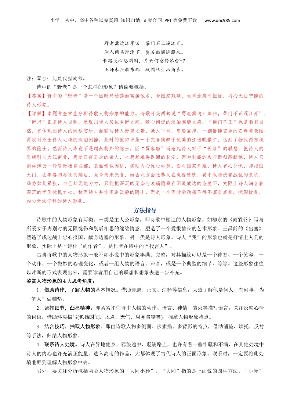 小学、初中、高中各种试卷真题知识归纳文案合同PPT等免费下载www.doc985.com考点07古诗词阅读之古诗理解与概括1.高考真题考点分布年份篇目/作者及朝代考查知识点2023年《鹤叹》/宋·苏轼理解诗句、分析写作手法鉴赏诗歌表现手法鉴赏评价诗歌主旨2022年《书喜》/南宋·陆游理解诗句、分析写作手法鉴赏诗歌语言鉴赏评价作者观点态度2021年《念奴娇·用传安道和朱希真梅词韵》/宋·朱熹理解诗句、分析写作手法诗句画面形象的理解与概括意象理解与主旨概括2.命题规律及备考策略【命题规律】天津卷中鉴赏诗歌形象大致可以分为两类:(一)古典诗、词、曲中的人物形象,包括:1.抒情主人公的形象。如李白的《梦游天姥吟留别》中的主人公形象和杜甫的《登高》中的诗人形象,就是作者运用第一人称的写法而塑造出来的形象。2.作品中刻画的人物形象。这类诗歌人物形象往往是用第三人称的写法创设出来的。如我们所熟知的《木兰诗》中的木兰和《孔雀东南飞》中的刘兰芝的形象,就是这种典型代表。(二)景物形象指诗歌中描绘的自然景物和人文景观。抒情诗往往借助客观物象(山川草木等)来表达主观感情,故这种承载主观感情的客观事物也是景物形象的一种。它包括:景物描写(季节、时令、地域等)、场面描写(农事、战争、狩猎、离别等)、色彩描写。【备考策略】诗歌形象中,常考人物、事物、景物形象,无论是哪一类型,都应先了解、提炼诗歌中所咏叹之象,通过诗歌中核心的字词去理解象的特点,再由“象”结合诗人的亲身感受、思想,剖析出所寄托、承载的情感(理想、志向)等。【命题预测】2025年天津卷,古诗词阅读与鉴赏部分,画面以及场景的概括仍将是重点考查对象,着重考查孩子对诗歌阅读过程中的理解能力以及归纳、表述能力。小学、初中、高中各种试卷真题知识归纳文案合同PPT等免费下载www.doc985.com考点精讲01人物形象(2023·天津南开·统考一模)阅读下面这首诗,按要求作答。走马川行奉送出师西征①[唐]岑参君不见走马川②,雪海边,平沙莽莽黄入天。轮台九月风夜吼,一川碎石大如斗,随风满地石乱走。匈奴草黄马正肥,金山西见烟尘飞,汉家大将西出师。将军金甲夜不脱,半夜军行戈相拨,风头如刀面如割。马毛带雪汗气蒸,五花连钱旋作冰,幕中草檄砚水凝。虏骑闻之应胆慑,料知短兵不敢接,车师③西门伫献捷。【注释】①岑参在任安西北庭节度判官时,封常清出兵去征播仙,诗人写此诗为封送行。②走马川:又名左末河,今之车尔成河,在新疆维吾尔自治区境内。③车师:唐安西都护府所在地,今新疆维吾尔自治区吐鲁番县。结合诗句分析,此诗塑造了西征将士怎样的形象?【答案】通过边地恶劣的自然环境衬托唐军充满不畏苦寒与艰险,斗志昂扬及高昂的爱国的精神;通过典型环境和军旅生活的细节表现将军重任在肩,以身作则,士兵军容整肃严明,骁勇善战。【详解】本题考查学生鉴赏诗歌人物形象的能力。首先围绕“风”字落笔,描写出征的自然环境。这次出征将经过走马川、雪海边,穿进戈壁沙漠。“平沙莽莽黄入天”,这是典型的绝域风沙景色,狂风怒卷,黄沙飞扬,遮天蔽日,迷迷蒙蒙,一派混沌的景象。“轮台九月风夜吼,一川碎石大如斗,随风满地石乱走”狂风像发疯的野兽,在怒吼,在咆哮,“吼”字形象地显示了风猛风大。斗大的石头,居然被风吹得满地滚动。再著一“乱”字,就更表现出风的狂暴。“平沙莽莽”句写天,“石乱走”句写地,三言两语就把环境的险恶生动地勾勒出来了。通过边地恶劣的自然环境衬托唐军充满不畏苦寒与艰险,斗志昂扬及高昂的爱国的精神;“金山西见烟尘飞”中“烟尘飞”三字,形容报警的烽烟同匈奴铁骑卷起的尘土一起飞扬,既表现了匈奴军旅的气势,也说明了唐军早有戒备。“将军金甲夜不脱”,以夜不脱甲,写将军重任在肩,以身作则。“半夜军行戈相拨”写半夜行军,从“戈相拨”的细节可以想见夜晚一片漆黑,和大军衔枚疾走、军容整肃严明的情景。通过典型环境和军旅生活的细节表现将军重任在肩,以身作则,士兵军容整肃严明,骁勇善战。(2022·天津·和平一模)阅读下面这首诗歌,完成题目。野老杜甫小学、初中、高中各种试卷真题知识归纳文案合同PPT等...