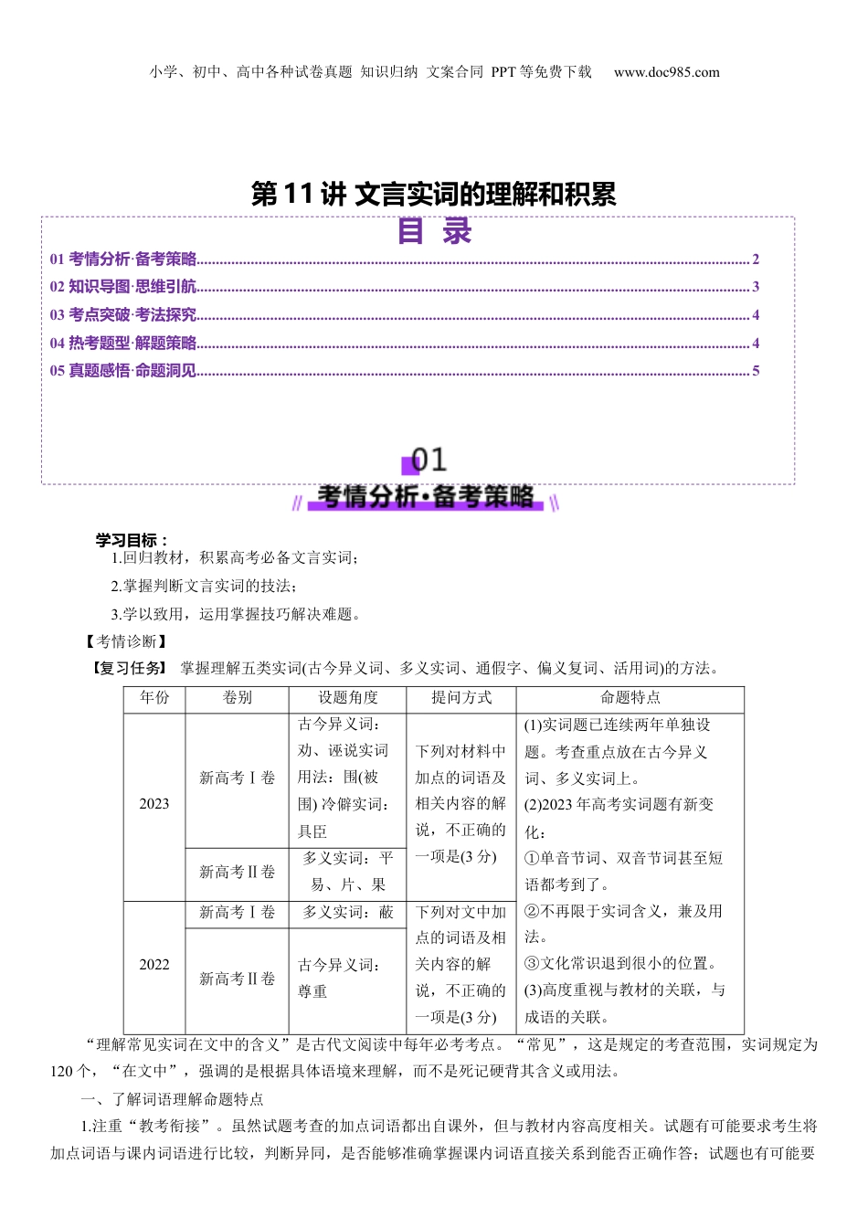 小学、初中、高中各种试卷真题知识归纳文案合同PPT等免费下载www.doc985.com第11讲文言实词的理解和积累目录01考情分析·备考策略...............................................................................................................................................202知识导图·思维引航...............................................................................................................................................303考点突破·考法探究...............................................................................................................................................404热考题型·解题策略...............................................................................................................................................405真题感悟·命题洞见...............................................................................................................................................5学习目标:1.回归教材,积累高考必备文言实词;2.掌握判断文言实词的技法;3.学以致用,运用掌握技巧解决难题。【考情诊断】复习任务掌握理解五类实词(古今异义词、多义实词、通假字、偏义复词、活用词)的方法。年份卷别设题角度提问方式命题特点2023新高考Ⅰ卷古今异义词:劝、诬说实词用法:围(被围)冷僻实词:具臣下列对材料中加点的词语及相关内容的解说,不正确的一项是(3分)(1)实词题已连续两年单独设题。考查重点放在古今异义词、多义实词上。(2)2023年高考实词题有新变化:①单音节词、双音节词甚至短语都考到了。②不再限于实词含义,兼及用法。③文化常识退到很小的位置。(3)高度重视与教材的关联,与成语的关联。新高考Ⅱ卷多义实词:平易、片、果2022新高考Ⅰ卷多义实词:蔽下列对文中加点的词语及相关内容的解说,不正确的一项是(3分)新高考Ⅱ卷古今异义词:尊重“理解常见实词在文中的含义”是古代文阅读中每年必考考点。“常见”,这是规定的考查范围,实词规定为120个,“在文中”,强调的是根据具体语境来理解,而不是死记硬背其含义或用法。一、了解词语理解命题特点1.注重“教考衔接”。虽然试题考查的加点词语都出自课外,但与教材内容高度相关。试题有可能要求考生将加点词语与课内词语进行比较,判断异同,是否能够准确掌握课内词语直接关系到能否正确作答;试题也有可能要小学、初中、高中各种试卷真题知识归纳文案合同PPT等免费下载www.doc985.com求考生判断选项中关于加点词语的表述是否正确,考生往往能够在语文教材中找到该词语,虽然所在语句不同但词语意思或用法相同,通过迁移课内知识就能破解课外词语。试题在以这样的方式告诉考生要重视课内知识的学习和迁移。2.注重对基础知识的考查。该题考查范围广,不仅包含对文言文重要词语意义的考查,而且包含对与之相关的各种文言现象等内容的考查,同时关涉对成语、文化常识等知识点的考查。虽然关联的考点众多,但都指向文言文的基础知识。本题的设置有利于引领学生积累文言词语、梳理文言现象、掌握古代汉语的基本语法知识,夯实基本功。3.注重比较分析。该题的相当一部分选项需要考生将考试遇到的新问题和日常学习应知应会的旧知识展开比较,这种命题方式除引导学生重视教材学习外,还锻炼了学生的思维品质,加深了学生对新知识的学习和对旧知识的巩固,有利于学生结合语境辨别重要文言词语的意义和用法,也便于学生开阔眼界,举一反三,形成知识体系。二、了解文言词语考查新题型考查题型是把考试材料中的一个实词与教材内的同一个实词进行词义异同比较,进而形成正确判断。这种题型答题的主要方法是以熟推生法:把教材内实词的词义代入那个陌生例句中去,再把该实词例句代入上下文中看是否合适。当然,此法使用的前提是熟知教材例句中该实词的词义。三、掌握文言实词方法攻略文言实词主要指名词、动词、形容词和数量词。这些词是构成文言文的主体,是学习文言文的关键。常见文言实词数量多,变化多,而且文言...