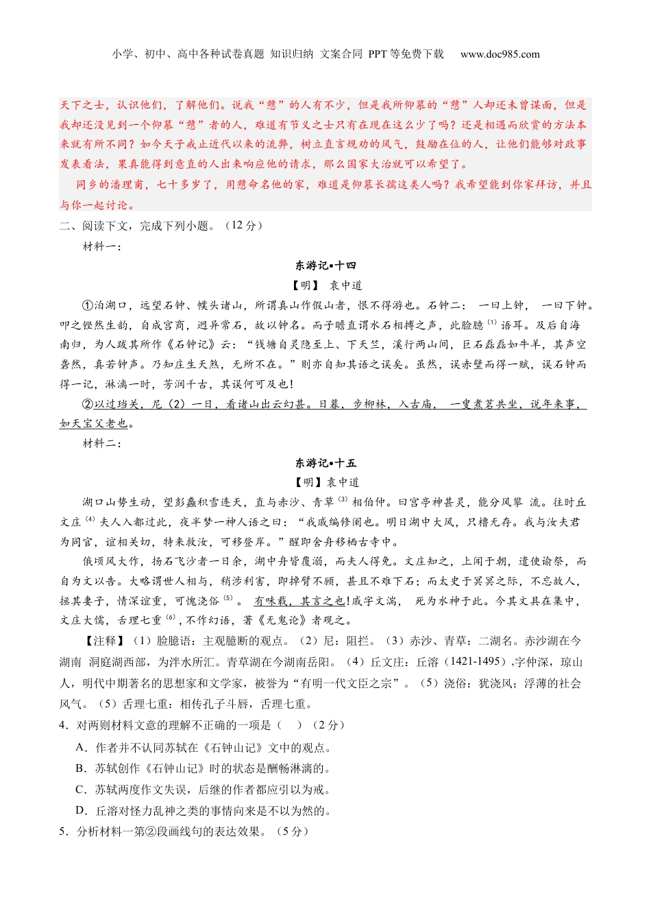 小学、初中、高中各种试卷真题知识归纳文案合同PPT等免费下载www.doc985.com综合测试14杂记文言文综合过关卷二说明:共13篇赠序类文言文,满分150分,时间:90~120分钟姓名__________得分________一、阅读下文,完成下列小题。(10分)戆窝记方孝孺①士之可贵者在节气,不在才智。天下未尝无才智之士,而世之乱也,恒以用才骋智者,驰骛太过,钓奇窃名以悦其君,卒致无穷之祸,而气节之士不与焉。气节者偃蹇可畏,而才智者敏慧可喜。可喜者易以成功,亦易以致乱。欲制祸乱于未萌之先,非得可畏者而任之不可也。汉汲长孺、吴张子布辈,皆负气自高,昌言倨色,不少屈抑以取合当世,视人君之尊不为之动,遇事辄面争其短无所忌。此皆流俗所谓戆人也,而朝廷恒倚之以为重,狐鼠之盗闢其进退以为恭肆,彼岂用区区之才智以服人哉?人望而惮之,以其节之足尚也。国家可使数十年无才智之士,而不可一日无气节之臣。譬彼甘脆之味,虽累时月不食,未足为病,而姜桂之和不可斯须无之。人君无可畏者在其侧,欲无危败,难矣!②余少慕古之戆者,欲起长孺、子布与之交,而不可得,则思博交海内之士,以观其所存。谓余为戇者有矣,而慕乎戇者,未始或见。岂节义之士独少于今之时乎,抑遇合之术固有不同也?今也天子惩近代之弊,立谏诤,风厉在位,俾得言事。诚得慧者出,以应其求,则治道可成矣。③同邑潘君伯理甫,年七十余,而以戆名其窝,岂慕长孺辈者乎?愿造君之窝,而相与论之。(选自《逊志斋集》卷一六,有删改)1.下列各组语句中,全都描述“戆人”表现或影响的一组是()(2分)①钓奇窃名以悦其君②不少屈抑以取合当世③遇事辄面争其短无所忌④狐鼠之盗闢其进退以为恭肆⑤立谏诤,风厉在位A.①②③B.②③④C.③④⑤D.②③⑤2.以下对本文分析不正确的一项是()(2分)A.开篇弘扬气节,为全文定下了激昂的基调。B.借题发挥,借为屋舍作记而论及国家用人。C.说“慕乎意者,未始或见”,隐含批判之意。D.卒章显志,水到渠成地表明了自己的主张。3.以下是曹小二对第①段画线句的评点,你同意吗?说说你的理由。(6分)譬彼甘脆之味,虽累时月不食,未足为病,而姜桂之和不可斯须无之。评点:前文表意已足,此处取譬,实蛇足之笔。【答案】1.B2.D3.示例:不同意。前文多言“才智之士”的负面作用,而此处以“甘脆之味”取譬,直言国家一段时间内无才智之士的后果“未足为病”,文意有所增补。取譬有强调所论之理的作用,以寻常生活中的事物作比又有形象易懂的效果,不是多余之笔。此外,本文是为潘君居室所作的记,此处以寻常生活中的事物作比,与尾段非常契合。小学、初中、高中各种试卷真题知识归纳文案合同PPT等免费下载www.doc985.com【解析】1.本题考查学生概括、分析人物形象的能力。①结合原文“恒以用才骋智者,驰骛太过,钓奇窃名以悦其君”可知,“钓奇窃名以悦其君”,这是一些运用才智的人的做法。⑤结合原文“今也天子惩近代之弊,立谏诤,风厉在位”可知,“立谏诤,风厉在位”,这是现今天子的行为。结合原文“不少屈抑以取合当世,视人君之尊不为之动,遇事辄面争其短无所忌。此皆流俗所谓戆人也,而朝廷恒倚之以为重,狐鼠之盗闢其进退以为恭肆”可知,②③④全都描述“戆人”表现或影响。故选B。2.本题考查学生理解文章内容的能力。D.“卒章显志,水到渠成地表明了自己的主张”错误,结合原文“士之可贵者在节气,不在才智”可知,文章开门见山,表明了自己的主张,提出中心论点,即君子的可贵之处在于气节的伟大而并非才智的出众。故选D。3.本题考查学生评价探究文中思想观点的能力。结合原文“譬彼甘脆之味,虽累时月不食,未足为病,而姜桂之和不可斯须无之”可知,大意是“就像是甜美酥脆的食物,即使很长时间不吃,也不会得病,但是对身体有好处的生姜和肉桂却不能不吃”。这是一个比喻句,以生活中寻常事物作比喻,较为形象生动地证明了“国家可使数十年无才智之士,而不可一日无气节之臣”的观点,即“一个国家可以数十年不用有才智的人,但绝不能一天不用有气节的臣”。这样的比喻使得抽象的道理更加形象化,并非“蛇足之笔”,因此不同意曹小二...