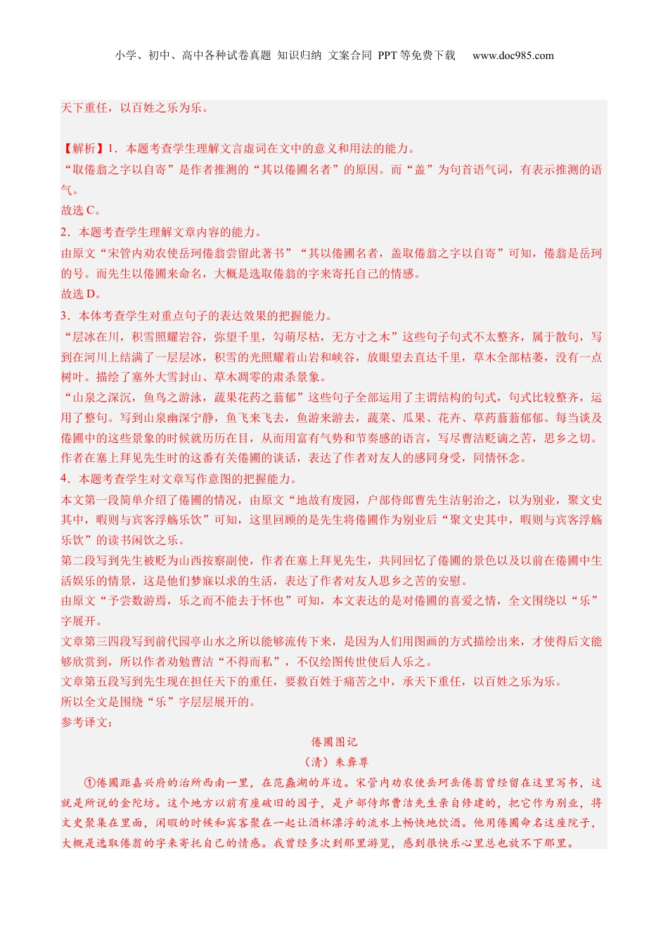 小学、初中、高中各种试卷真题知识归纳文案合同PPT等免费下载www.doc985.com综合测试13杂记文言文综合过关卷一说明:共13篇赠序类文言文,满分150分,时间:90~120分钟姓名__________得分________一、(2023·上海·统考三模)阅读下文,完成小题。(11分)倦圃图记(清)朱彜尊①倦圃距嘉兴府治西南一里,在范蠡湖之滨。宋管内劝农使岳珂①倦翁尝留此著书,所谓金陀坊是也。地故有废园,户部侍郎曹先生洁躬治之,以为别业,聚文史其中,暇则与宾客浮觞乐饮。其以倦圃名者,□取倦翁之字以自寄。予尝数游焉,乐之而不能去于怀也。②岁癸卯,先生左迁山西按察副使,治大同。越明年,予谒先生于塞上。时方九月,层冰在川,积雪照耀岩谷,弥望千里,勾萌尽枯,无方寸之木。相与语及倦圃,山泉之深沉,鱼鸟之游泳,蔬果花药之蓊郁,情景历历如目前事。先生抱膝低徊者久之。嗟夫!故乡之乐,人之梦寐在焉。以予暂游者。犹不能释于怀。况先生之寝处笑语其中者哉。③先生之门人周君月如工绘事,为先生图之,为景二十。于是各系以诗,先生复命予记其事。④予尝览前代园亭山水之胜,往往藉人以传,又必图绘之工,而后传之可久。若王维之辋川,顾瑛之玉山。百世而下,观其画图,不独想见两人之高,而其所与游,如裴迪、崔兴宗,下至袁华、于立之徒,览者亦希慕之不已。然则图绘之作,顾可少哉!⑤今先生方欲任天下之重,援斯民于饥溺。虽欲遗章组之荣,息影江湖之上,以遂其所好,盖难几矣。是倦圃之所,有山泉鱼鸟、蔬果花药之乐,先生且不得而私,而予与周君翻得藉圃之图以传,为可乐也。⑥周君名之恒,山东临清人,尝为江西参政,罢官后,遂移家江浦云。注释①岳珂:南宋文学家,岳飞之孙,曾知嘉兴府。1.可填入第①段方框处的一项是()(1分)A.夫B.惟C.盖D.其2.下列对第①段“倦圃”相关内容理解不正确的一项是()(2分)A.倦圃位置在嘉兴城外的湖边B.有名人古迹,为岳珂著书处。C.由嘉兴人曹洁亲自修整重建D.因现主人倦翁的字号而得名。3.从句式角度,分析第②段画线句的表达效果。(3分)4.概括本文的写作意图。(5分)【答案】1.C2.D3.整散结合。以散句描绘塞外大雪封山、草木凋零的肃杀景象用整句铺排,回忆倦圃山泉鱼鸟、蔬果花药种种美景。语言富有气势和节奏感,写尽曹洁贬谪之苦,思乡之切;表达作者对友人的感同身受,同情怀念。4.全文围绕“乐"字层层展开:一方面回顾往昔倦圃中“聚文史其中,暇则与宾客浮觞乐饮”的读书闲饮之乐;由此引出“人之梦寐在焉”的故乡草木之乐,表达对友人思乡之苦的安慰;另一方面,劝勉曹洁"不得而私",不仅绘图传世使后人乐之;更要“任天下之重,援斯民于饥溺”,承小学、初中、高中各种试卷真题知识归纳文案合同PPT等免费下载www.doc985.com天下重任,以百姓之乐为乐。【解析】1.本题考查学生理解文言虚词在文中的意义和用法的能力。“取倦翁之字以自寄”是作者推测的“其以倦圃名者”的原因。而“盖”为句首语气词,有表示推测的语气。故选C。2.本题考查学生理解文章内容的能力。由原文“宋管内劝农使岳珂倦翁尝留此著书”“其以倦圃名者,盖取倦翁之字以自寄”可知,倦翁是岳珂的号。而先生以倦圃来命名,大概是选取倦翁的字来寄托自己的情感。故选D。3.本体考查学生对重点句子的表达效果的把握能力。“层冰在川,积雪照耀岩谷,弥望千里,勾萌尽枯,无方寸之木”这些句子句式不太整齐,属于散句,写到在河川上结满了一层层冰,积雪的光照耀着山岩和峡谷,放眼望去直达千里,草木全部枯萎,没有一点树叶。描绘了塞外大雪封山、草木凋零的肃杀景象。“山泉之深沉,鱼鸟之游泳,蔬果花药之蓊郁”这些句子全部运用了主谓结构的句式,句式比较整齐,运用了整句。写到山泉幽深宁静,鱼飞来飞去,鱼游来游去,蔬菜、瓜果、花卉、草药蓊蓊郁郁。每当谈及倦圃中的这些景象的时候就历历在目,从而用富有气势和节奏感的语言,写尽曹洁贬谪之苦,思乡之切。作者在塞上拜见先生时的这番有关倦圃的谈话,表达了作者对友人的感同身受,同情怀念。4.本题考查学生对文章写作意图的把握能力。本文第一段简单介绍了倦圃的情况,由原文“地...