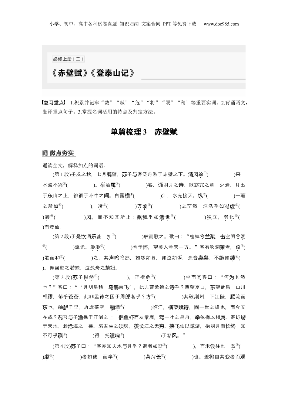小学、初中、高中各种试卷真题知识归纳文案合同PPT等免费下载www.doc985.com复习重点1.积累并记牢“数”“赋”“危”“将”“限”“稍”等重要实词。2.背诵两文,翻译重点句子。3.掌握名词活用的特点及判定方法。单篇梳理3赤壁赋通读全文,解释加点的词语。(第1段)壬戌之秋,七月望,子客泛舟游于赤壁之下。既苏与清风徐①(),来水波不兴②()。酒举属③()客,明月之,歌窈窕之章。少焉,月出诵诗于山之上,徘徊于斗牛之。白露东间横④()江,水光接天。纵⑤()一苇之所如⑥(),凌⑦()万顷⑧()之茫然。浩浩乎如冯虚⑨()御⑩(),而不知其所止;乎如风飘飘世遗⑪()立,独羽化⑫()而登仙。(第2段)于是酒甚,饮乐扣①()舷而歌之。歌曰:“桂棹兮,空明兮兰桨击溯②()流光。渺渺③()兮予,望美人兮天一方。怀”客有吹洞者,箫倚④()歌而和⑤()之。其然,如怨如慕,如泣如,余音,不如声呜呜诉袅袅绝缕⑥()。舞幽壑之潜蛟,泣孤舟之嫠。妇(第3段)子苏愀然①(),正襟危②()坐而客曰:问“何其然为也?”客曰:“‘月明星稀,南乌鹊飞’,此非曹孟德之乎?西望夏口,望武昌,山川诗东相,郁乎,此非孟德之困于周者乎?缪苍苍郎方③()其破州,下江陵,流而荆顺也,舳千里,旌旗蔽空,东舻酒酾④()江,槊,固一世之雄也,而今安临横赋诗在哉?吾子樵于江渚之上,而友麋鹿,一叶之扁舟,匏樽以相。寄蜉况与渔侣鱼虾驾举属蝣于天地,渺海之一粟。哀吾生之臾,江之无。仙以遨游,抱明月而。知沧须羡长穷挟飞长终不可乎骤⑤()得,托遗响⑥()于悲。风”(第4段)子曰:苏“客亦知夫水月乎?逝者如与斯①(),而未往也;尝盈②()虚③()者如彼,而卒④()莫消长⑤()也。盖自其者而将变观小学、初中、高中各种试卷真题知识归纳文案合同PPT等免费下载www.doc985.com之,天地则曾⑥()不能以一瞬;自其不者而之,物我皆无也,而又何变观则与尽乎!且夫天地之,物各有主,羡间苟⑦()非吾之所有,虽⑧()一毫而莫取。惟江上之,山之明月,耳得之而,目遇之而成色,取之无禁,用之不竭,清风与间为声是造物者之无藏也,而吾子之所共尽与适⑨()。”(第5段)客喜而笑,洗盏更①()酌。肴核,杯既尽盘狼籍②()。相与③()枕藉④()乎舟中,不知方之东既⑤()白。[记忆导图]1.通假字例句本字及意义①冯虚御风②山川相缪2.古今异义词词语例句解析(古今义)①白露白露横江,水光接天古义:_______________________今义:二十四节气之一,在9月7、8或9日②茫然凌万顷之茫然古义:______________________今义:完全不知道的样子;失意小学、初中、高中各种试卷真题知识归纳文案合同PPT等免费下载www.doc985.com的样子。③美人望美人兮天一方古义:_______________________今义:美貌的女子3.多义词语(1)望义项例句①七月既望②望美人兮天一方③都督阎公之雅望(《滕王阁序》)④日夜望将军至(《鸿门宴》)⑤吾令人望其气,皆为龙虎(《鸿门宴》)⑥埋怨,责怪商君相秦十年,宗室贵戚多怨望者(《史记·商君列传》)(2)赋义项例句①《赤壁赋》②横槊赋诗③临清流而赋诗(《归去来兮辞并序》)④省刑罚,薄赋敛(《管子》)⑤太医以王命聚之,岁赋其二(《捕蛇者说》)⑥青楼梦好,难赋深情(姜夔《扬州慢》)(3)危义项例句①正襟危坐而问客曰②危乎高哉(《蜀道难》)③危言危行(《论语》)④不念居安思危,戒奢以俭(《谏太宗十思疏》)(4)将小学、初中、高中各种试卷真题知识归纳文案合同PPT等免费下载www.doc985.com义项例句①盖将自其变者而观之②田园将芜胡不归(《归去来兮辞并序》)③将数百之众(《过秦论》)④王侯将相宁有种乎(《陈涉世家》)⑤出郭相扶将(《木兰诗》)⑥宫使驱将惜不得(《卖炭翁》)⑦将子无怒,秋以为期(《诗经·氓》)⑧将信将疑4.词类活用活用类型例字例句释义(1)名词作动词下江陵,顺流而东也(2)名词作状语西望夏口,东望武昌/乌鹊南飞(3)形容词作动词①正襟危坐②不知东方之既白(4)意动用法侣鱼虾而友麋鹿(5)使动用法舞幽壑之潜蛟,泣孤舟之嫠妇5.特殊句式句式例句句式特点或标志词(1)宾语前置句①何为其然也?②而今安在哉?③而又何羡乎!(2)定语后置句①凌万顷之茫然②客有吹洞箫者(3)判断句①是造物者之无尽藏也②固一世之...