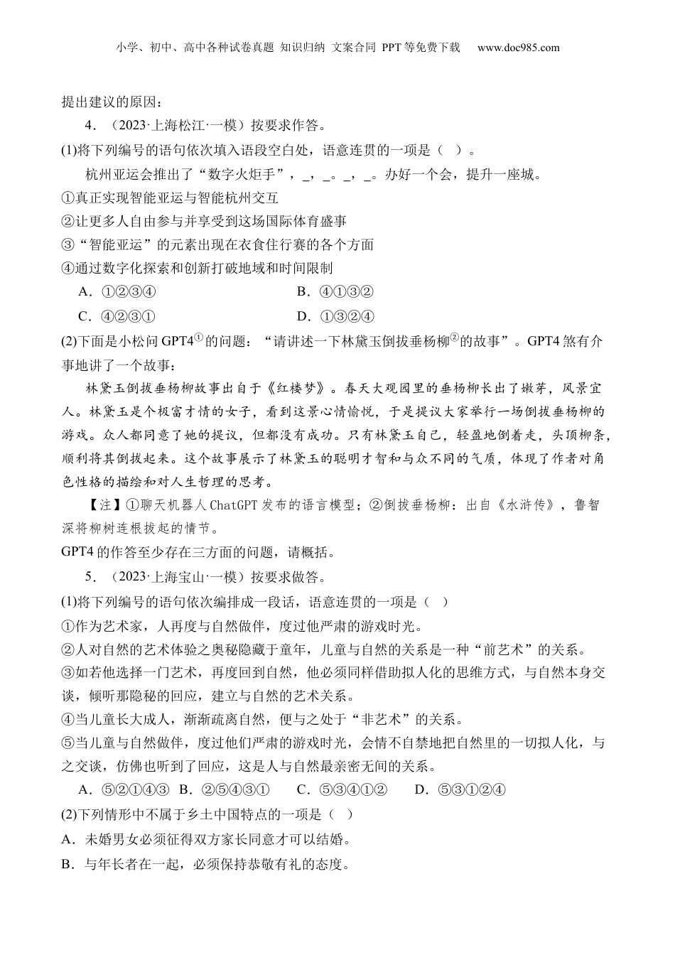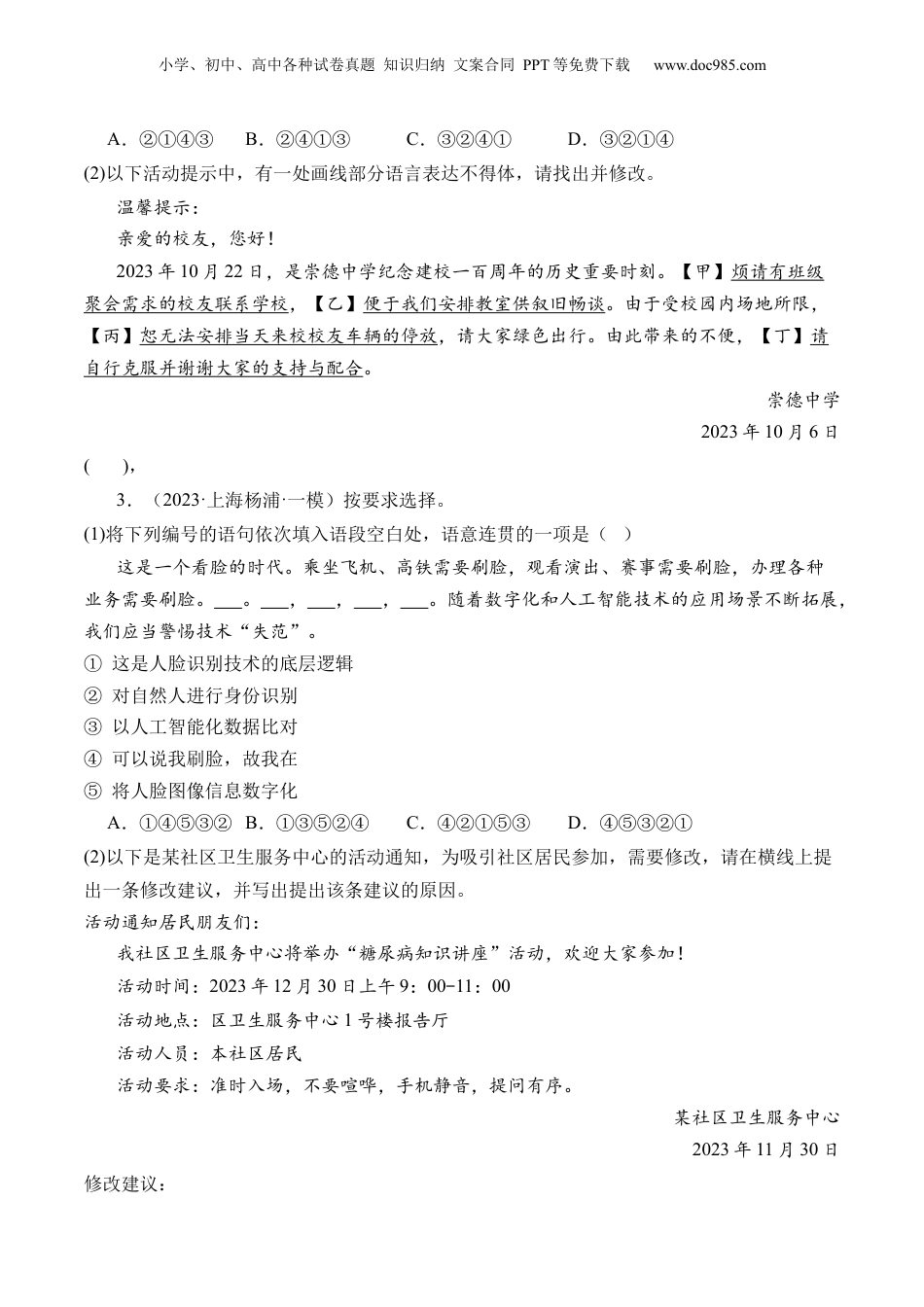 小学、初中、高中各种试卷真题知识归纳文案合同PPT等免费下载www.doc985.com综合测试03语言应用综合过关测试卷一时间:90分钟,满分150分说明:每题5分,(1)题2分,(2)题3分;共30题。姓名__________得分________1.(2023·上海长宁·一模)按要求选择。(1)将下列编号的语句依次填入语段空白处,语意连贯的一项是()在以数字信息技术赋能乡村振兴进而促进城乡共同富裕的进程中,我们需要重点关注信息技术如何影响城乡差距。可以说,___,___,更重要的是,___,___。①信息技术是乡村振兴的巨大推动力之一②信息技术可被视为现阶段调节城乡差距的一个均衡器③它会产生“数字红利”效应④持续科学配置信息技术资源能够缩小城乡差距并推动城乡均衡发展A.①②③④B.①③②④C.②④①③D.②③④①(2)今天对小宁来说有点特别:大伯七十大寿、舅舅迁居、同学新婚,他打算各送一副对联。下列对联与所送对象最贴合的一项是()[甲]春融花并蒂,日暖树交柯[乙]东风开画栋,旭日映华堂[丙]三千岁月春常在,六一丰神古所稀A.甲联送大伯,乙联送舅舅,丙联送同学B.甲联送舅舅,乙联送同学,丙联送大伯C.甲联送同学,乙联送大伯,丙联送舅舅D.甲联送同学,乙联送舅舅,丙联送大伯。2.(2023·上海青浦·一模)按要求选择。(1)将下列编号的语句依次填入语段空白处,语意连贯的一项是()作为一种由花材与花器组合而成的复合纹饰,宋代盆花纹广泛应用于陶瓷装饰上。盆花又称盆栽、盆景,,,,。盆花狭义上仅指花卉盆景,广义上还包括山石、植物等各类盆景。①以观赏美化为目的②通常以花草树木、山石为栽培布置对象③是古代花木应用中的重要形式之一④以盆钵为花器小学、初中、高中各种试卷真题知识归纳文案合同PPT等免费下载www.doc985.comA.②①④③B.②④①③C.③②④①D.③②①④(2)以下活动提示中,有一处画线部分语言表达不得体,请找出并修改。温馨提示:亲爱的校友,您好!2023年10月22日,是崇德中学纪念建校一百周年的历史重要时刻。【甲】烦请有班级聚会需求的校友联系学校,【乙】便于我们安排教室供叙旧畅谈。由于受校园内场地所限,【丙】恕无法安排当天来校校友车辆的停放,请大家绿色出行。由此带来的不便,【丁】请自行克服并谢谢大家的支持与配合。崇德中学2023年10月6日(),3.(2023·上海杨浦·一模)按要求选择。(1)将下列编号的语句依次填入语段空白处,语意连贯的一项是()这是一个看脸的时代。乘坐飞机、高铁需要刷脸,观看演出、赛事需要刷脸,办理各种业务需要刷脸。。,,,。随着数字化和人工智能技术的应用场景不断拓展,我们应当警惕技术“失范”。①这是人脸识别技术的底层逻辑②对自然人进行身份识别③以人工智能化数据比对④可以说我刷脸,故我在⑤将人脸图像信息数字化A.①④⑤③②B.①③⑤②④C.④②①⑤③D.④⑤③②①(2)以下是某社区卫生服务中心的活动通知,为吸引社区居民参加,需要修改,请在横线上提出一条修改建议,并写出提出该条建议的原因。活动通知居民朋友们:我社区卫生服务中心将举办“糖尿病知识讲座”活动,欢迎大家参加!活动时间:2023年12月30日上午9:00-11:00活动地点:区卫生服务中心1号楼报告厅活动人员:本社区居民活动要求:准时入场,不要喧哗,手机静音,提问有序。某社区卫生服务中心2023年11月30日修改建议:小学、初中、高中各种试卷真题知识归纳文案合同PPT等免费下载www.doc985.com提出建议的原因:4.(2023·上海松江·一模)按要求作答。(1)将下列编号的语句依次填入语段空白处,语意连贯的一项是()。杭州亚运会推出了“数字火炬手”,,。,。办好一个会,提升一座城。①真正实现智能亚运与智能杭州交互②让更多人自由参与并享受到这场国际体育盛事③“智能亚运”的元素出现在衣食住行赛的各个方面④通过数字化探索和创新打破地域和时间限制A.①②③④B.④①③②C.④②③①D.①③②④(2)下面是小松问GPT4①的问题:“请讲述一下林黛玉倒拔垂杨柳②的故事”。GPT4煞有介事地讲了一个故事:林黛玉倒拔垂杨柳故事出自于《红楼梦》。春天大观园里的垂杨柳长出了嫩芽,风景宜人。...