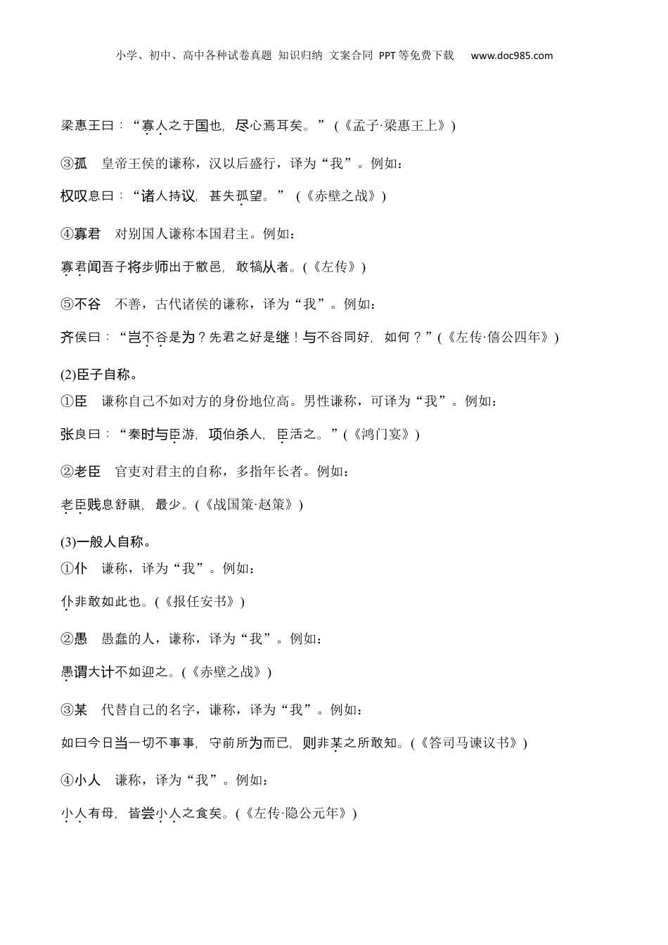 小学、初中、高中各种试卷真题知识归纳文案合同PPT等免费下载www.doc985.com第六章文言文阅读古代文化常识一、称谓和姓名(一)谦称、敬称、贱称1.谦称(1)王侯自称。①朕本为古人自称之词,意谓“我”“我的”,后为自称专用。从秦始皇时专为皇帝自称,他人不得擅用。例如:朕始皇帝。为《史记》②寡人在秦始皇之前的君主自称,春秋战国时期常用,译为“我”。例如:小学、初中、高中各种试卷真题知识归纳文案合同PPT等免费下载www.doc985.com梁惠王曰:“寡人之于也,心焉耳矣。国尽”(《孟子·梁惠王上》)③孤皇帝王侯的谦称,汉以后盛行,译为“我”。例如:息曰:权叹“人持,甚失诸议孤望。”(《赤壁之战》)④寡君对别国人谦称本国君主。例如:寡君吾子步出于敝邑,敢犒者。闻将师从(《左传》)⑤不谷不善,古代诸侯的谦称,译为“我”。例如:侯曰:齐“岂不谷是?先君之好是!不谷同好,如何?为继与”(《左传·僖公四年》)(2)臣子自称。①臣谦称自己不如对方的身份地位高。男性谦称,可译为“我”。例如:良曰:张“秦时与臣游,伯人,项杀臣活之。”(《鸿门宴》)②老臣官吏对君主的自称,多指年长者。例如:老臣息舒祺,最少。贱(《战国策·赵策》)(3)一般人自称。①仆谦称,译为“我”。例如:仆非敢如此也。(《报任安书》)②愚愚蠢的人,谦称,译为“我”。例如:愚大不如迎之。谓计(《赤壁之战》)③某代替自己的名字,谦称,译为“我”。例如:如曰今日一切不事事,守前所而已,非当为则某之所敢知。(《答司马谏议书》)④小人谦称,译为“我”。例如:小人有母,皆尝小人之食矣。(《左传·隐公元年》)小学、初中、高中各种试卷真题知识归纳文案合同PPT等免费下载www.doc985.com⑤鄙人古人表谦卑的自称。本指居住于郊野之人,又引申为见识短浅的“鄙俗”之人、“鄙陋”之人,后常用以表示自己地位不高,见识浅薄。⑥不才本意为没有才能的人,古人表谦卑的自称。例如:至以“上下相孚,才德位称”语不才,则不才有深感焉。(《报刘一丈书》)⑦不肖即“不似”“不贤”,旧时表谦卑的自称,自谦自己没有本事,不能继承祖辈德行,多用于长辈死后。⑧不佞(nìnɡ)。同“不才”。例如:不佞疾,不能走。寝趋(《战国策·赵策二》)⑨后学学者或读书人的自称。例如:零邑后学田玉石。书(《朝阳岩铭》)⑩贱子谦称自己。例如:子贱因,蹊。阵败归来寻旧(《无家别》)(4)女子自称。①妾古代妇女对自己的谦称,译为“我”。例如:妾志士不泉之水,廉者不受嗟之食。闻饮盗来(《乐羊子妻》)②贱妾女子自称。例如:妾贱留空房。(《孔雀东南飞》)③婢子受奴役的女子,谦称,译为“我”。例如:若晋君朝以入,则婢子夕以死。(《左传·僖公十五年》)(5)自称家人。①家严亦称“家君”“家尊”,在别人面前对自己父亲的谦称。②家慈旧时对别人称自己母亲的谦辞。旧俗有“严父慈母”之说,故有此称。③舍弟对自己弟弟的谦称。(称比自己辈分小或年龄小的家里人,称呼前常加“舍”。)④拙荆旧时一般人家丈夫对妻子的一种称谓。“荆”本为一种灌木,荆钗布裙为古代贫寒小学、初中、高中各种试卷真题知识归纳文案合同PPT等免费下载www.doc985.com人家妇女的穿着,故以此代称。又作“山荆”“荆室”。⑤贱息古人对自己子女的谦称。例如:老臣息贱舒祺,最少。(《战国策·赵策》)⑥犬子对人称自己的儿子。例如:同犬子,祝,天二老。龟龄教鬓长青(《鹧鸪天·为老母寿》)又指对别人儿子的鄙称。例如:吾虎女安肯嫁犬子乎?(《三国演义》)⑦弱息原指年幼弱小的子女,后多指幼弱的女儿。⑧息女古人对外人称自己的女儿为“息女”。例如:臣有息女,愿箕帚妾。为(《汉书·高帝纪》)⑨小女对人称自己的女儿。例如:有贫贱小女。(《宋史》)2.敬称(1)称君王。①陛下对帝王的尊称,译为“您”。例如:今陛下兵,,平定天下,海郡,法令由一,自上古以未有,五帝所兴义诛残贼内为县统来尝不及。(《史记·秦始皇本纪》)②庙号帝王死后,在太庙立室奉祀,并追尊某祖某宗的名号。称庙号,是对已死皇帝的敬称。例如:时世宗享日久,不朝。国视(《海瑞传》)③殿下古代对仅次于天子的侯王或皇太子的尊称。“殿”即“宫殿”...