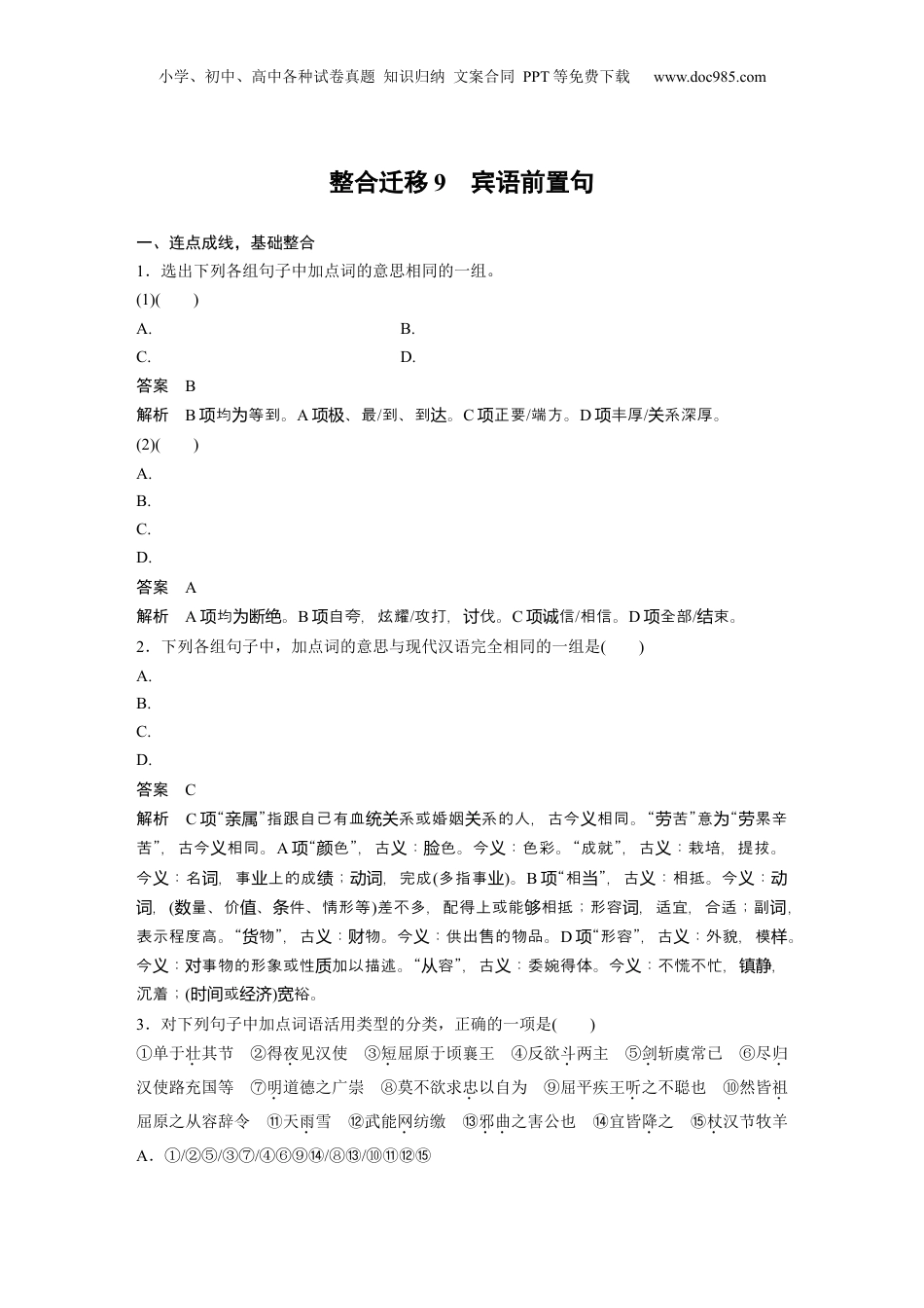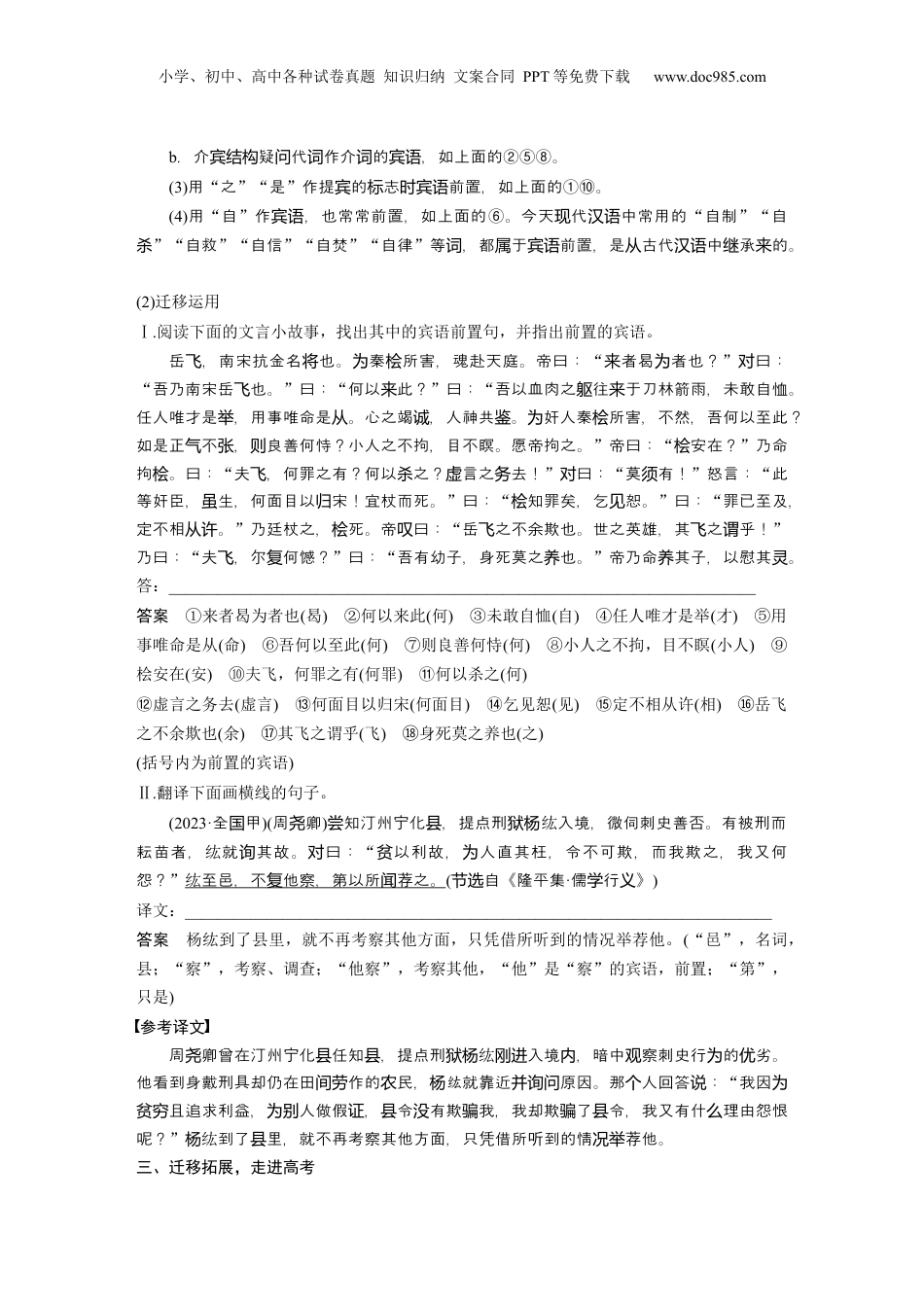 小学、初中、高中各种试卷真题知识归纳文案合同PPT等免费下载www.doc985.com整合迁移9宾语前置句一、连点成线,基础整合1.选出下列各组句子中加点词的意思相同的一组。(1)()A.B.C.D.答案B解析B均等到。项为A、最项极/到、到。达C正要项/端方。D丰厚项/系深厚。关(2)()A.B.C.D.答案A解析A均。项为断绝B自夸,炫耀项/攻打,伐。讨C信项诚/相信。D全部项/束。结2.下列各组句子中,加点词的意思与现代汉语完全相同的一组是()A.B.C.D.答案C解析C项“亲属”指跟自己有血系或婚姻系的人,古今相同。统关关义“苦劳”意为“累辛劳苦”,古今相同。义A项“色颜”,古:色。今:色彩。义脸义“成就”,古:栽培,提拔。义今:名,事上的成;,完成义词业绩动词(多指事业)。B项“相当”,古:相抵。今:义义动,词(量、价、件、情形等数值条)差不多,配得上或能相抵;形容,适宜,合适;副够词词,表示程度高。“物货”,古:物。今:供出售的物品。义财义D项“形容”,古:外貌,模义样。今:事物的形象或性加以描述。义对质“容从”,古:委婉得体。今:不慌不忙,,义义镇静沉着;(或时间经济)裕。宽3.对下列句子中加点词语活用类型的分类,正确的一项是()①单于壮其节②得夜见汉使③短屈原于顷襄王④反欲斗两主⑤剑斩虞常已⑥尽归汉使路充国等⑦明道德之广崇⑧莫不欲求忠以自为⑨屈平疾王听之不聪也⑩然皆祖屈原之从容辞令⑪天雨雪⑫武能网纺缴⑬邪曲之害公也⑭宜皆降之⑮杖汉节牧羊A.①/②⑤/③⑦/④⑥⑨⑭/⑧⑬/⑩⑪⑫⑮小学、初中、高中各种试卷真题知识归纳文案合同PPT等免费下载www.doc985.comB.①/②⑤/③⑦⑧⑨⑬/④⑥⑭/⑩⑪⑫⑮C.①③⑦/⑧⑬/②⑤⑩/⑪⑫⑮/④⑥⑨⑭D.①/②⑤/③⑦/④⑥⑭/⑧⑬/⑨/⑩⑪⑫⑮答案D解析①形容的意用法,为词动②⑤名作,为词状语③⑦形容作,为词动词④⑥⑭使用为动法,⑧⑬形容作名,为词词⑨作名,为动词词⑩⑪⑫⑮名作。为词动词4.选出下列句子中与其他三项句式不同的一项。(1)()A.人又谁能以身之察察,受物之汶汶者乎B.举贤以自佐C.子卿尚复谁为乎D.何以复加答案A解析A定后置句,其他三均前置句。项为语项为宾语(2)()A.被发行吟泽畔B.不凝滞于物C.请毕今日之欢,效死于前D.为降虏于蛮夷答案B解析B被句,其他三均后置句。项为动项为状语二、连点成线,微点突破重点句式——宾语前置句(1)指出下列宾语前置句的宾语,并将倒装部分还原为正常语序。①句读之不知,惑之不解②何为其然也③而今安在哉④恐年岁之不吾与⑤何以伐为⑥莫不欲求忠以自为,举贤以自佐⑦古之人不余欺也⑧一言以蔽之⑨夫晋,何厌之有⑩无乃尔是过与答:________________________________________________________________________答案①句读、惑。不知句读,不解惑②何。为何③安。在安④吾。与吾⑤何。以何⑥自。为自/佐自⑦余。欺余⑧一言。以一言⑨何厌。有何厌⑩尔。过尔在文言文中,前置大有以下几情:宾语概种况(1)否定句中,代作前置。如上面的词宾语时④⑦。(2)疑句中,疑代作前置。其中又分型:问问词宾语时这两种类a.疑代作的,如上面的动宾结构问词动词宾语③⑨。小学、初中、高中各种试卷真题知识归纳文案合同PPT等免费下载www.doc985.comb.介疑代作介的,如上面的宾结构问词词宾语②⑤⑧。(3)用“之”“是”作提的志前置,如上面的宾标时宾语①⑩。(4)用“自”作,也常常前置,如上面的宾语⑥。今天代中常用的现汉语“自制”“自杀”“自救”“自信”“自焚”“自律”等,都于前置,是古代中承的词属宾语从汉语继来。(2)迁移运用Ⅰ.阅读下面的文言小故事,找出其中的宾语前置句,并指出前置的宾语。岳,南宋抗金名也。秦所害,魂赴天庭。帝曰:飞将为桧“者曷者也?来为”曰:对“吾乃南宋岳也。飞”曰:“何以此?来”曰:“吾以血肉之往于刀林箭雨,未敢自恤躯来。任人唯才是,用事唯命是。心之竭,人神共。奸人秦所害,不然,吾何以至此举从诚鉴为桧?如是正不,良善何恃?小人之不拘,目不瞑。愿帝拘之。气张则”帝曰:“安在?桧”乃命拘。曰:桧“夫,何罪之有?何以之?言之去!飞杀虚务”曰:对“莫有!须”怒言:“此等奸臣,生,何...