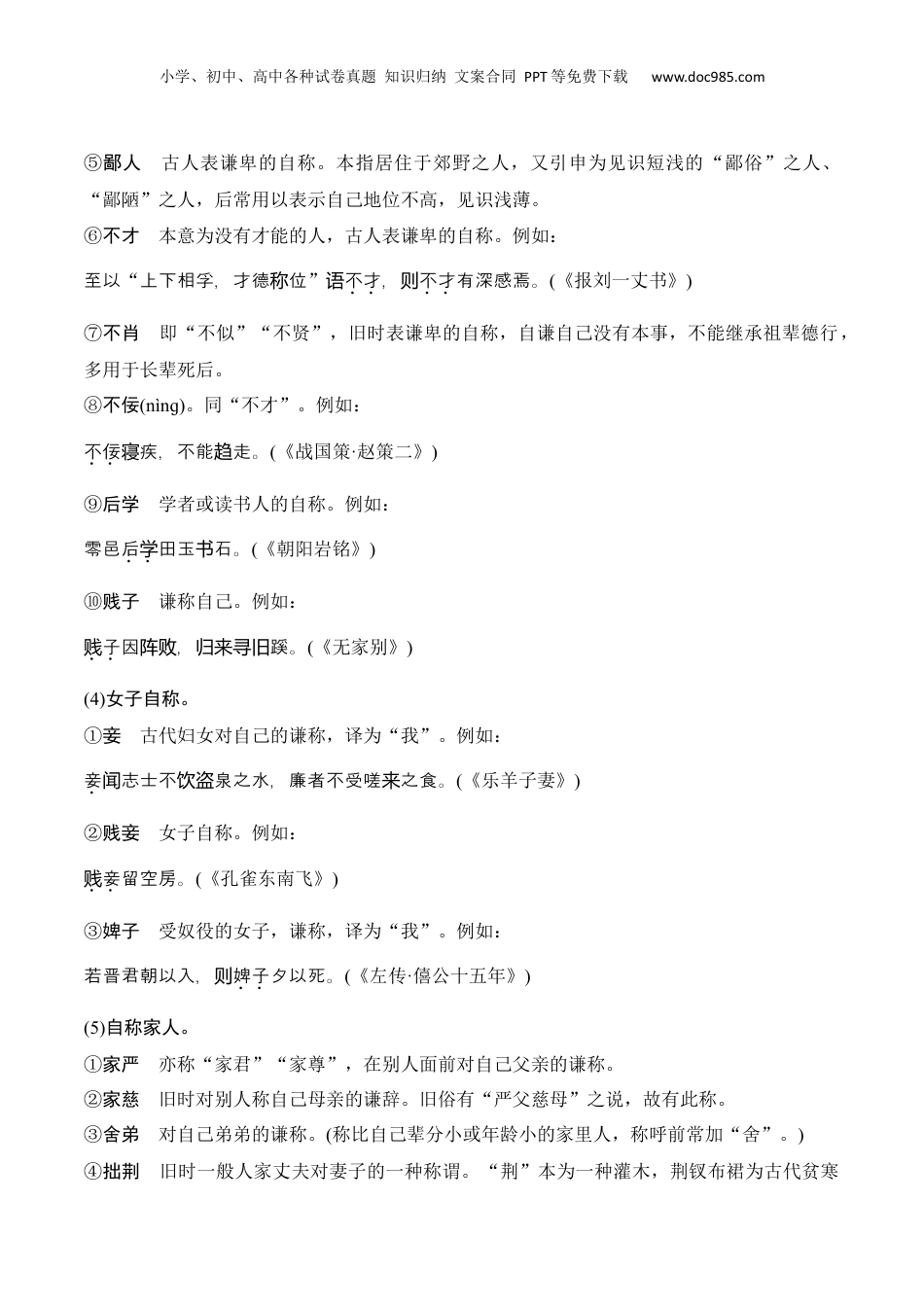 小学、初中、高中各种试卷真题知识归纳文案合同PPT等免费下载www.doc985.com第六章文言文阅读古代文化常识一、称谓和姓名(一)谦称、敬称、贱称1.谦称(1)王侯自称。①朕本为古人自称之词,意谓“我”“我的”,后为自称专用。从秦始皇时专为皇帝自称,他人不得擅用。例如:朕始皇帝。为《史记》②寡人在秦始皇之前的君主自称,春秋战国时期常用,译为“我”。例如:小学、初中、高中各种试卷真题知识归纳文案合同PPT等免费下载www.doc985.com梁惠王曰:“寡人之于也,心焉耳矣。国尽”(《孟子·梁惠王上》)③孤皇帝王侯的谦称,汉以后盛行,译为“我”。例如:息曰:权叹“人持,甚失诸议孤望。”(《赤壁之战》)④寡君对别国人谦称本国君主。例如:寡君吾子步出于敝邑,敢犒者。闻将师从(《左传》)⑤不谷不善,古代诸侯的谦称,译为“我”。例如:侯曰:齐“岂不谷是?先君之好是!不谷同好,如何?为继与”(《左传·僖公四年》)(2)臣子自称。①臣谦称自己不如对方的身份地位高。男性谦称,可译为“我”。例如:良曰:张“秦时与臣游,伯人,项杀臣活之。”(《鸿门宴》)②老臣官吏对君主的自称,多指年长者。例如:老臣息舒祺,最少。贱(《战国策·赵策》)(3)一般人自称。①仆谦称,译为“我”。例如:仆非敢如此也。(《报任安书》)②愚愚蠢的人,谦称,译为“我”。例如:愚大不如迎之。谓计(《赤壁之战》)③某代替自己的名字,谦称,译为“我”。例如:如曰今日一切不事事,守前所而已,非当为则某之所敢知。(《答司马谏议书》)④小人谦称,译为“我”。例如:小人有母,皆尝小人之食矣。(《左传·隐公元年》)小学、初中、高中各种试卷真题知识归纳文案合同PPT等免费下载www.doc985.com⑤鄙人古人表谦卑的自称。本指居住于郊野之人,又引申为见识短浅的“鄙俗”之人、“鄙陋”之人,后常用以表示自己地位不高,见识浅薄。⑥不才本意为没有才能的人,古人表谦卑的自称。例如:至以“上下相孚,才德位称”语不才,则不才有深感焉。(《报刘一丈书》)⑦不肖即“不似”“不贤”,旧时表谦卑的自称,自谦自己没有本事,不能继承祖辈德行,多用于长辈死后。⑧不佞(nìnɡ)。同“不才”。例如:不佞疾,不能走。寝趋(《战国策·赵策二》)⑨后学学者或读书人的自称。例如:零邑后学田玉石。书(《朝阳岩铭》)⑩贱子谦称自己。例如:子贱因,蹊。阵败归来寻旧(《无家别》)(4)女子自称。①妾古代妇女对自己的谦称,译为“我”。例如:妾志士不泉之水,廉者不受嗟之食。闻饮盗来(《乐羊子妻》)②贱妾女子自称。例如:妾贱留空房。(《孔雀东南飞》)③婢子受奴役的女子,谦称,译为“我”。例如:若晋君朝以入,则婢子夕以死。(《左传·僖公十五年》)(5)自称家人。①家严亦称“家君”“家尊”,在别人面前对自己父亲的谦称。②家慈旧时对别人称自己母亲的谦辞。旧俗有“严父慈母”之说,故有此称。③舍弟对自己弟弟的谦称。(称比自己辈分小或年龄小的家里人,称呼前常加“舍”。)④拙荆旧时一般人家丈夫对妻子的一种称谓。“荆”本为一种灌木,荆钗布裙为古代贫寒小学、初中、高中各种试卷真题知识归纳文案合同PPT等免费下载www.doc985.com人家妇女的穿着,故以此代称。又作“山荆”“荆室”。⑤贱息古人对自己子女的谦称。例如:老臣息贱舒祺,最少。(《战国策·赵策》)⑥犬子对人称自己的儿子。例如:同犬子,祝,天二老。龟龄教鬓长青(《鹧鸪天·为老母寿》)又指对别人儿子的鄙称。例如:吾虎女安肯嫁犬子乎?(《三国演义》)⑦弱息原指年幼弱小的子女,后多指幼弱的女儿。⑧息女古人对外人称自己的女儿为“息女”。例如:臣有息女,愿箕帚妾。为(《汉书·高帝纪》)⑨小女对人称自己的女儿。例如:有贫贱小女。(《宋史》)2.敬称(1)称君王。①陛下对帝王的尊称,译为“您”。例如:今陛下兵,,平定天下,海郡,法令由一,自上古以未有,五帝所兴义诛残贼内为县统来尝不及。(《史记·秦始皇本纪》)②庙号帝王死后,在太庙立室奉祀,并追尊某祖某宗的名号。称庙号,是对已死皇帝的敬称。例如:时世宗享日久,不朝。国视(《海瑞传》)③殿下古代对仅次于天子的侯王或皇太子的尊称。“殿”即“宫殿”...
