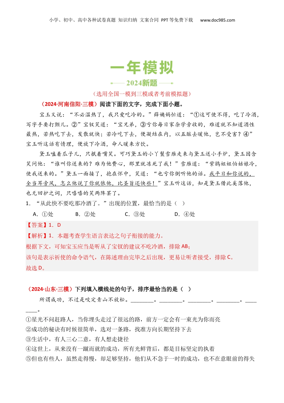 小学、初中、高中各种试卷真题知识归纳文案合同PPT等免费下载www.doc985.com专题10语句衔接(2022·天津卷)阅读下面一段文字,完成下面小题。在立春之日的“一片雪花”中拉开帷幕,在()的早春时节挥手道别。中国“言必信,行必果”,为世界奉献了一届()、安全、精彩的冬奥盛会,也让世界看到了“一个坚韧不拔、欣欣向荣的中国”。在开、闭幕式上,观众们目睹了“黄河之水天上来”的震撼场景,感受了冰雪五环“破冰”而出的唯美意境,欣赏了冰鞋划过冰面的轻盈曼妙,见证了“折柳寄情”与中央光束联动演绎的浪漫缱绻……全新科技美学与中国文化艺术的完美结合,打造出空灵而又壮观的视觉盛宴。一场冰雪运动的盛会,也是一次精神力量的():从攻克尖端技术难题的科研团队,到挥洒汗水的冬奥场馆建设者;从助力冰雪运动推广的农民滑雪队,到热情迎接四海宾朋的志愿者……无数人的默默奉献,共同成就了奥运盛事。北京冬奥会成功举办的意义,,为动荡不安的世界带来了信心和希望。(取材于《人民日报》、新华社的相关报道)2.下列填入文中画线处的句子,最恰当的一项是()A.不仅在于向世界发出了“一起向未来”的邀约,而且在于不断刷新纪录、超越自我B.不仅在于不断刷新纪录、超越自我,而在于向世界发出了“一起向未来”的邀约C.不仅在于向世界发出了“一起向未来”的邀约,而在于不断刷新纪录、超越自我D.不仅在于不断刷新纪录、超越自我,而且在于向世界发出了“一起向未来”的邀约【答案】2.D【解析】2.本题考查学生语言表达之句子衔接的能力。“不仅……”应搭配“而且……”,构成递进分句,排除BC;从递进分句逻辑顺序看,“不断刷新纪录、超越自我”在前,“向世界发出……邀约”在后,排除A。故选D。小学、初中、高中各种试卷真题知识归纳文案合同PPT等免费下载www.doc985.com(选用全国一模到三模或者考前模拟题)(2024·河南信阳·三模)阅读下面的文字,完成下面小题。宝玉又说:“不必温热了,我只爱吃冷的。”薛姨妈忙道:“①这可使不得,吃了冷酒,写字手要打颤儿。②”宝钗笑道:“宝兄弟,③亏你每日家杂学旁收的,难道就不知道酒性最热,若热吃下去,发散就快;若冷吃下去,便凝结在内,以五脏去暖他,岂不受害?④”宝玉听这话有情理,便放下冷酒,命人暖来方饮。黛玉嗑着瓜子儿,只抿着嘴笑。可巧黛玉的小丫鬟雪雁走来与黛玉送小手炉,黛玉因含笑问他:“谁叫你送来的?难为他费心,那里就冻死了我!”雪雁道:“紫鹃姐姐怕姑娘冷,使我送来的。”黛玉一面接了,抱在怀中,笑道:“也亏你倒听他的话。我平日和你说的,全当耳旁风,怎么他说了你就依他,比圣旨还快些!”宝玉听这话,知是黛玉借此奚落他,也无回护之词,只嘻嘻的笑两阵罢了。1.“从此快不要吃那冷酒了。”出现的位置,最恰当的是()A.①处B.②处C.③处D.④处【答案】1.D【解析】1.本题考查学生语言表达之句子衔接的能力。根据下文,可知宝玉应当是听从了宝钗的建议不吃冷酒,排除AB;该句是表示祈使的命令语气,在陈述理由完毕之后出现,更易让听者接受,排除C。故选D。(2024·山东·三模)下列填入横线处的句子,排序最恰当的是()所谓成功,不过是咬定青山不放松。________。________。________。________。________。①星光不问赶路人,当你埋头走过了很远的路,前方一定会有一束光为你而亮②成功的秘诀有时候很简单,选对一条路,找准方向长期坚持下去③生活中,有人三心二意,有人想走捷径④这世上,从来没有一蹴而就的成功,所有光鲜背后,都是目标坚定的执着⑤但也有些人,虽然走得慢,却足够坚持,他们从不急于一时的成功,也不在意眼前的得失小学、初中、高中各种试卷真题知识归纳文案合同PPT等免费下载www.doc985.comA.④③⑤②①B.⑤③④①②C.③⑤②④①D.①②④③⑤【答案】A【详解】本题考查学生语言表达之句子衔接排序的能力。文段讨论的是如何成功。④是观点句,强调“目标坚定的执着”;③和⑤都在说“有些人”的做法,二者形成对比,由“但”可知⑤在③后;②是总结句,其中的“坚持”呼应观点句④中的“目标坚定的执着”;①是最后的鼓舞,“星光...