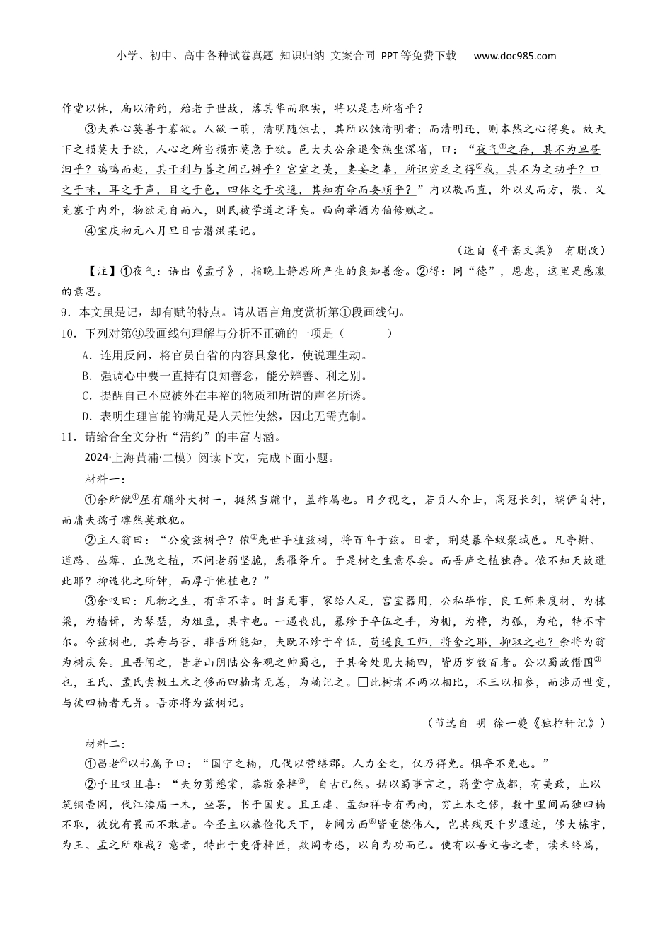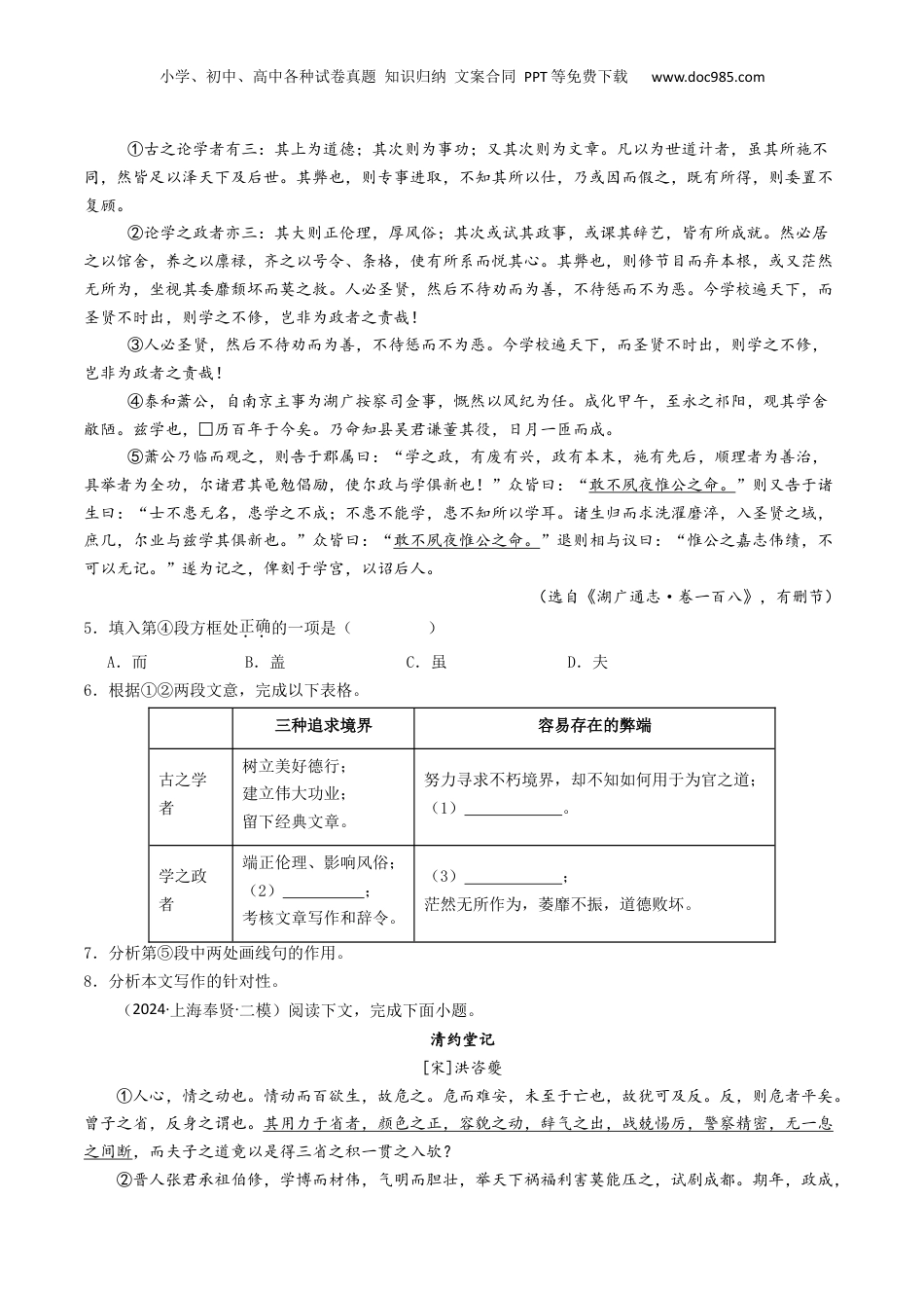 小学、初中、高中各种试卷真题知识归纳文案合同PPT等免费下载www.doc985.com考点06杂记文言文(核心考点精讲精练)下最新模拟试题演练及高考春考真题解析(2024·上海黄浦·三模)阅读下文,完成下面小题。强斋记(元)王沂①宋君文野将归关东,筑环堵之室於先庐之阳,翳蓬藿而居焉,而命之曰“强”。谒余,言其故。②余谓君年七十,将隐矣,而其志不自足如此。昔卫武公年数九十有五,犹箴儆①于国,作《抑》戒以自儆也。君子之于道盖终身焉,不以壮耄而勤惰也。此其所以自强不息也欤?③强,有以胜人之谓也。以君之博学洽闻,驰骋以惊世者谓之强邪?以君之廉介刚直,不以一毫挫于人者谓之强邪?由前则为夸,由后则为傲,吾知君不为是也,亦曰勉于德而已。古之君子养其德之刚以胜其欲之私,足乎内,无待乎外。夫然故富贵不能淫,贫贱不能忧,行乎患难而不屈,临乎死生而不惧,居天下之广居,行天下之大道,此其所以为君子也邪!④□□,卫武公不云乎:“相在尔室,尚不愧于屋漏。②”故君子慎其独也。《传》曰:“君子庄敬曰强。”敬,其慎独之本也。夫以宋君乡道之勤,进德之勇,老而益壮,其为君子之自强也,孰御焉?故余嘉其志而乐为之书。(选自《全元文卷一八二九》)【注】①箴儆:规戒。②相在尔室,尚不愧于屋漏:出自《诗经·大雅·抑》,朱熹《诗集传》曰:“卫武公作此诗,使人日诵于其侧以自警”。1.可填入第④段方框处的虚词是()。A.虽然B.然则C.既而D.因而2.第②④段两次提及卫武公,请分析这样写的作用。3.对文章理解正确的一项是()。A.宋君归关东后,在旧居辟了一间房间,命名为“强斋”。B.在作者眼里,宋君并不是一个博学洽闻、廉介刚直的人。C.古代君子能够做到“足乎内,无待乎外”,就是慎独之意。D.全文都是从“修身进德”的角度展开对于“强”的分析。4.文章对“强”的认识逐层深化,请简要分析。(2024·上海浦东新·三模)阅读下文,完成各题。祁阳县重修儒学记[明]李东阳小学、初中、高中各种试卷真题知识归纳文案合同PPT等免费下载www.doc985.com①古之论学者有三:其上为道德;其次则为事功;又其次则为文章。凡以为世道计者,虽其所施不同,然皆足以泽天下及后世。其弊也,则专事进取,不知其所以仕,乃或因而假之,既有所得,则委置不复顾。②论学之政者亦三:其大则正伦理,厚风俗;其次或试其政事,或课其辞艺,皆有所成就。然必居之以馆舍,养之以廪禄,齐之以号令、条格,使有所系而悦其心。其弊也,则修节目而弃本根,或又茫然无所为,坐视其委靡颓坏而莫之救。人必圣贤,然后不待劝而为善,不待惩而不为恶。今学校遍天下,而圣贤不时出,则学之不修,岂非为政者之责哉!③人必圣贤,然后不待劝而为善,不待惩而不为恶。今学校遍天下,而圣贤不时出,则学之不修,岂非为政者之责哉!④泰和萧公,自南京主事为湖广按察司佥事,慨然以风纪为任。成化甲午,至永之祁阳,观其学舍敝陋。兹学也,□历百年于今矣。乃命知县吴君谦董其役,日月一匝而成。⑤萧公乃临而观之,则告于郡属曰:“学之政,有废有兴,政有本末,施有先后,顺理者为善治,具举者为全功,尔诸君其黾勉倡励,使尔政与学俱新也!”众皆曰:“敢不夙夜惟公之命。”则又告于诸生曰:“士不患无名,患学之不成;不患不能学,患不知所以学耳。诸生归而求洗濯磨淬,入圣贤之域,庶几,尔业与兹学其俱新也。”众皆曰:“敢不夙夜惟公之命。”退则相与议曰:“惟公之嘉志伟绩,不可以无记。”遂为记之,俾刻于学宫,以诏后人。(选自《湖广通志·卷一百八》,有删节)5.填入第④段方框处正确的一项是()A.而B.盖C.虽D.夫6.根据①②两段文意,完成以下表格。三种追求境界容易存在的弊端古之学者树立美好德行;建立伟大功业;留下经典文章。努力寻求不朽境界,却不知如何用于为官之道;(1)。学之政者端正伦理、影响风俗;(2);考核文章写作和辞令。(3);茫然无所作为,萎靡不振,道德败坏。7.分析第⑤段中两处画线句的作用。8.分析本文写作的针对性。(2024·上海奉贤·二模)阅读下文,完成下面小题。清约堂记[宋]洪咨夔①人心,情之动也。情动而百欲生,...