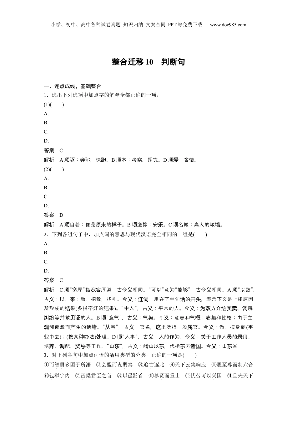 小学、初中、高中各种试卷真题知识归纳文案合同PPT等免费下载www.doc985.com整合迁移10判断句一、连点成线,基础整合1.选出下列选项中加点字的解释全都正确的一项。(1)()A.B.C.D.答案C解析A:奔,快。项驱驰跑B本:考察,探究。项D:吝惜。项爱(2)()A.B.C.D.答案D解析A自若:像是原的子。项来样B逸豫:安。项乐C名城:高大的城。项墙2.下列各组句子中,加点词的意思与现代汉语完全相同的一组是()A.B.C.D.答案C解析C项“厚宽”指容厚道,古今相同。宽义“可以”意为“能够”,古今相同。义A项“以致”,古:以,;致,招致,招引。今:,用在下半句的,表示下文是上述原因义来义连词话开头所形成的果结(多指不好的果结)。“中人”,古:平常的人。今:方介、解义义为双绍买卖调等做的人。纠纷并见证B项“意气”,古:。今:意志和;志趣和性格;由于主义气势义气概和偏激而生的情。观产绪“事从”,古:官名,里泛指一般官。今:做,投身到义这属义(事中去业);(按某法种办)理。处D项“人事”,古:人的作。今:于工作人的用、义为义关员录培、配、等工作。养调奖惩“山东”,古:崤山以,代指方。今:山省。义东东诸国义东3.对下列各句中加点词语的活用类型的分类,正确的一项是()①而智勇多困于所溺②会盟而谋弱秦③追亡逐北④天下云集响应⑤履至尊而制六合⑥包举宇内⑦函梁君臣之首⑧以愚黔首⑨尊贤而重士⑩忧劳可以兴国⑪且夫天下小学、初中、高中各种试卷真题知识归纳文案合同PPT等免费下载www.doc985.com非小弱也A.①⑨⑪/②③/⑧⑩/④⑤⑥⑦B.①⑨/②⑧⑩/③/④⑥/⑤⑦/⑪C.①②⑧/③/④⑥/⑤⑪/⑦/⑨⑩D.①⑨⑪/②⑧⑩/③④⑥/⑤⑦答案B解析①⑨均形容作名,为词词②⑧⑩均使用法,为动③作名,为动词词④⑥均名作为词状,语⑤⑦均名作,为词动词⑪形容作。为词动词4.下列各组句子中,句式不相同的一组是()A.B.C.D.答案A解析A定后置句项语/后置句。状语B均判句。项为断C均被句。项为动D均后置项为状语句。二、连点成线,微点突破重点句式——判断句(1)请判断下列句子是否为判断句,若是判断句请指出其为哪种类型。①然陈涉瓮牖绳枢之子,氓隶之人,而迁徙之徒也(《过秦论》):______________________②不足为外人道也(《桃花源记》):________________________________________________③燕王吾所立(《五代史伶官传序》):______________________________________________④非臣陨首所能上报(《陈情表》):________________________________________________⑤然是说也,余尤疑之(《石钟山记》):_______________________________________________⑥梁,吾仇也(《五代史伶官传序》):________________________________________________⑦故木受绳则直(《劝学》):________________________________________________________⑧哙即带剑拥盾入军门(《鸿门宴》):________________________________________________⑨今其智乃反不能及(《师说》):___________________________________________________⑩此则岳阳楼之大观也(《岳阳楼记》):_______________________________________________⑪此诚危急存亡之秋也(《出师表》):______________________________________________小学、初中、高中各种试卷真题知识归纳文案合同PPT等免费下载www.doc985.com___⑫当立者乃公子扶苏(《陈涉世家》):________________________________________________⑬如今人方为刀俎,我为鱼肉(《鸿门宴》):____________________________________________⑭自言本是京城女(《琵琶行并序》):________________________________________________⑮师者,所以传道受业解惑也(《师说》):_____________________________________________答案①“也”表判断②不是③直接判断④“非”表判断⑤不是⑥“也”表判断⑦不是⑧不是⑨不是⑩“则”表判断⑪“诚”表判断⑫“乃”表判断⑬“为”表判断⑭“是”表判断⑮“……者,……也”表判断判句作文言特殊句式,是文言文最常的句式之一,可分有志的判句和断为见它为标词断无志的判句。标词断(1)有志的判句:用助,如上面的标词断词①⑥⑮;用副,如上...