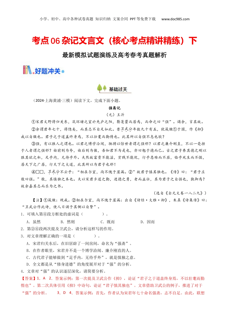 小学、初中、高中各种试卷真题知识归纳文案合同PPT等免费下载www.doc985.com考点06杂记文言文(核心考点精讲精练)下最新模拟试题演练及高考春考真题解析(2024·上海黄浦·三模)阅读下文,完成下面小题。强斋记(元)王沂①宋君文野将归关东,筑环堵之室於先庐之阳,翳蓬藿而居焉,而命之曰“强”。谒余,言其故。②余谓君年七十,将隐矣,而其志不自足如此。昔卫武公年数九十有五,犹箴儆①于国,作《抑》戒以自儆也。君子之于道盖终身焉,不以壮耄而勤惰也。此其所以自强不息也欤?③强,有以胜人之谓也。以君之博学洽闻,驰骋以惊世者谓之强邪?以君之廉介刚直,不以一毫挫于人者谓之强邪?由前则为夸,由后则为傲,吾知君不为是也,亦曰勉于德而已。古之君子养其德之刚以胜其欲之私,足乎内,无待乎外。夫然故富贵不能淫,贫贱不能忧,行乎患难而不屈,临乎死生而不惧,居天下之广居,行天下之大道,此其所以为君子也邪!④□□,卫武公不云乎:“相在尔室,尚不愧于屋漏。②”故君子慎其独也。《传》曰:“君子庄敬曰强。”敬,其慎独之本也。夫以宋君乡道之勤,进德之勇,老而益壮,其为君子之自强也,孰御焉?故余嘉其志而乐为之书。(选自《全元文卷一八二九》)【注】①箴儆:规戒。②相在尔室,尚不愧于屋漏:出自《诗经·大雅·抑》,朱熹《诗集传》曰:“卫武公作此诗,使人日诵于其侧以自警”。1.可填入第④段方框处的虚词是()。A.虽然B.然则C.既而D.因而2.第②④段两次提及卫武公,请分析这样写的作用。3.对文章理解正确的一项是()。A.宋君归关东后,在旧居辟了一间房间,命名为“强斋”。B.在作者眼里,宋君并不是一个博学洽闻、廉介刚直的人。C.古代君子能够做到“足乎内,无待乎外”,就是慎独之意。D.全文都是从“修身进德”的角度展开对于“强”的分析。4.文章对“强”的认识逐层深化,请简要分析。【答案】1.A2.答案示例:第一次提及卫武公作《抑》,论证“君子之于道盖终身焉,不以壮耄而勤惰也”。第二次具体引用《抑》中诗句,论证“君子慎其独也”。文章借助卫武公的例子,推进了对于“强”的分析。3.D4.答案示例:首先,作者认为宋君年七十命名强斋,志不自足。由此,联想小学、初中、高中各种试卷真题知识归纳文案合同PPT等免费下载www.doc985.com到卫武公九十五作《抑》,论证强的第一层含义:自强不息。其次,先解释强的意思“有以胜人”,然后借助对于夸和傲的批驳,得出强的含义是“勉于德”,“养其德之刚以胜其欲之私”。最后,通过引用《抑》,进一步在勉于德的基础上提出了,君子要慎独,慎独的关键是敬。文章由“自强不息”到“勉于德”到“慎独”到“敬”,层层深入,围绕进德修身充分展开对于“强”的分析。【解析】1.本题考查学生理解虚词意义和用法的能力。A.上文强调君子可以靠自身独处实现追求,后文强调“慎独”,前后意思相反(转折),所以填“虽然”,即使这样,但是……。B.既然这样,那么,表因果;C.时间连词,不久;D.因此、所以,表因果关系。故选A。2.本题考查学生理解分析段落作用的能力。第一次提及内容是“昔卫武公年数九十有五,犹箴儆于国,作《抑》戒以自儆也”,用卫武公作《抑》这件事,论证后文“君子之于道盖终身焉,不以壮耄而勤惰也”,列举名人事例,增强说服力和可信度。第二次相关内容是“卫武公不云乎:‘相在尔室,尚不愧于屋漏’”,使用引证法,论证后文结论“故君子慎其独也”。引用不仅丰富文本内容,而且推进了对于“强”的分析,节省自己的笔墨,借助他山之石使论证更有力。3.本题考查学生分析文章内容的能力。A.“归关东后”错误。开头句说的是“宋君文野将归关东”,意思是将要,即将来时,选项表述成过去式,时态有误。B.“并不是”错误。曲解文意,原文信息是“以君之博学洽闻”“以君之廉介刚直”,可见作者眼里,宋君博学洽闻、廉介刚直。C.“能够做到‘足乎内,无待乎外’,就是慎独”错误。曲解文意,第三段说的是只要内心做好,与外界无关,也就是可以独处,而第四段却说“慎独”,两段内容正好相左,即“足乎内,无待乎外”(可以独处)与“慎独”(谨慎独处)表意...