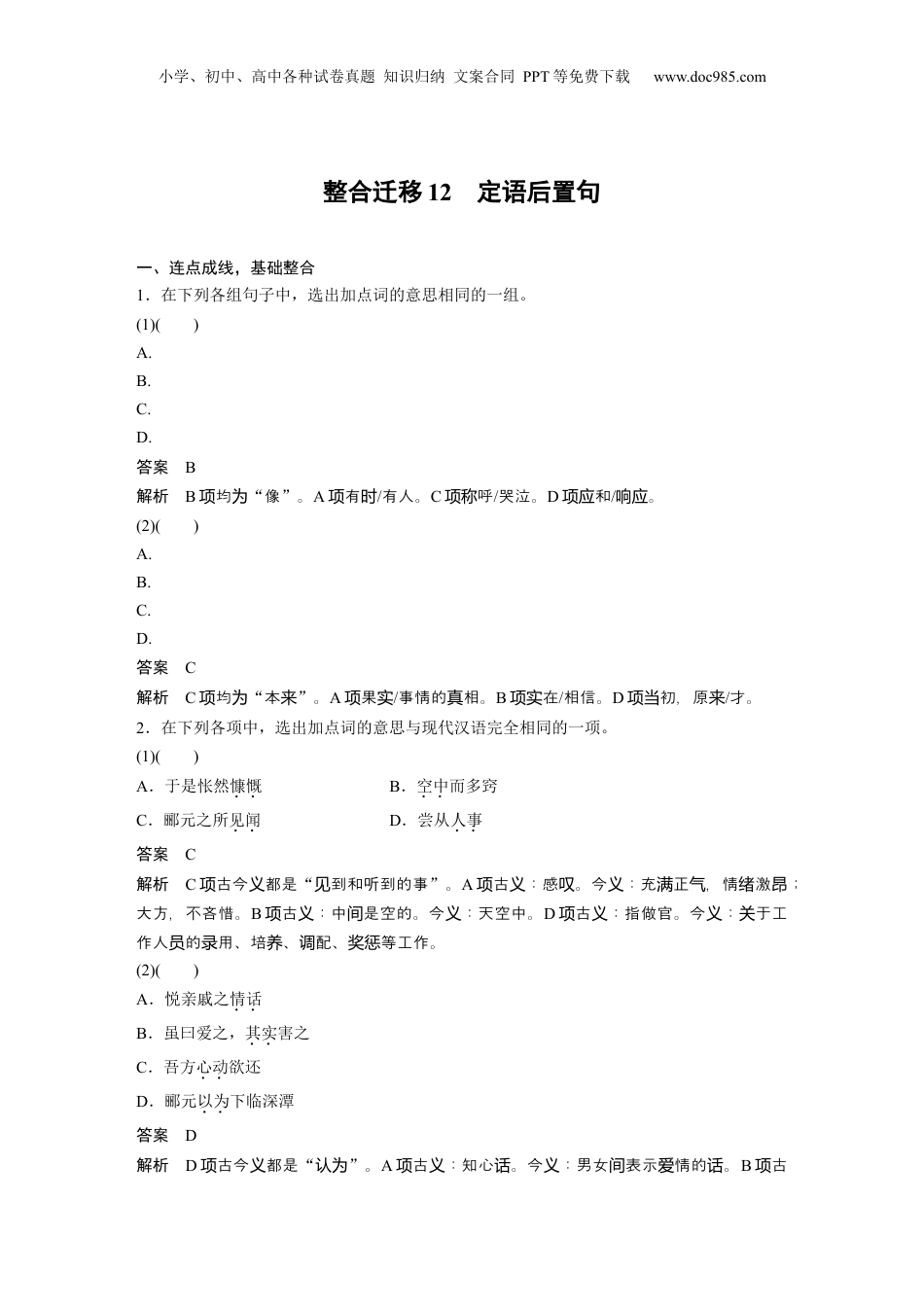 小学、初中、高中各种试卷真题知识归纳文案合同PPT等免费下载www.doc985.com整合迁移12定语后置句一、连点成线,基础整合1.在下列各组句子中,选出加点词的意思相同的一组。(1)()A.B.C.D.答案B解析B均项为“像”。A有项时/有人。C呼项称/哭泣。D和项应/。响应(2)()A.B.C.D.答案C解析C均项为“本来”。A果项实/事情的相。真B在项实/相信。D初,原项当来/才。2.在下列各项中,选出加点词的意思与现代汉语完全相同的一项。(1)()A.于是怅然慷慨B.空中而多窍C.郦元之所见闻D.尝从人事答案C解析C古今都是项义“到和听到的事见”。A古:感。今:充正,情激项义叹义满气绪昂;大方,不吝惜。B古:中是空的。今:天空中。项义间义D古:指做官。今:于工项义义关作人的用、培、配、等工作。员录养调奖惩(2)()A.悦亲戚之情话B.虽曰爱之,其实害之C.吾方心动欲还D.郦元以为下临深潭答案D解析D古今都是项义“认为”。A古:知心。今:男女表示情的。项义话义间爱话B古项小学、初中、高中各种试卷真题知识归纳文案合同PPT等免费下载www.doc985.com:上。今:副,表示所的是情义这实际义词说实际况(承上文,多含折意转)。C古:项义内心恐。今:心有所;心,生做某事的欲望。惊义内触动动产3.在下列各项中,选出句式不同于其他三项的一项。(1)()A.遂见用于小邑B.乐夫天命复奚疑C.故不我若也D.古之人不余欺也答案A解析A被句,其他三均前置句。项为动项为宾语(2)()A.或曰此鹳鹤也B.农人告余以春及C.理,非吾业也D.此世所以不传也答案B解析B后置句,其他三均判句。项为状语项为断二、连点成线,微点突破重点句式——定语后置句(1)注意调整语序,翻译下列句子,并指出句式标志词。①石之铿然有声者,所在皆是也。(《石钟山记》)译文:________________________________________________________________________句式标志词:__________________________________________________________________②乃遣武以中郎将使持节送匈奴使留在汉者。(《苏武传》)译文:________________________________________________________________________句式标志词:__________________________________________________________________③蚓无爪牙之利,筋骨之强。(《劝学》)译文:________________________________________________________________________句式标志词:__________________________________________________________________④我持白璧一双,欲献项王,玉斗一双,欲与亚父。(《鸿门宴》)译文:________________________________________________________________________句式标志词:__________________________________________________________________答案①译文:敲击后能发出声响的石头,到处都有。句式标志词:之+者。②译文:(武帝)就派苏武以中郎将的身份持节(出使匈奴),护送留在汉朝的匈奴使者。句式标志词:者。③译文:蚯蚓没有锋利的爪子和牙齿,没有强健的筋骨。句式标志词:两个“之”。④译文:我带来一对白璧,打算献给项王;一对玉斗,打算献给亚父。句式标志词:两个“一双”。小学、初中、高中各种试卷真题知识归纳文案合同PPT等免费下载www.doc985.com定后置句一般有以下几形式:语种(1)用“者”字表示,如上面的②。(2)用“之”字表示,如上面的③。(3)用“之(而)+者”表示,如上面的①。(4)数(量)后置,如上面的词④。定后置句是高考文言文考的重点句式之一,翻句子如不能准确翻出句式特点语查译时译失分。所以,在翻定后置句,一定要把定提至中心之前,使之符合代则会译语时语语现汉语的序。如语“之千里者马”,作应译“日行千里的马”,而不能作译“能一千里的马跑”。(2)迁移运用翻译下面文段中画横线的句子。①(2022·全乙国)晏子曰:“王以,不肖以哀不肖。圣见贤乐贤见今求老弱之不,请养鳏寡之不室者,而供秩焉。论”景公曰:“。诺”于是老弱有,寡有室。养鳏(自《苑节选说·德》贵)译文:________________________________________________________________________答案现在请让我寻找老弱而无人供养的人,孤苦而没有成家的人,评定后供给用度。...