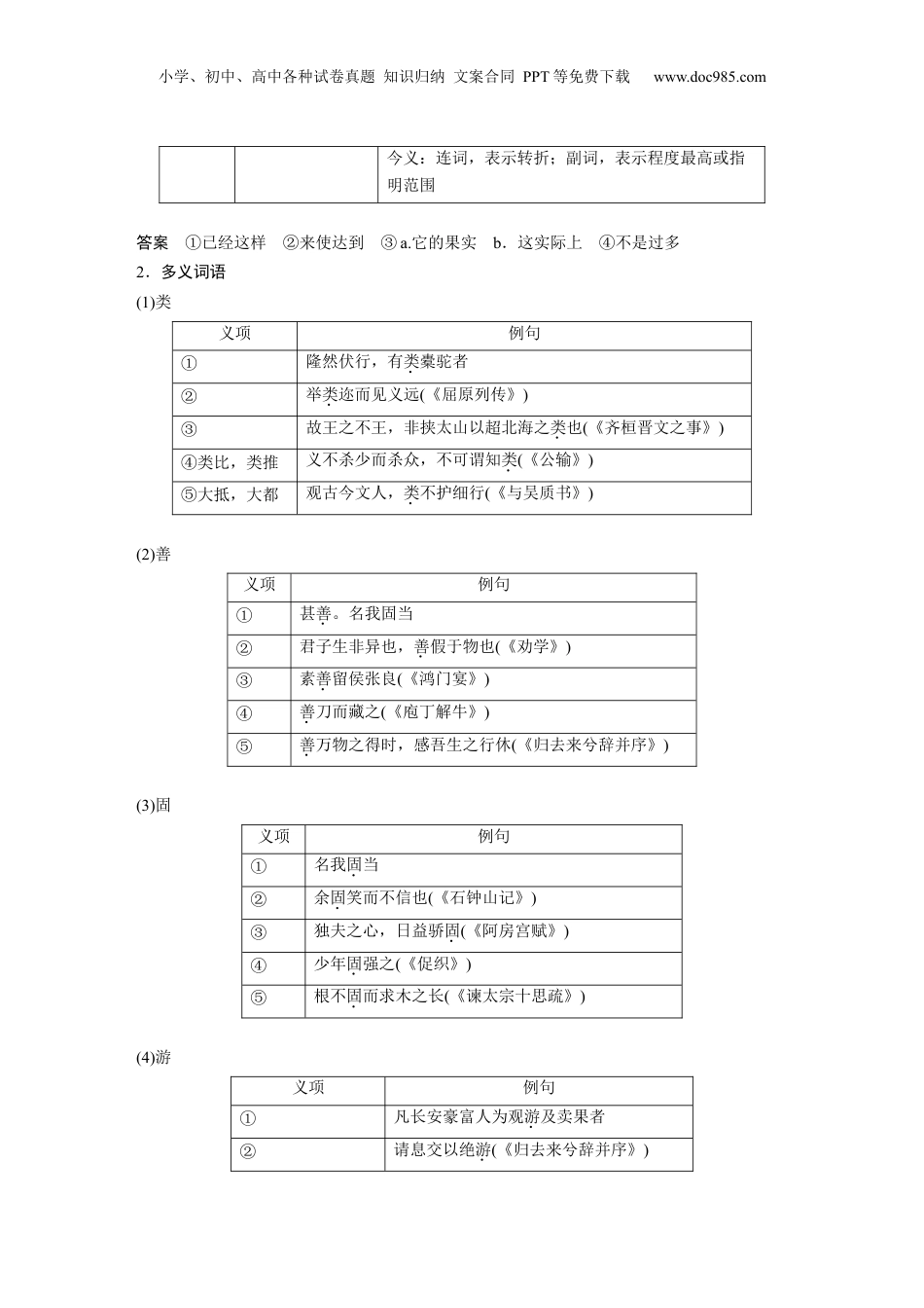 小学、初中、高中各种试卷真题知识归纳文案合同PPT等免费下载www.doc985.com单篇梳理5种树郭橐驼传通读全文,解释加点的词语。(第1段)郭橐,不知驼始①()何名。病偻②(),隆然伏行,有橐类者,故人之驼乡号“驼”。之曰:驼闻“甚善。名我固。当”因舍其名,亦自谓“橐驼”云。(第2段)其曰丰,在安西。,凡安豪富人游及果者,皆迎乡乐乡长驼业种树长为观卖争取养①()。所,或移徙,无不活;且茂,早视驼种树硕实以②()蕃③()。他植者伺虽窥效慕④(),莫能如⑤()也。(第3段)有之,曰:问对“橐非能使木且驼寿孳①()也,能木之天,以致其顺性焉尔。凡植木之性,其本欲舒②(),其培③()欲平,其土欲故④(),其筑⑤()欲密⑥()。然已,勿勿,去不既动虑复顾⑦()。其莳⑧()也若子,其置⑨()也若弃,其天者全而其则性⑩()得矣。故吾不害⑪()其而已,非有能茂之也;不抑耗其而已,非有能早而蕃长硕实之也。他植者不然。根则拳⑫()而土易,其培之也,若不焉不及。苟有能反过则是者,又之太恩,之太勤。旦而暮,则爱忧视抚已⑬()去而。甚者,爪其复顾肤以验⑭()其生枯,其本以其疏密,而木之性日以离矣。曰之,其害之摇观虽爱实;曰之,其仇之;故不我若也。吾又何能哉!虽忧实为”(第4段)者曰:问“以子之道①(),移之官理②(),可乎?”曰驼:“我知而已,理,非吾也。然吾居,种树业乡见人者长③()好其令,若甚怜焉烦,而卒以。旦暮吏而呼曰:祸来‘官命促尔耕,勖④()尔植,督⑤()尔获⑥(),早缫⑦()而⑧()绪⑨(),早而织缕⑩(),字⑪()而幼孩,遂⑫()而鸡豚⑬()。’鼓而聚之,木鸣击而召之。吾小人飧饔以吏者,且不得暇,又何以蕃吾生而安吾性耶?故辍劳病⑭()且怠⑮()。若是,吾者则与业其⑯()亦有乎?类”(第5段)者曰:问“嘻,不亦善夫!吾,得人。问养树养术”其事以官戒也。传为答案(第1段)①当初,原来②脊背弯曲(第2段)①用,使②且③多④仿效⑤比得上(第3段)①繁殖②舒展③培土④旧,指原来培育树苗的土⑤捣土⑥结实⑦照看⑧栽种⑨放下⑩本性⑪妨害⑫拳曲,伸展不开⑬已经⑭察看,检验(第4段)①方法②做官治民。理,治③做官的。长,统治、治理;人,民④勉励⑤小学、初中、高中各种试卷真题知识归纳文案合同PPT等免费下载www.doc985.com督促⑥收割⑦把蚕茧浸在热水里抽出蚕丝⑧你们的⑨丝头⑩线⑪养育⑫成,养好⑬小猪⑭困苦⑮疲倦⑯表示推测,相当于“大概”[记忆导图]1.古今异义词词语例句今义①既然既然已古义:_____________________________今义:连词,用在上半句,下半句往往有“就、也、还”跟它呼应,表示先对现实或已有的结论予以承认,而后进一步做出判断②以致能顺木之天,以致其性焉尔古义:___________________________今义:连词,用在下半句话的开头,表示下文是上述原因所形成的结果(多指不好的结果)③其实a.不抑耗其实而已b.虽曰爱之,其实害之古义:a._____________________________b.________________________________今义:副词,表示所说的是实际情况(承上文,多含转折意)④不过若不过焉则不及古义:______________________________小学、初中、高中各种试卷真题知识归纳文案合同PPT等免费下载www.doc985.com今义:连词,表示转折;副词,表示程度最高或指明范围答案①已经这样②来使达到③a.它的果实b.这实际上④不是过多2.多义词语(1)类义项例句①隆然伏行,有类橐驼者②举类迩而见义远(《屈原列传》)③故王之不王,非挟太山以超北海之类也(《齐桓晋文之事》)④类比,类推义不杀少而杀众,不可谓知类(《公输》)⑤大抵,大都观古今文人,类不护细行(《与吴质书》)(2)善义项例句①甚善。名我固当②君子生非异也,善假于物也(《劝学》)③素善留侯张良(《鸿门宴》)④善刀而藏之(《庖丁解牛》)⑤善万物之得时,感吾生之行休(《归去来兮辞并序》)(3)固义项例句①名我固当②余固笑而不信也(《石钟山记》)③独夫之心,日益骄固(《阿房宫赋》)④少年固强之(《促织》)⑤根不固而求木之长(《谏太宗十思疏》)(4)游义项例句①凡长安豪富人为观游及卖果者②请息交以绝游(《归去来兮辞并序》)小学、初中、高中各种试卷真题知识归纳文案合同PPT等免费下载www.doc985...