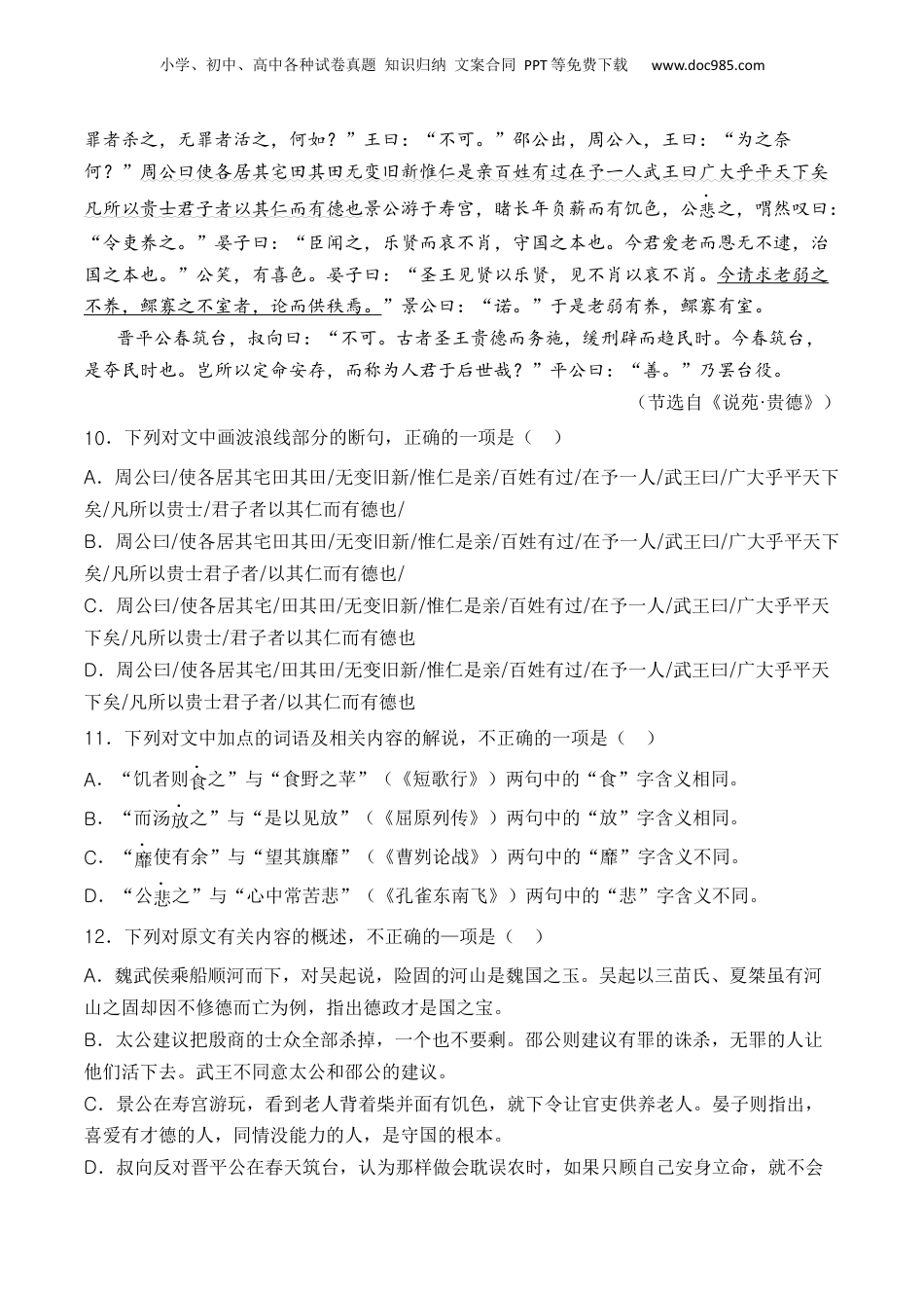 小学、初中、高中各种试卷真题知识归纳文案合同PPT等免费下载www.doc985.com专题02议论类(2024·全国甲卷)阅读下面的文言文,完成各题。人才莫盛于三国,亦惟三国之主各能用人,故得众力相扶,以成鼎足之势。而其用人亦各有不同者,大概曹操以权术相驭,刘备以性情相契,孙氏兄弟以意气相投。刘备为吕布所袭奔于操程昱以备有雄才劝操图之。操曰:“今收揽英雄时,杀一人而失天下之心,不可也。”然此犹非与操有怨者。臧霸先从陶谦,后助吕布,布为操所擒,霸藏匿,操募得之,即以霸为琅邪相。先是操在兖州,以徐翕、毛晖为将,兖州乱,翕、晖皆叛,后操定兖州,翕、晖投霸。至是,操使霸出二人,霸曰:“霸所以能自立者,以不为此也。”操叹其贤。盖操当初起时,方欲藉众力以成事,故以此奔走天下。及其削平群雄,势位已定,则孔融、许攸等,皆以嫌忌杀之。荀彧素为操谋主,亦以其阻九锡而胁之死。然后知其雄猜之性久而自露,而从前之度外用人,特出于矫伪,以济一时之用,所谓以权术相驭也。至刘备,一起事即为人心所向。观其三顾诸葛,咨以大计,独有傅岩爰立之风。关、张、赵云,自少结契,终身奉以周旋,即羁旅奔逃,无寸土可以立业,而数人者患难相随,别无贰志。此固数人者之忠义,而备亦必有深结其隐微而不可解者矣。至托孤于亮,曰:“嗣子可辅,辅之;不可辅,则君自取之。”千载下犹见其肝膈本怀,岂非真性情之流露?亮第一流人,二国俱不能得,备独能得之,亦可见以诚待人之效矣。至孙氏兄弟之用人,亦自有不可及者。孙策生擒太史慈,即解其缚曰:“子义青州名士,但所托非人耳。孤是卿知己,勿忧不如意也。”此策之得士也。陆逊镇西陵,权刻印置逊所,每与刘禅、诸葛亮书,常过示逊,有不安者,便令改定,以印封行之。委任如此,臣下有不感知遇而竭心力者乎?陆逊晚年为杨竺等所谮,愤郁而死。权后见其子抗,泣曰:“吾前听谗言,与汝父大义不笃,以此负汝。”以人主而自悔其过,开诚告语如此,其谁不感泣?此孙氏兄弟之用人,所谓以意气相感也。(节选自赵翼《廿二史札记》卷七)10.文中画波浪线的部分有三处需要断句,请用铅笔将答题卡上相应位置的答案标号涂黑。小学、初中、高中各种试卷真题知识归纳文案合同PPT等免费下载www.doc985.com刘备为吕布A所袭B奔C于操D程昱E以备F有雄才G劝操H图之。11.下列对文中加点的词语及相关内容的解说,不正确的一项是()A.藉,凭借、借助,与《陈涉世家》中“藉第令毋斩”的“藉”意思相同。B.即,即使,与《桃花源记》中“太守即遣人随其往”的“即”意思不同。C.固,固然,与《赤壁赋》中“固一世之雄也,而今安在哉”的“固”意思相同。D.但,只是,与《记承天寺夜游》中“但少闲人如吾两人者耳”的“但”意思相同。12.下列对原文有关内容的概述,不正确的一项是()A.臧霸曾为吕布效力,曹操擒捉吕布以后,臧霸为避祸藏匿起来;后来他又被曹操捕获,曹操不计前嫌,对他委以重任,任命他为琅邪相。B.曹操初起时为图霸业,能笼络人才,甚至能任用曾与己有怨者;势位已定时则猜忌异己,滥杀无辜。这正是其用人“以权术相驭”的表现。C.刘备以性情结交忠义之士,以诚待人,故能深得人心;刘备创业过程中多次遭遇挫折,但诸葛亮及关、张、赵云等人患难相随,忠贞不渝。D.陆逊镇守西陵时,深得孙权信任,孙权给刘禅、诸葛亮写信,常常给陆逊看,有不妥之处就让他改定;到了晚年,陆逊遭到谗害,郁郁而终。13.把文中画横线的句子翻译成现代汉语。(1)操使霸出二人,霸曰:“霸所以能自立者,以不为此也。”(2)吾前听谗言,与汝父大义不笃,以此负汝。(2022·全国乙卷)阅读下面的文言文,完成下面小题。圣人之于天下百姓也,其犹赤子乎!饥者则食之,寒者则衣之,将之养之,育之长之,唯恐其不至于大也。魏武侯浮西河而下,中流,顾谓吴起曰:“美哉乎河山之固也,此魏国之宝也。”吴起对曰:“在德不在险。昔三苗氏左洞庭而右彭蠡,德义不修,而禹灭之。夏桀之居,左河、济而右太华,伊阙在其南,羊肠在其北,修政不仁,而汤放之。由此观之,在德不在险。若君不修德,船中之人尽敌国也。”武侯曰:“善”。武王...