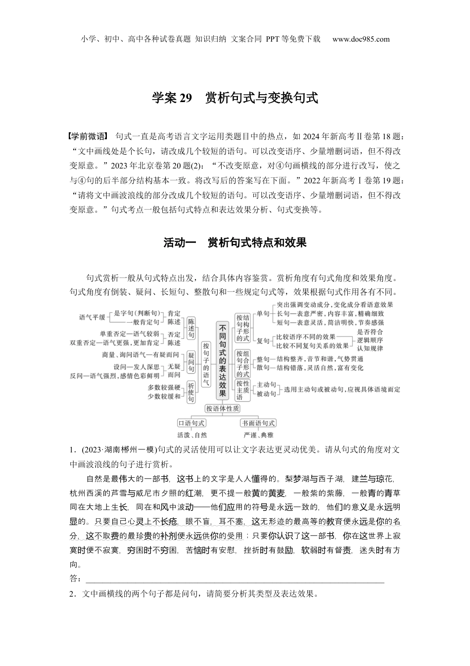 小学、初中、高中各种试卷真题知识归纳文案合同PPT等免费下载www.doc985.com学案29赏析句式与变换句式学前微语句式一直是高考语言文字运用类题目中的热点,如2024年新高考Ⅱ卷第18题:“文中画线处是个长句,请改成几个较短的语句。可以改变语序、少量增删词语,但不得改变原意。”2023年北京卷第20题(2):“不改变原意,对④句画横线的部分进行改写,使之与④句的后半部分结构基本一致。将改写后的答案写在下面。”2022年新高考Ⅰ卷第19题:“请将文中画波浪线的部分改成几个较短的语句。可以改变语序、少量增删词语,但不得改变原意。”句式考点一般包括句式特点和表达效果分析、句式变换等。活动一赏析句式特点和效果句式赏析一般从句式特点出发,结合具体内容鉴赏。赏析角度有句式角度和效果角度。句式角度有倒装、疑问、长短句、整散句和一些规定句式等,效果根据句式作用各有不同。1.(2023·湖南郴州一模)句式的灵活使用可以让文字表达更灵动优美。请从句式的角度对文中画波浪线的句子进行赏析。自然是最大的一部,上的文字是人人得的。梨湖西子湖,建花,伟书这书懂梦与兰与琼杭州西溪的芦雪威尼市夕照的潮,更不提一般的,一般紫的紫藤,一般的草与红黄黄麦青青同在大地上生,同在和中波——他用的符是永一致的,他的意是永明长风动们应号远们义远的。显只要自己心上不,眼不盲,耳不塞,无形迹的最高等的育便永是的名灵长疮这教远你分,不取的最珍的便永供的受用这费贵补剂远你;只要了一部,在世界上寂你认识这书你这寞便不寂寞,困不困,苦有安慰,挫折有鼓,弱有督,迷失有方时穷时穷恼时时励软时责时向。答:________________________________________________________________________2.文中画横线的两个句子都是问句,请简要分析其类型及表达效果。小学、初中、高中各种试卷真题知识归纳文案合同PPT等免费下载www.doc985.com,我健佳的因素有些?除了人禀、持不懈的努力以奥运赛场国儿屡创绩哪运动员个赋坚及科的方法外,我有一学训练们还个“法宝”——上的训练场“黑科技”。中航天的国“风洞”技,能保障艇在最低阻力下劈波浪。游泳的背后,站着一位术够赛运动员斩队员“千里眼”——航系的技。行人情不自禁:导统惯导术懂赞叹“有洲技作保障,中泳际导弹术国将可能不摘金?怎”2020年上,炳添,出人的奥运会苏风驰电掣跑惊“中速度国”。其中的秘是通高科技各指行控,制性化方案。科技的力量也延诀过设备对运动员项标进监订个训练伸百姓日常生活中。晨的人佩戴智能手,追光前行;南到北疆的少年,穿进跑们运动环从国着“科技氢弹”的球鞋,汗如雨篮挥……在今天的中,已是平常的景象。这国答:________________________________________________________________________借题点拨赏析句式特点的方法:首先阅读文句,判断句式特点。(在平时的积累中,应该对一些常见句式特点有灵活的掌握。)然后根据句式,回答效果。在回答时,要结合具体内容,如分析长句之“长”重点是因为增加了哪些内容,整句之“整”体现在哪些具体内容,根据具体内容,回答其具体作用。短句、问句也要结合具体内容谈表达效果,不要仅仅套用模板。3.如果把文中画横线的句子改成“那一点微光给你温暖和慰藉,给你信心和勇气”,和原句相比哪个表达效果更好?试从句式的角度加以分析。凡俗的我在世界上行走,受到人的非和冷落是不可避免的,但我千万不能们这个别议们被批的唾沫淹向上的渴望,被冷漠的眼神封萌的激情。因我有理由相信,即使评没锁动为们黑暗无无,但有一灯火能点燃,散心上的,边际总盏为你为你驱灵阴霾暖,慰藉给你温给你,信心和勇,怕,那是一点微光。给你气哪仅仅答:________________________________________________________________________4.如果把文中画横线的句子改成“几个蓬头、赤脚、睡眼惺忪的‘懒虫’从楼上一边扣着纽扣冲下来了”,和原句相比哪个表达效果更好?请简要分析。蓬、赤脚,一扣着扣,几睡眼惺的头边纽个忪“虫懒”上冲下了。从楼来自水来龙头边了人,用手捧些水在上。挤满来浇脸“芦柴棒”着急地要大里的稀,但是倒冒出将锅饭烧滚的烟引起了...