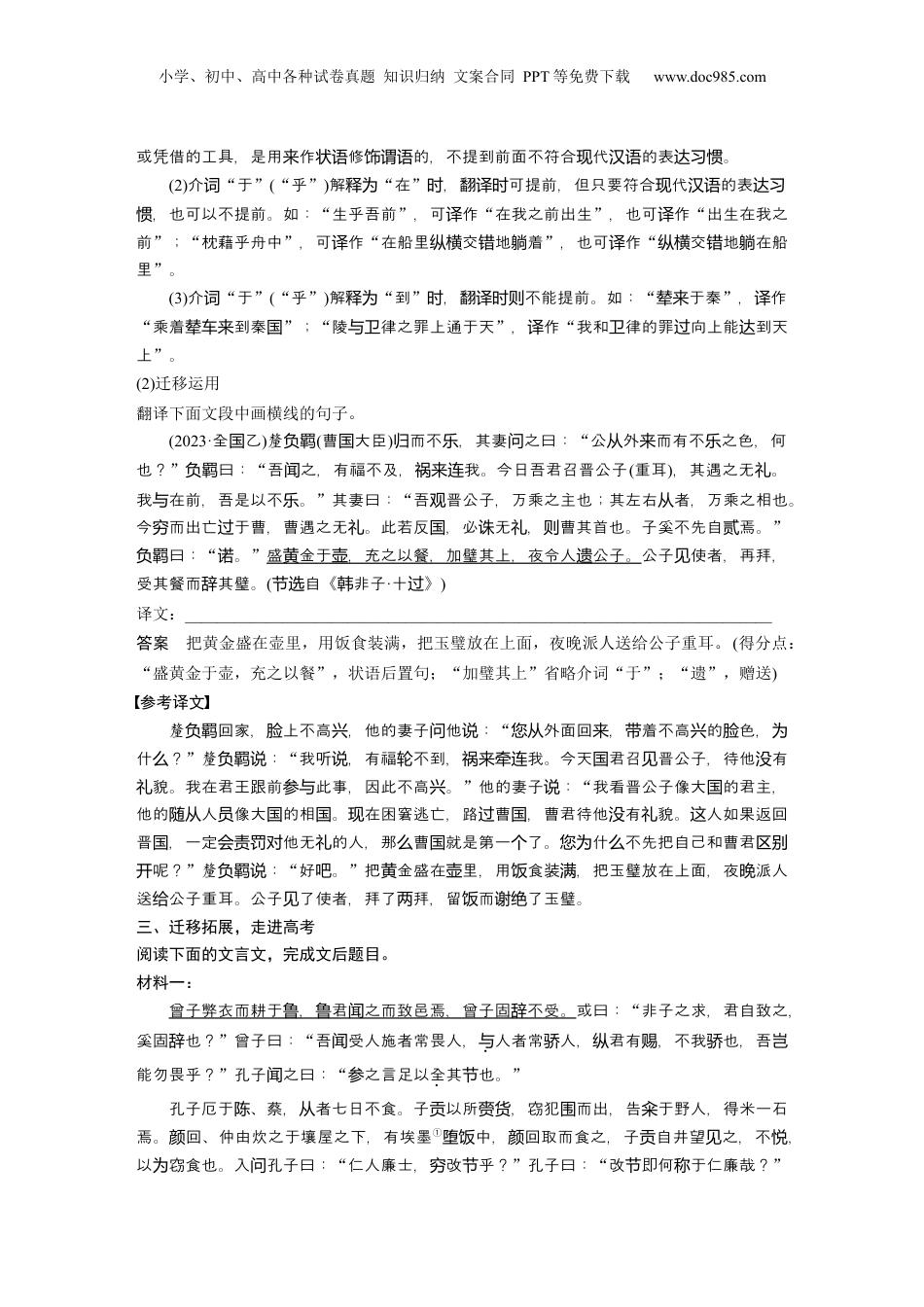 小学、初中、高中各种试卷真题知识归纳文案合同PPT等免费下载www.doc985.com整合迁移8状语后置句一、连点成线,基础整合1.选出下列选项中,加点词的意思相同的一项。(1)()A.B.C.D.答案D解析D均项为“害,害伤残”。A勤勉项/明,机智。聪B项与……看齐/使……整有序齐。C性情安和项/安然,安。稳(2)()A.B.C.D.答案B解析B均项为“行实”。A项这/就。C治项疗/攻打。D思精项虑详/用;一,考绳结缀说。虑2.下列句子中,加点词的意思与现代汉语完全相同的一项是()A.可谓好学也已B.譬如平地,虽覆一篑,进,吾往也C.民之从事,常于几成而败之D.跨者不行答案A解析A古今都是项义“喜爱学习”。B古:平洼地。今:平坦的土地。项义填义C古项义:做事。今:做,投身到义(事中去业);(按某法种办)理。处D古:行走不。今:不项义稳义可以;不被允。许3.下列各组句子中,加点词的意义和用法相同的一组是()A.B.C.小学、初中、高中各种试卷真题知识归纳文案合同PPT等免费下载www.doc985.comD.答案A解析A均名作,侍奉。项为词动词B使用法,使项动……诚/形容,。词真诚C形容作项词名,安逸的境词环/使用法,使动……安宁。D形容作,匡正项词动词/使用法,使动……端正。4.下列各组句子中,句式特点不同的一组是()A.B.C.D.答案D解析D定后置句项语/后置句。状语A均判句。项为断B均后置句。项为状语C均项为宾语前置句。二、连点成线,微点突破重点句式——状语后置句(1)将下列状语后置句中的倒装部分恢复为正常语序。①请买其方百金(《五石之瓠》):__________________________________________②请其矢,盛以锦囊(《五代史伶官传序》):________________________________③还矢先王,而告以成功(《五代史伶官传序》):____________________________④卒使上官大夫短屈原于顷襄王(《屈原列传》):____________________________⑤州司临门,急于星火(《陈情表》):______________________________________⑥月出于东山之上,徘徊于斗牛之间(《赤壁赋》):__________________________⑦生乎吾前,其闻道也固先乎吾(《师说》):________________________________⑧相与枕藉乎舟中(《赤壁赋》):___________________________________________⑨莫先乎情,莫始乎言(《与元九书》):_____________________________________⑩后秦击赵者再(《六国论》):_____________________________________________⑪将军战河北,臣战河南(《鸿门宴》):_____________________________________答案①(以)百金买其方②以锦囊盛③以成功告④于顷襄王短屈原⑤于星火急⑥月于东山之上出/于斗牛之间徘徊⑦乎吾前生/乎吾先⑧乎舟中枕藉⑨乎情先/乎言始⑩再击赵者⑪(于)河北战/(于)河南战后置句状语(介短后置句宾语)主要指由介词“于”(“乎”)“以”成的介短在文组宾语言文中大都在的位置,成代大多需要移至前作的情。在处补语译现汉语时绝数动词状语况它翻有三情:译时种况(1)“以”成的介短后置,翻必其提前。此的介短表方式、方法组宾语译时须将时宾语小学、初中、高中各种试卷真题知识归纳文案合同PPT等免费下载www.doc985.com或凭借的工具,是用作修的,不提到前面不符合代的表。来状语饰谓语现汉语达习惯(2)介词“于”(“乎”)解释为“在”,翻可提前,但只要符合代的表时译时现汉语达习,也可以不提前。如:惯“生乎吾前”,可作译“在我之前出生”,也可作译“出生在我之前”;“枕藉乎舟中”,可作译“在船里交地着纵横错躺”,也可作译“交地在船纵横错躺里”。(3)介词“于”(“乎”)解释为“到”,翻不能提前。如:时译时则“于秦辇来”,作译“乘着到秦辇车来国”;“陵律之罪上通于天与卫”,作译“我和律的罪向上能到天卫过达上”。(2)迁移运用翻译下面文段中画横线的句子。(2023·全乙国)釐负羁(曹大臣国)而不,其妻之曰:归乐问“公外而有不之色,何从来乐也?”曰:负羁“吾之,有福不及,我。今日吾君召晋公子闻祸来连(重耳),其遇之无。礼我在前,吾是以不。与乐”其妻曰:“吾晋公子,万乘之主也;其左右者,万乘之相也观从。今而出亡于曹,曹遇之无。此若反,必无,曹其首也。子奚不先自焉。穷过礼国...