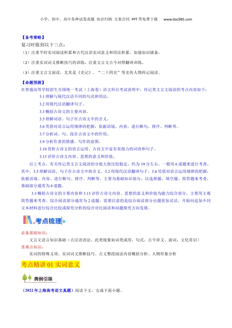 小学、初中、高中各种试卷真题知识归纳文案合同PPT等免费下载www.doc985.com考点04传记文言文(核心考点精讲精练)1.高考真题考点分布考点题型传记文言文选择填空断句问答分析20252025·上海考卷2024试卷类型分值考查标题考查内容2024·上海秋考卷19分韩德基传/荆巫组合阅读实词+断句+翻译+分析人物形象+问题探究2024·上海春考卷17分陈东庄先生传实词+断句+翻译+概括人物形象+表达技巧分析20232023·上海秋考卷19分儒贾传实词+断句+翻译+概括人物形象+文章内容分析2023·上海春考卷17分董三齐传实词+断句+翻译+分析人物形象20222022·上海秋考卷19分韩亿传实词+断句+翻译+内容理解+人物评价2022·上海春考卷19分傅良弼传实词+断句+翻译+分析人物形象+文章内容分析2.命题规律及备考策略【命题规律】近3年上海卷对于传记文言文的考查,主要是以选择+填空题+分析题形式进行考查:第1题,填空题,一般考查实词含义,要求用自己的语言写出词语含义。每题1分。第2题,选择题,一般考查实词含义,要求选择正确答案。每题1分。第3题,断句题,一般考查文言断句,要求正确划分语音停顿、句意。第4题,填空翻译题,一般考查文言翻译,要求正确运用现代汉语翻译句子。第5题,分析问答题,一般考查内容理解与分析,要求正确理解文章大意,理解布局谋篇对人物形象的塑造作用等。第6题,分析问答题,一般考查人物形象概括与分析,兼及文章总体评价与探究,要求正确分析作者的情感、写作的意图,评价古诗文内容、思想的意义和价值。近年常见组合是实词选择填空+断句+翻译+分析人物形象+问题探究。分值17分~20分。2024年上海卷首次出现两篇传记文言文组合阅读。小学、初中、高中各种试卷真题知识归纳文案合同PPT等免费下载www.doc985.com【备考策略】复习时做到以下三点:(1)注重平时实词阅读积累和古代汉语实词意义和用法积累,加强知识储备。(2)注重实词词义推断技巧的训练,注重文言文古今对照翻译训练。(3)注重文言文阅读,尤其是《史记》、“二十四史”等史传人物传记阅读。【命题预测】在普通高等学校招生全国统一考试(上海卷)语文科目考试说明中,传记类文言文阅读的考点内容如下:3.1理解与现代汉语不同的句式和用法。3.2用现代汉语翻译句子。3.3概括古诗文的主要内容。3.5理解词语、句子在古诗文中的含义。3.6凭借对语言运用规律的把握,依据语境、内容,进行断句、排序、判断等。3.7分析词、句、段在古诗文中的作用。3.9分析作者的情感、写作的意图。3.10赏析古诗文的语言运用、古诗文中富有表现力的词语和句子。3.13评价古诗文内容、思想的意义和价值。以上考点,有关传记类文言文阅读的分值大致比较稳定,约为19分左右,一般用6道题来进行考查。其中,3.5理解词语、句子在古诗文中的含义。3.2用现代汉语翻译句子。3.6凭借对语言运用规律的把握,依据语境、内容,进行断句、排序、判断等。主要为基础知识部分,以选择题、填空题、简答题来考查,基础部分通常为4道题。3.3概括古诗文的主要内容和3.13评价古诗文内容、思想的意义和价值为能力综合部分,主要用主观简答题来考查。综合阅读部分通常为2道题。需要注意的是综合阅读部分出题更加灵活,开始向追加不同文本材料进行综合比较或探究分析的综合对比阅读和问题探究方向发展。必备基础知识:文言文语言知识基础(古汉语语法、此类现象如词类或用、句式、古今异义、虚词、文化常识)重难点知识:实词的特殊义项、实词词义推断技巧、古文整段阅读内容概括分析、人物形象分析考点精讲01实词意义(2022年上海高考语文真题)阅读下文,完成下面小题。小学、初中、高中各种试卷真题知识归纳文案合同PPT等免费下载www.doc985.com韩亿传(北宋)苏舜钦①韩公,讳亿,字宗魏。以咸平五年登进士第,除大理评事。②景祐二年,通判陈州。时郡界河决害民,计其补塞费巨万,公驰至其地,集濒河丁壮,就伐薪藁,亲为裁画,一物不取于民而堤复完坚。又去郡数十里有群寇,大浮舰而下,将劫旁邑。公廉知之,自部十余卒,夜掩至,命堰河绝上流,举火伐鼓以疑之,贼弃舟迸走,尽束以付吏。转运使郑文宝闻之,走檄①会公于许。既至,叹曰:“急欲识...
