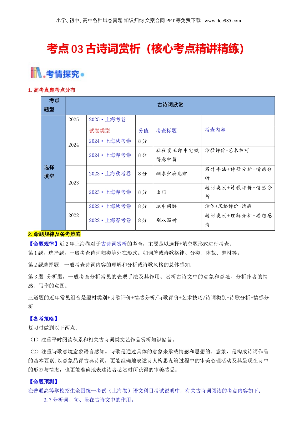 小学、初中、高中各种卷真知文案合同试题识归纳PPT等免下费载www.doc985.com考点03古诗词赏析(核心考点精讲精练)1.高考真题考点分布考点题型古诗词欣赏选择填空20252025·上海考卷2024试卷类型分值考查标题考查内容2024·上海秋考卷8分2024·上海春考卷8分秋夜宴王郎中宅赋得露中菊诗歌评价+艺术技巧20232023·上海秋考卷8分酬李少府见赠写作手法+诗歌分析+情感分析2023·上海春考卷8分出门题材类别+诗歌评价+情感分析20222022·上海秋考卷8分城中闲游诗体+风格评价+情感2022·上海春考卷8分别双温树题材类别+理解分析+思想感情2.命题规律及备考策略【命题规律】近2年上海卷对于古诗词赏析的考查,主要是以选择+填空题形式进行考查:第1题,选择题,一般考查诗词归类等外在形式。如词牌或诗歌格律、分类、体裁、题材等。第2题选择题,一般考查诗词内容的理解和分析或诗歌风格的总体感知;第3题分析题,一般考查分析常见的表现手法及其作用、赏析古诗文中的意象和意境、分析作者的情感、写作的意图。三道题的近年常见组合是题材类别+诗歌评价+情感分析/诗歌评价+艺术技巧/诗词类别+诗歌分析+情感分析【备考策略】复习时做到以下两点:(1)注重平时阅读积累和相关古诗词类文艺作品赏析知识储备。(2)注重诗歌意境意象语言感知。诗歌是通过具体的意象来承载情感和思想的。意象,是构成诗词作品的基本要素,以意象品评古典诗词,更能准确地表述诗人构思谋篇过程中的审美心理活动及其呈现在诗中的形态与情态,也更能准确地表述读者鉴赏时所获得的审美感受。【命题预测】在普通高等学校招生全国统一考试(上海卷)语文科目考试说明中,有关古诗词阅读的考点内容如下:3.7分析词、句、段在古诗文中的作用。小学、初中、高中各种卷真知文案合同试题识归纳PPT等免下费载www.doc985.com3.8分析常见的表现手法及其作用。3.9分析作者的情感、写作的意图。3.10赏析古诗文的语言运用、古诗文中富有表现力的词语和句子。3.11赏析古诗文中的意象和意境。3.12评价古诗文的艺术特点。5.1掌握课本涉及的重要作家、作品及与之相关的文学常识、文化常识。以上考点中,古诗文分为古诗词和古文两大部分,有关古诗词阅读的分值大致比较固定,为8分,一般用3道题来进行考查。5.1掌握课本涉及的重要作家、作品及与之相关的文学常识、文化常识是积累应用考查,主要为选择题,分值为1分,3.12评价古诗词的艺术特点也多以选择题形式出现,分值为2分。其余5分主要从3.8分析常见的表现手法及其作用、赏析古诗词中的意象和意境、3.9分析作者的情感、写作的意图等考点中,或组合或单独命题,考题形式以主观简答题为主,占5分。因此,古诗词欣赏作为基本要求之一,是必考考点。其中对于文学常识、文化常识的考查形式越来越灵活,更侧重与现实的联系和应用,侧重诗词的整体研读。从出题内容上来看,也由单一诗词赏析向两首诗词对比分析的趋势。从出题形式上看,不仅有3道题,也出现了2道题,即诗词赏析一道选择题,一道分析主观题。必备基础知识:古代文体文化常识、诗词分类知识、诗词流派、作家作品、诗词抒情方式、诗词语言风格、诗眼、典故、鉴赏表达用语。重难点知识:诗词分类知识、鉴赏表达用语等。考点精讲01古诗词文学常识该考点大致包括以下四类题型:判断体裁、判断修辞、判断词牌、识记文学常识。题型主要是选择题,当然也有其他如判断对错、填空、联系实际应用等。一、判断体裁(2022年上海高考语文真题)阅读下文,完成题目。城中闲游(唐)刘禹锡借问池台主,多居要路津。千金买绝境,永日属闲人。竹径萦纡入,花林委曲巡。斜阳众客散,空锁一园春。[注]本诗作于使人被贬归来,闲居洛阳时。【试题】下列诗歌选集中,可能收录本诗的一项是()A.《古诗源》B.《乐府诗集》C.《唐宋近体诗集》D.《万首唐人绝句》小学、初中、高中各种卷真知文案合同试题识归纳PPT等免下费载www.doc985.com【答案】C【解析】本题考查诗歌常识主要是诗歌体裁。A.《古诗源》是清人沈德潜选编的上溯先秦下迄隋代的古诗选集;B.《乐府诗集》是北宋文学家郭茂倩编撰的上古至唐、五代的乐府诗歌总集,成书于北宋时期。全书共一...