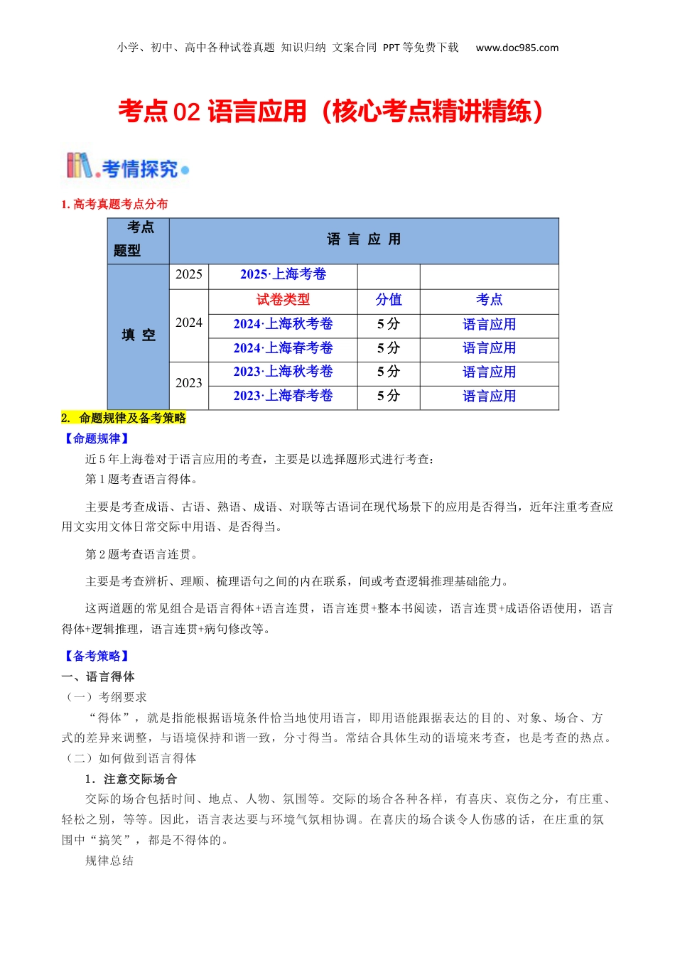 小学、初中、高中各种试卷真题知识归纳文案合同PPT等免费下载www.doc985.com考点02语言应用(核心考点精讲精练)1.高考真题考点分布考点题型语言应用填空20252025·上海考卷2024试卷类型分值考点2024·上海秋考卷5分语言应用2024·上海春考卷5分语言应用20232023·上海秋考卷5分语言应用2023·上海春考卷5分语言应用2.命题规律及备考策略【命题规律】近5年上海卷对于语言应用的考查,主要是以选择题形式进行考查:第1题考查语言得体。主要是考查成语、古语、熟语、成语、对联等古语词在现代场景下的应用是否得当,近年注重考查应用文实用文体日常交际中用语、是否得当。第2题考查语言连贯。主要是考查辨析、理顺、梳理语句之间的内在联系,间或考查逻辑推理基础能力。这两道题的常见组合是语言得体+语言连贯,语言连贯+整本书阅读,语言连贯+成语俗语使用,语言得体+逻辑推理,语言连贯+病句修改等。【备考策略】一、语言得体(一)考纲要求“得体”,就是指能根据语境条件恰当地使用语言,即用语能跟据表达的目的、对象、场合、方式的差异来调整,与语境保持和谐一致,分寸得当。常结合具体生动的语境来考查,也是考查的热点。(二)如何做到语言得体1.注意交际场合交际的场合包括时间、地点、人物、氛围等。交际的场合各种各样,有喜庆、哀伤之分,有庄重、轻松之别,等等。因此,语言表达要与环境气氛相协调。在喜庆的场合谈令人伤感的话,在庄重的氛围中“搞笑”,都是不得体的。规律总结小学、初中、高中各种试卷真题知识归纳文案合同PPT等免费下载www.doc985.com日常场合:要亲切、自然、灵活正式场合:要严肃、庄重、规范娱乐场合:要幽默风趣、生动活泼、轻松愉快丧葬场合:严肃、低沉、哀婉悲伤2.注意交际对象交际对象有性别、年龄、身份、经历、社会背景、文化修养、语言习惯等具体因素。譬如,小朋友问老人:“你今年多大了?”就不合适。因为今年多大了用于年老对年幼,而年幼对年老应该问:“您高寿?”3.注意交际目的交际目的不同,即使说同样的内容,说话的角度、重点等应有所不同。身份不同,目的不同,语言表达自然有别。如广播稿是念给人听的,所以要多用短句、口语,不容易引起歧义的词和生僻的词等。再如即使是同是发言稿,也要注意是否是大众庄重场合和小众非正式场合的不同,开学典礼的发言和个别座谈时的用语也是各有不同等。明确目的,有的放矢。什么事,怎么说,达到什么目的,表达的方式用词不同,例如;1、请人修改文章,用敬语托,谦恭有礼。2、面试应聘,既谦恭有礼又自信满满,以又不骄傲,委婉切勿强硬。3、告示、启示,平实朴素,正式公开,准确简明、全面。4、宴请,写邀请函,恭敬有礼,诚挚委婉,不强硬命令。4、注意谦敬得当。正确使用谦词和敬词常用口决:“家大舍小令外人”(1)对人称自己的长辈和年长的平辈时用“家”。如家严(父)、家慈(母)、家兄等。(2)称别人家中的人,则冠以“令””表示敬重,如令尊、令堂、令郎、令嫒,令亲等。(3)对人称比自己小的亲属时用“舍”。如舍侄、舍弟、舍妹等(4)或用“小、鄙、愚、浅、拙、寒”等字表谦词。如小女、犬子、拙见、拙荆、浅见、鄙人、鄙见、寒舍、愚见、愚兄等。5、注意语体。语体分书面语体和谈话语体两大类。不同人物、不同场合要做到语体色彩得体,否则就会影响语言表达的准确性。口头语言在用词上多用生活化词汇,句式多为短句;书面语言在用词上多用典雅、文言色彩重的词汇,句式多为长句。口头语言包括谈话语体、演讲语体、辩论语体;书面语体包括公文语体、科技语体、文艺语体、政论语体。二、语言连贯(一)考纲要求“连贯”,就是就是句子与句子之间的排列组合符合人们的语言习惯,前后勾连贯通,辞气畅达,它是对语言表达的一种更高要求。常结合具体生动的语境来考查排序,也是考查的热点。(二)如何做到语言连贯(1)注意话题是否统一话题一致,是指组成段落的句子之间,或是组成复句的分句之间,要密切相关,紧紧围绕一个中心或主旨,集中表现一个事实、场景或思想观点。具体来说包括两个方面:所讲述内容(主旨或观点)的统一、主语或陈述对象的统一。小学、初中、高中各种试...