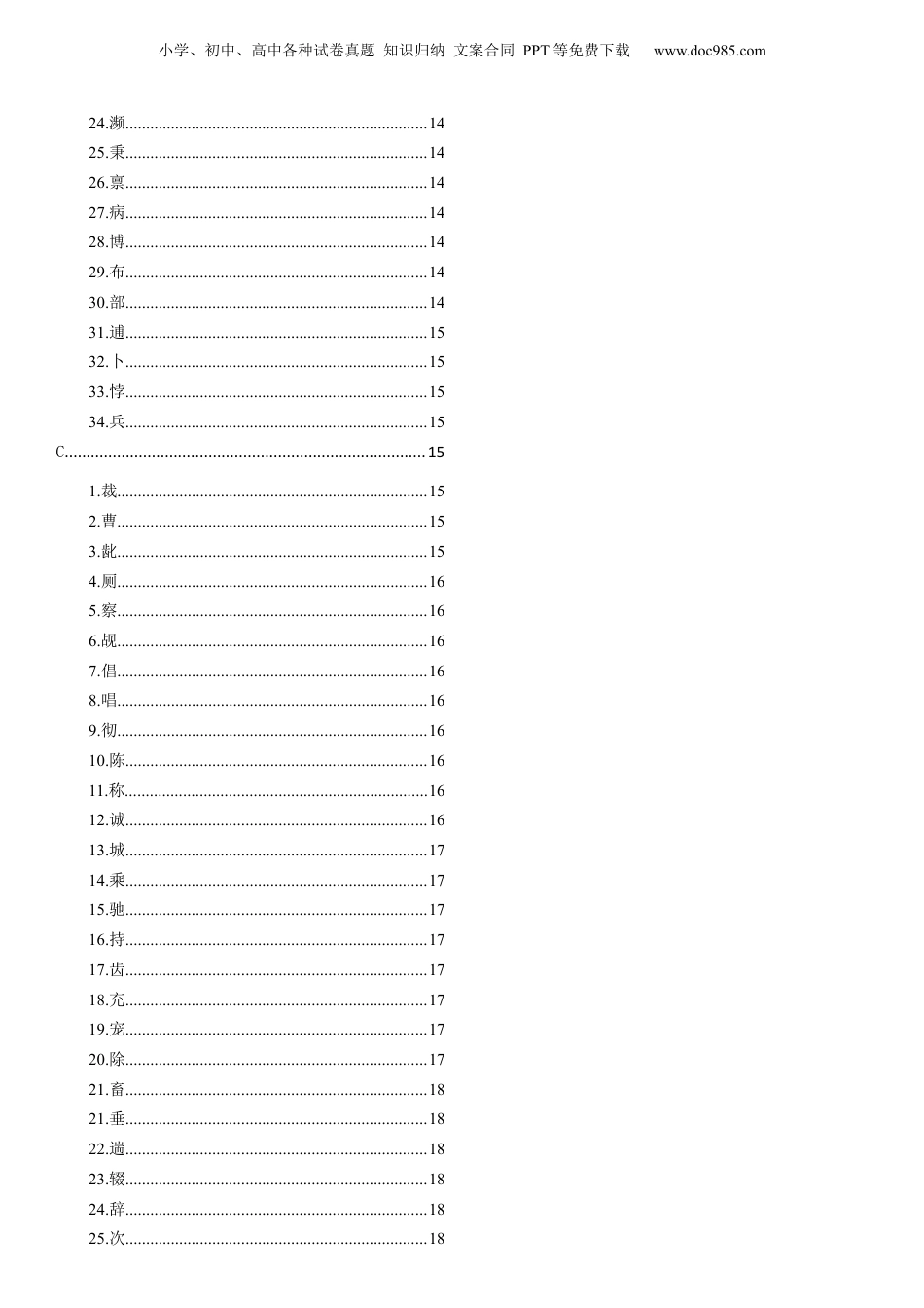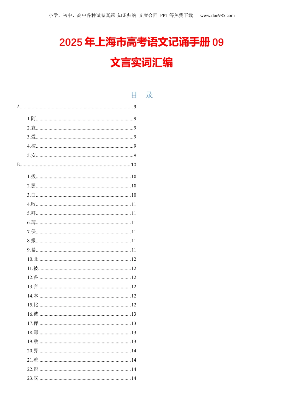 小学、初中、高中各种试卷真题知识归纳文案合同PPT等免费下载www.doc985.com2025年上海市高考语文记诵手册09文言实词汇编目录A.....................................................................................91.阿.............................................................................92.哀.............................................................................93.爱.............................................................................94.按.............................................................................95.安.............................................................................9B...................................................................................101.拔...........................................................................102.罢...........................................................................103.白...........................................................................104.败...........................................................................115.拜...........................................................................116.薄...........................................................................117.保...........................................................................118.报...........................................................................119.暴...........................................................................1110.北.........................................................................1211.被.........................................................................1212.备.........................................................................1213.奔.........................................................................1214.本.........................................................................1215.比.........................................................................1216.彼.........................................................................1317.俾.........................................................................1318.鄙.........................................................................1319.敝.........................................................................1320.畀.........................................................................1421.壁.........................................................................1422.辩.........................................................................1423.宾.........................................................................14小学、初中、高中各种试卷真题知识归纳文案合同PPT等免费下载www.doc985.com24.濒.........................................................................1425.秉.........................................................................1426.禀.........................................................................1427.病.........................................................................1428.博.........................................................................1429.布.........................................................................1430.部.........................................................................1431.逋.........................................................................1532.卜....................................................................
