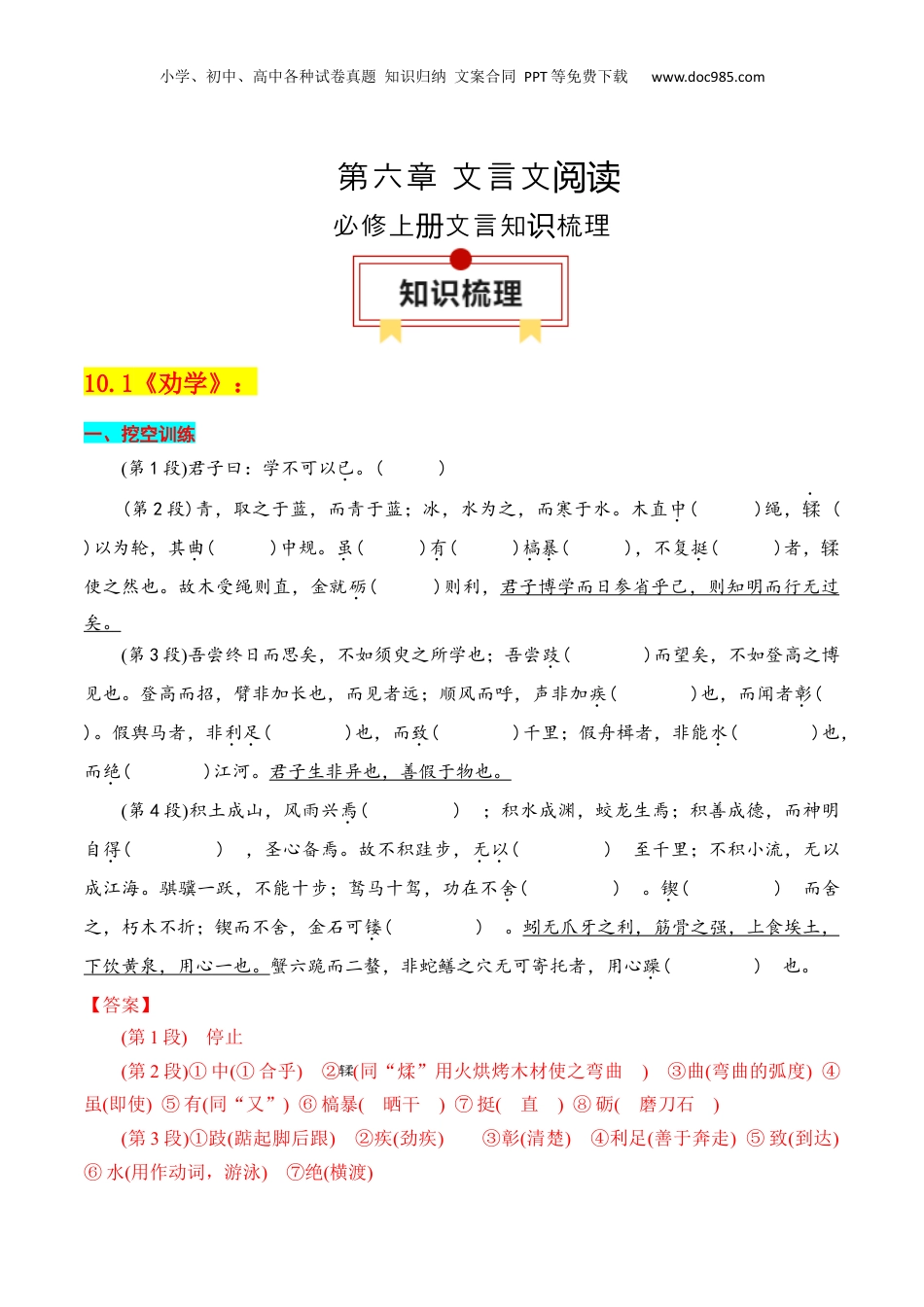 小学、初中、高中各种试卷真题知识归纳文案合同PPT等免费下载www.doc985.com第六章文言文阅读必修上文言知梳理册识10.1《劝学》:一、挖空训练第1段君子曰:学不可以已。()(第2段)青,取之于蓝,而青于蓝;冰,水为之,而寒于水。木直中()绳,𫐓()以为轮,其曲()中规。虽()有()槁暴(),不复挺()者,𫐓使之然也。故木受绳则直,金就砺()则利,君子博学而日参省乎己,则知明而行无过矣。第3段吾尝终日而思矣,不如须臾之所学也;吾尝跂()而望矣,不如登高之博见也。登高而招,臂非加长也,而见者远;顺风而呼,声非加疾()也,而闻者彰()。假舆马者,非利足()也,而致()千里;假舟楫者,非能水()也,而绝()江河。君子生非异也,善假于物也。第4段积土成山,风雨兴焉();积水成渊,蛟龙生焉;积善成德,而神明自得(),圣心备焉。故不积跬步,无以()至千里;不积小流,无以成江海。骐骥一跃,不能十步;驽马十驾,功在不舍()。锲()而舍之,朽木不折;锲而不舍,金石可镂()。蚓无爪牙之利,筋骨之强,上食埃土,下饮黄泉,用心一也。蟹六跪而二螯,非蛇鳝之穴无可寄托者,用心躁()也。【答案】第1段停止(第2段)①中(①合乎)②(同“煣”用火烘烤木材使之弯曲)③曲(弯曲的弧度)④虽(即使)⑤有(同“又”)⑥槁暴(晒干)⑦挺(直)⑧砺(磨刀石)第3段①跂(踮起脚后跟)②疾(劲疾)③彰(清楚)④利足(善于奔走)⑤致(到达)⑥水(用作动词,游泳)⑦绝(横渡)小学、初中、高中各种试卷真题知识归纳文案合同PPT等免费下载www.doc985.com第4段①焉(兼词,相当于“于此”)②得(获得)③无以(没有用来……的)④舍(停止,止息)⑤锲(刻)⑥镂(雕刻)⑦躁(浮躁,不专心)翻译画线的句子①君子广泛地学习而且每天对自己检查、省察,那么,他就会智慧明达而且行为没有过失了。(得分点:博学、参、省、知)②君子的天性(同一般人)没有差别,不过是善于借助外物罢了。(得分点:生、假、物)③蚯蚓没有锋利的牙齿、强健的筋骨,却能向上吃泥土,向下饮黄泉,是因为它用心专一。(得分点:用心、一,定语后置句)二、知识梳理一、古今异义:1.蚓无爪牙之利古义:爪子和牙齿;今义:帮凶、走狗。2.金就砺则利古义:金属制品,此代指金属制的刀剑等;今义:黄金。3.君子博学而日参省乎己古义:检查;今义:探究并领会。二、通假字:1.𫐓以为轮𫐓通“煣”,以火烘木,使其弯曲。2.虽有槁暴有通“又”。暴通曝,晒干。3.则知明而行无过矣知通“智”,智慧。4.君子生非异也生通“性”,天赋,资质。三、词类活用1、君子博学而日参省乎己:日,名词作状语,每天。2、非利足也,而致千里:利,形容词使动用法,使……快;𫐓以为轮/𫐓使之然也:(𫐓,通"煣","使……弯曲")3、非能水也,而绝江河:水,名词作动词,游泳,游水。4、上食埃土:上,方位名词作状语,向上。5、下饮黄泉:下,方位名词作状语,向下。四、特殊句式(一)状语后置句:1、青,取之【于蓝】,于,介词,引出动作的处所,可译为“从”。2、青【于蓝】:于,介词,表比较,可译为“比”。3、寒【于水】:于,介词,表比较,可译为“比”。小学、初中、高中各种试卷真题知识归纳文案合同PPT等免费下载www.doc985.com4、君子博学而日参省【乎己】:乎,相当于介词“于”,引出动作的对象,可译为“对”。(二)定语后置句:1、蚓无爪牙之(利),筋骨之(强):“利”是“爪牙”的定语;“强”是“筋骨”的定语。“之”,定语后置的标志。(三)判断句1.虽有槁暴,不复挺者,𫐓使之然也。(“??者??也”,是判断句式的标志;“者”“也”是语气词,“者”用在结果分句后,表示停顿,并提示下面要说的原因;“也”,语气助词,表示解释的原因。)2.臂非加长也。3.声非加疾也。4.假舆马者,非利足也。5.假舟楫者,非能水也。6.蚓无爪牙之利,筋骨之强,上食埃土,下饮黄泉,用心一也。7.蟹六跪而二螯,非蛇鳝之穴无可寄托者,用心躁也。(四)省略句1.𫐓(之)以(之)为轮。2.𫐓(之)使之然也。五、固定格式1、无以至千里/无以成江海:无以,表示“没有用来……的(办法)”。六、古今异义1、𫐓以为轮——古义:介词“以”...