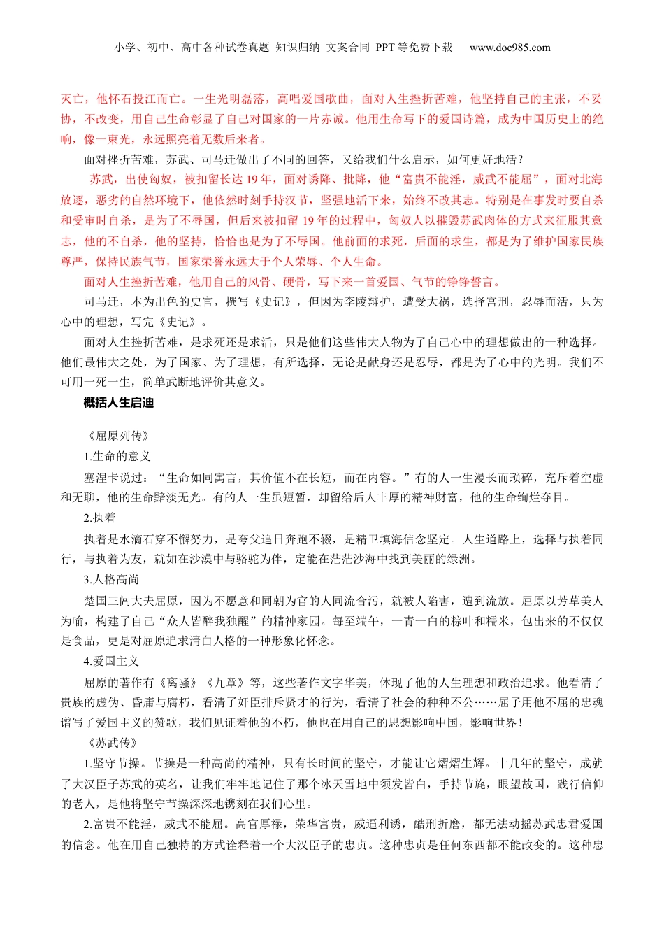 小学、初中、高中各种试卷真题知识归纳文案合同PPT等免费下载www.doc985.com第07讲《屈原列传》《苏武传》一轮复习目录01考情分析·备考策略...............................................................................................................................................202知识导图·思维引航...............................................................................................................................................303考点突破·考法探究...............................................................................................................................................404热考题型·解题策略...............................................................................................................................................405真题感悟·命题洞见...............................................................................................................................................5学习目标:【语言建构与运用】积累文中重要实词、虚词、特殊句式、古代文化常识等文言基础知识。【思维发展与提升】体会屈原苏武精神的现代意义,探究家国情怀的延续性,穿越时空,对话评价人物。【审美鉴赏与创造】细读文本体悟历史人物选择的艰辛,进而理解人物超越艰辛后绽放的人性光辉。【文化传承与理解】领略屈原苏武的精神品质,提升对民族文化的认同感,增强文化自信。【重点】细读文本体悟历史人物选择的艰辛,进而理解人物超越艰辛后绽放的人性光辉。【难点】体会屈原苏武精神的现代意义,探究家国情怀的延续性,穿越时空,对话评价人物。春秋笔法与实录精神班固的《苏武传》是一篇经典的人物传记,被前人称为“叙次精彩,千载下犹有生气”(赵翼《廿二史札记》)。它与司马迁的《屈原列传》同为史传文学的优秀代表,班固与司马迁用不同的语言风貌,或节制或恣肆地表达了自己的情感态度。一、知人论世司马迁和班固的对比司马迁,字子长,夏阳(今陕西韩城)人,西汉史学家、文学家。司马迁10岁开始学习古文书传。20岁,从京师长安南下漫游,遍及江淮流域和中原一带,考察风俗,采集传说。后仕为郎中,为武帝的侍卫和扈从,多次随驾西巡,司马迁继承其父亲的职位任太史令。后来司马迁开始撰写《史记》。但因为李陵辩护,触怒武帝下狱受宫刑。后获赦出狱,为中书令,发奋著书,最后完成了《史记》。小学、初中、高中各种试卷真题知识归纳文案合同PPT等免费下载www.doc985.com班固,字孟坚,扶风安陵(今陕西咸阳东北)人,东汉史学家、文学家。从小出生儒学世家的班固受到父祖的熏陶,博览群书、九岁能属文,十六岁对于儒家经典无一不通。后洛阳的太学求学,结识了许多贤人,看到了许多经书典籍。任兰台令,经过20多年的努力,写成《汉书》。班固随大将军窦宪出征匈奴为中护军,后班固因窦宪专权受到株连死于狱中,其作品《汉书》由其妹和同郡人马续完成。两位史学家,少有文采,博览群书,又有写史的家学渊源,撰写鸿篇巨著的过程中,都遭遇了人生横祸,受到牵连获罪,但司马迁忍辱偷生,写完《史记》,班固直接死于狱中,由他人续写完成。屈原和苏武的对比屈原,我国第一位伟大的爱国浪漫主义诗人,用楚辞的形式写了我国第一首政治抒情诗《离骚》。他主张联齐抗秦,遭奸人陷害,罢官放逐,但心仍系国。楚国被攻后,自投汩罗江而死。“屈原”成为爱国的象征。名人对其评价:1.李白:屈平词赋悬日月2.王逸:膺忠贞之质,体清洁之性,直如右砥,颜如丹青;进不隐其谋,退不顾其命,此诚绝世之行,俊彦之英也3.闻一多:中国历史上唯一有充分条件称为人民诗人的人4.毛泽东:屈原的名字对我们更为神圣。他不仅是古代的天才歌手,而且是一名伟大的爱国者,无私无畏,勇敢高尚。他的形象保留在每个中国人的脑海里,无论在国内国外,屈原都是一个不朽的形象。我们就是他生命长存的见证人。苏武,西汉时期杰出的外交家,民族英雄。天汉元年奉命以中郎将持节出使匈奴被扣留,历尽艰辛,...