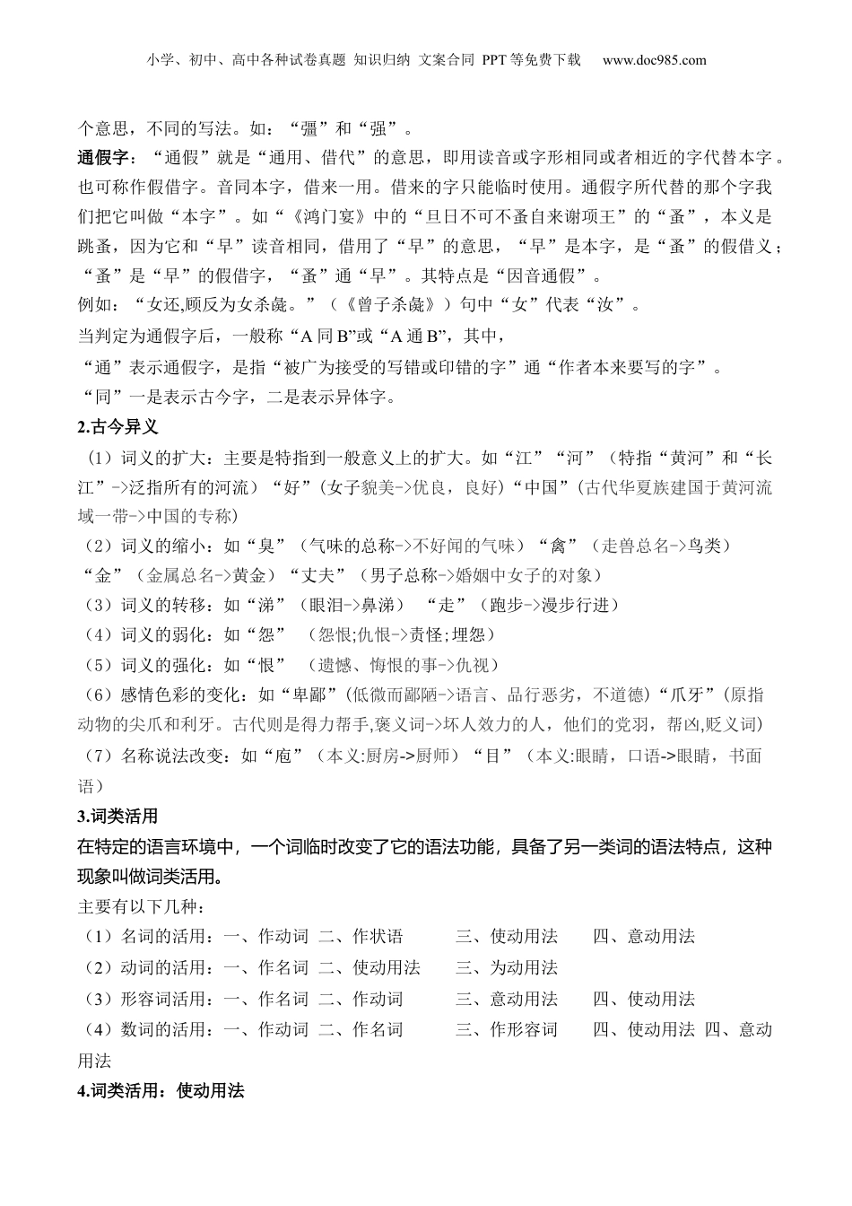 小学、初中、高中各种试卷真题知识归纳文案合同PPT等免费下载www.doc985.com2025年上海市高考语文记诵手册08文言文基础知识积累目录一、文言词类常识............................................................................................2二、常见副词举例............................................................................................5三、常见文言句式............................................................................................9四、常见固定句式..........................................................................................12五、常见虚词归类..........................................................................................16六、常见虚词用法..........................................................................................17七、常见修辞方式..........................................................................................33八、常见表现手法..........................................................................................35九、常见升迁用语..........................................................................................37十、其他文化常识..........................................................................................41一、文言词类常识1.通假字通用字:“两个读音相同或相近、意义也相通的字,古代可以写这个,也可以写那个。《卖炭翁》中的“系向牛头充炭直”的“直”就是“值”的意思,“直”和“值”这两个字古代通用。古今字:古已有之,今又造字。原字是古字,分化后形成的新词的字就是今字。新造的字与原来兼表原来意义的字合称为“古今字”。新造的字是“今字”,原来兼表意义的字是“古字”。如:“莫(暮)”的本意是太阳落在草丛中,表示日暮、傍晚。“莫”被“借”为否定副词“不”、“没有谁”的意思,故又造“暮”字。“莫”和“暮”合称一对古今字。异体字:异体字是一个字的正体之外的写法,字音和字义相同而字形不同的一组字。即同一小学、初中、高中各种试卷真题知识归纳文案合同PPT等免费下载www.doc985.com个意思,不同的写法。如:“彊”和“强”。通假字:“通假”就是“通用、借代”的意思,即用读音或字形相同或者相近的字代替本字。也可称作假借字。音同本字,借来一用。借来的字只能临时使用。通假字所代替的那个字我们把它叫做“本字”。如“《鸿门宴》中的“旦日不可不蚤自来谢项王”的“蚤”,本义是跳蚤,因为它和“早”读音相同,借用了“早”的意思,“早”是本字,是“蚤”的假借义;“蚤”是“早”的假借字,“蚤”通“早”。其特点是“因音通假”。例如:“女还,顾反为女杀彘。”(《曾子杀彘》)句中“女”代表“汝”。当判定为通假字后,一般称“A同B”或“A通B”,其中,“通”表示通假字,是指“被广为接受的写错或印错的字”通“作者本来要写的字”。“同”一是表示古今字,二是表示异体字。2.古今异义(1)词义的扩大:主要是特指到一般意义上的扩大。如“江”“河”(特指“黄河”和“长江”->泛指所有的河流)“好”(女子貌美->优良,良好)“中国”(古代华夏族建国于黄河流域一带->中国的专称)(2)词义的缩小:如“臭”(气味的总称->不好闻的气味)“禽”(走兽总名->鸟类)“金”(金属总名->黄金)“丈夫”(男子总称->婚姻中女子的对象)(3)词义的转移:如“涕”(眼泪->鼻涕)“走”(跑步->漫步行进)(4)词义的弱化:如“怨”(怨恨;仇恨->责怪;埋怨)(5)词义的强化:如“恨”(遗憾、悔恨的事->仇视)(6)感情色彩的变化:如“卑鄙”(低微而鄙陋->语言、品行恶劣,不道德)“爪牙”(原指动物的尖爪和利牙。古代则是得力帮手,褒义词->坏人效力的人,他们的党羽,帮凶,贬义词)(7)名称说法改变:如“庖”(本义:厨房->厨师)“目”(本义:眼睛,口语->眼睛,书面语)3.词类活用在特定的语言环境中,一个词临时改变了它的语法功能,具备了另一类...