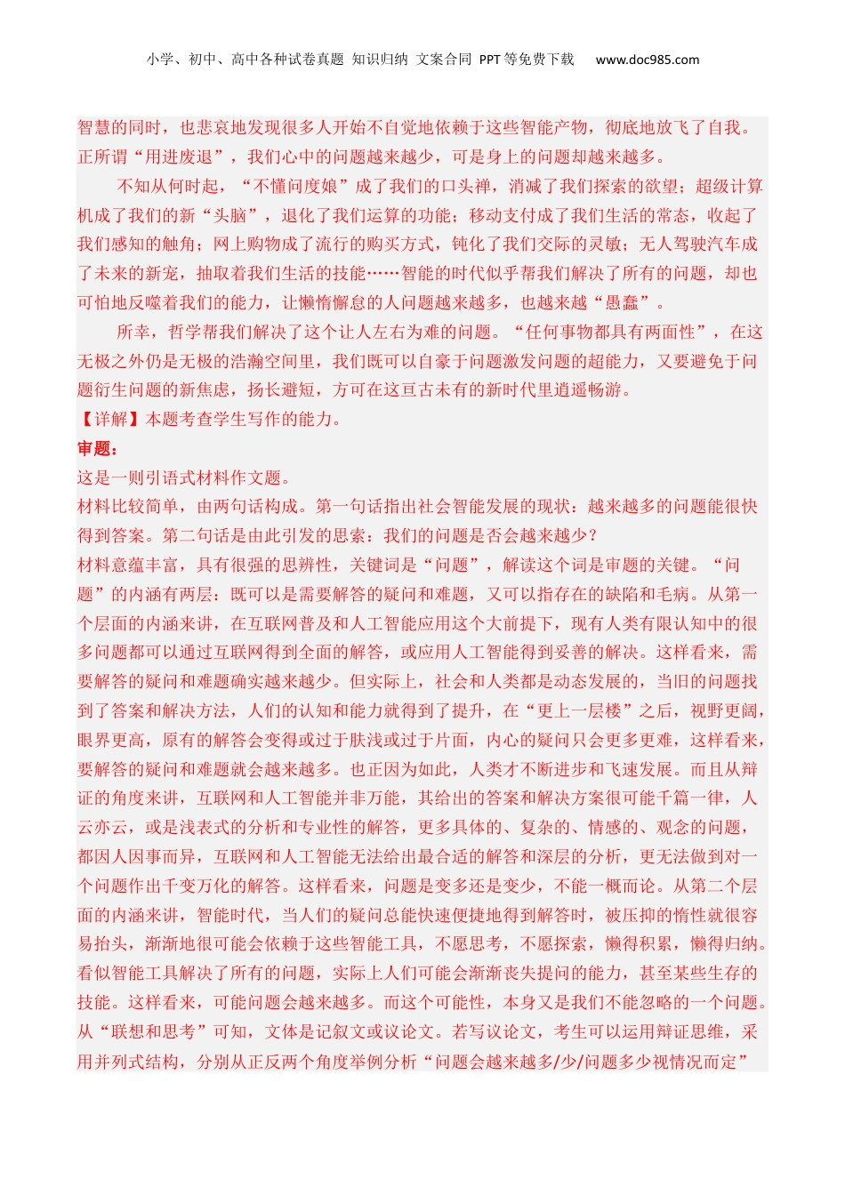 小学、初中、高中各种试卷真题知识归纳文案合同PPT等免费下载www.doc985.com专题01材料阐述类(2024·新高考Ⅰ卷)阅读下面的材料,根据要求写作。随着互联网的普及、人工智能的应用,越来越多的问题能很快得到答案。那么,我们的问题是否会越来越少?以上材料引发了你怎样的联想和思考?请写一篇文章。要求:选准角度,确定立意,明确文体,自拟标题;不要套作,不得抄袭;不得泄露个人信息;不少于800字。【答案】例文:无极之外仍是无极盘古开天辟地,启动了世界运行的按钮。从刀耕火种到互联网普及,从混沌蒙昧到人工智能,时至今日,越来越多的问题能迅速在网上检索到答案。这是否意味着我们可以从思考探索中摆脱出来,问题越来越少呢?窃以为不然。正如汤之问棘:“上下四方有极乎?”棘曰:“无极之外复无极也。”旧的问题得到了解答,新的问题又接踵而至,不断循环可谓无极之外仍是无极。爱迪生曾说:“一切都是谜,一个谜的答案是另一个谜。”人类本就是一种爱探究原因的生物,600万年以来,哪怕是茹毛饮血,人类从未停止过质疑释疑的脚步。也正是得益于此,代表着人类智慧结晶的互联网和人工智能高效快捷地反哺着人们好奇的胃口,顷刻间便消散了人们心中的疑惑。于是,在本能的驱使下,人们只会“撑一支长篙,向青草更青处漫溯”,问题岂会越来越少?放眼物理研究,牛顿解答了苹果为什么会落在地上后,又疑惑引力来自哪里,爱因斯坦发现这是广义相对论的问题,但广义相对论却与量子力学格格不入……力学的问题如同一个九连环,环环相扣,“引无数英雄竞折腰”,孜孜不倦!可见,世界本就是一本“沙之书”,解答了一个谜,另一个谜便应运而生,解答的速度越快,产生的问题便越多。世界便是在这样的回环往复当中,走入了发展的快车道,催生了今天的日新月异!毋庸置疑,高速发展的时代在全面答疑的同时,的确加速了我们探索的步伐。但是,正如狄更斯所言:“这是一个智慧的年代,这是一个愚蠢的年代。”我们在欣喜于自己越来越小学、初中、高中各种试卷真题知识归纳文案合同PPT等免费下载www.doc985.com智慧的同时,也悲哀地发现很多人开始不自觉地依赖于这些智能产物,彻底地放飞了自我。正所谓“用进废退”,我们心中的问题越来越少,可是身上的问题却越来越多。不知从何时起,“不懂问度娘”成了我们的口头禅,消减了我们探索的欲望;超级计算机成了我们的新“头脑”,退化了我们运算的功能;移动支付成了我们生活的常态,收起了我们感知的触角;网上购物成了流行的购买方式,钝化了我们交际的灵敏;无人驾驶汽车成了未来的新宠,抽取着我们生活的技能……智能的时代似乎帮我们解决了所有的问题,却也可怕地反噬着我们的能力,让懒惰懈怠的人问题越来越多,也越来越“愚蠢”。所幸,哲学帮我们解决了这个让人左右为难的问题。“任何事物都具有两面性”,在这无极之外仍是无极的浩瀚空间里,我们既可以自豪于问题激发问题的超能力,又要避免于问题衍生问题的新焦虑,扬长避短,方可在这亘古未有的新时代里逍遥畅游。【详解】本题考查学生写作的能力。审题:这是一则引语式材料作文题。材料比较简单,由两句话构成。第一句话指出社会智能发展的现状:越来越多的问题能很快得到答案。第二句话是由此引发的思索:我们的问题是否会越来越少?材料意蕴丰富,具有很强的思辨性,关键词是“问题”,解读这个词是审题的关键。“问题”的内涵有两层:既可以是需要解答的疑问和难题,又可以指存在的缺陷和毛病。从第一个层面的内涵来讲,在互联网普及和人工智能应用这个大前提下,现有人类有限认知中的很多问题都可以通过互联网得到全面的解答,或应用人工智能得到妥善的解决。这样看来,需要解答的疑问和难题确实越来越少。但实际上,社会和人类都是动态发展的,当旧的问题找到了答案和解决方法,人们的认知和能力就得到了提升,在“更上一层楼”之后,视野更阔,眼界更高,原有的解答会变得或过于肤浅或过于片面,内心的疑问只会更多更难,这样看来,要解答的疑问和难题就会越来越多。也正因为如此,人类才不断进步和飞速发展。而且从辩证的角度来讲,互联网和人工智能并非万能,...