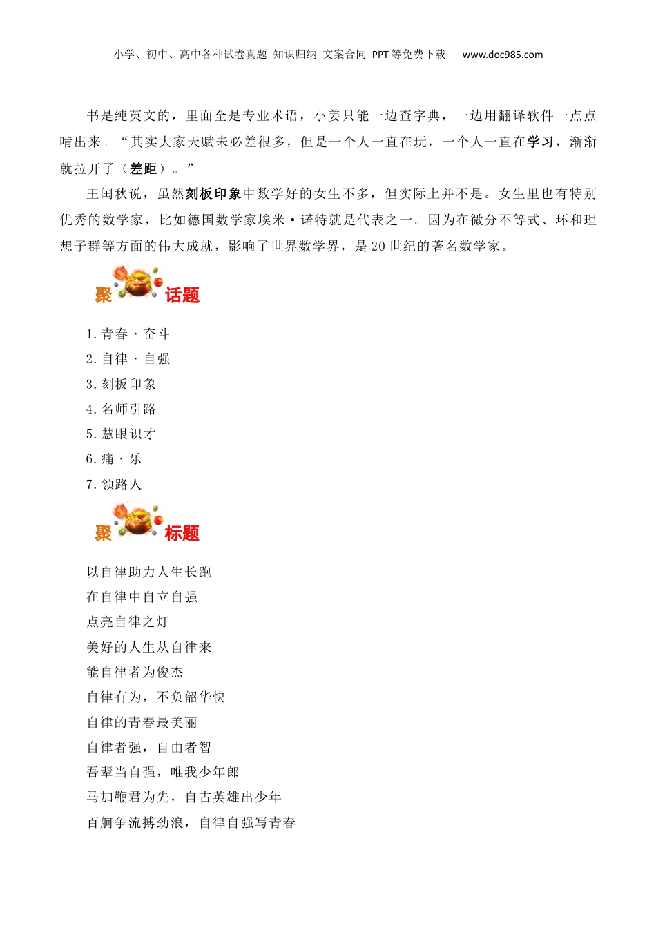 小学、初中、高中各种试卷真题知识归纳文案合同PPT等免费下载www.doc985.com在自律中自强中生姜萍打阿里专进数赛决赛时事+话题+标题+观点+金句+事例+导写+范文聚时事6月13日,2024阿里巴巴全球数学竞赛公布决赛名单,江苏17岁的服装专业的中专生姜萍以第十二名的成绩晋级。进入决赛的前20名选手中,除了姜萍,其他人均来自北大、清华、麻省理工、剑桥等知名高校。公告显示,801名进入决赛的选手来自17个国家和地区,平均年龄22岁。江苏涟水中等专业学校女生姜萍预选赛拿到93分,是这项赛事举办以来第一位进入决赛的中专在读生。很多网友把点赞送给了挖掘她的数学老师王闰秋,称王老师“配享太庙”。实际上王老师本人也是一位数学高手,两次参加了阿里数赛。他说:“研究数学就像走一个很大的迷宫,可能只有一条路能通过,大部分都是死路,但这种沉浸于数学世界中的感觉,让我痛并快乐着。”2022年,他拿到数学博士学位后,考到了姜萍所在的学校。姜萍是他带的第一届学生。第一次月考数学成绩,姜萍断崖式领先,让王闰秋想到了自己。在学习数学的道路上,王闰秋也遇到过很多挫折,现在回想起来,如果自己年轻时有个领路人,也许人生会不一样。“所以我想尽自己的可能帮助他们,让他们知道还有不一样的未来。”一直悄悄留意姜萍的王闰秋开始给她“开小灶”:主动向她推荐同济大学出版的《高等数学》和谢惠民的《数学分析》。在研究多元微积分的过程中,遇到困难的姜萍又继续研究起了LawrenceC.Evans编写的《偏微分方程》。在王闰秋眼里,姜萍是一个特别自律的姑娘。当大部分同学自我放飞时,姜萍几乎所有的课余和晚自习时间都沉浸在数学的世界里,有时做题做到夜里一两点钟;遇到不懂的,也会主动找王闰秋请教。小学、初中、高中各种试卷真题知识归纳文案合同PPT等免费下载www.doc985.com书是纯英文的,里面全是专业术语,小姜只能一边查字典,一边用翻译软件一点点啃出来。“其实大家天赋未必差很多,但是一个人一直在玩,一个人一直在学习,渐渐就拉开了(差距)。”王闰秋说,虽然刻板印象中数学好的女生不多,但实际上并不是。女生里也有特别优秀的数学家,比如德国数学家埃米·诺特就是代表之一。因为在微分不等式、环和理想子群等方面的伟大成就,影响了世界数学界,是20世纪的著名数学家。聚话题1.青春˙奋斗2.自律˙自强3.刻板印象4.名师引路5.慧眼识才6.痛˙乐7.领路人聚标题以自律助力人生长跑在自律中自立自强点亮自律之灯美好的人生从自律来能自律者为俊杰自律有为,不负韶华快自律的青春最美丽自律者强,自由者智吾辈当自强,唯我少年郎马加鞭君为先,自古英雄出少年百舸争流搏劲浪,自律自强写青春小学、初中、高中各种试卷真题知识归纳文案合同PPT等免费下载www.doc985.com以梦为马,不负韶华无悔青春,逐梦星河奋斗青春,无问西东奋斗驱萧索,不负少年时白日莫空过,青春不再来青春须早为,岂能长少年青春逢盛世,奋斗正当时青春恰似火,扬帆正当时发愤图强作栋梁,不负年少做好奔角后浪,打磨青春铁肩今朝唯我少年郎,敢问天地试锋芒未知苦,焉知乐聚观点★自律要持之以恒村上春树:清教徒式的自律生活与醉生梦死的天才作家菲茨杰拉德不同,村上春树过的是一种清教徒式的自律生活。清晨五时即起,前几个小时用来写作和处理重要事务,之后是运动与杂事,日暮时分则停止工作,要么看书要么听音乐,夜晚十时前入睡,拒绝一切夜生活。不说泄气话,不发牢骚,不找借口。每日写作10页,每页400字,不能少,也不能过多。因为自律的核心不是爆发力,而是耐力。他说写长篇小说是一项“彻底的个人体力劳动”,所以为了保持体力,从1982年起,他每天跑或游泳一小时,并参加马拉松,坚持至今,也由此创作出了名作《当我谈跑步时我谈些什么》。长年累月如专业运动员般的自律训练,村上春树已经成功地把身体塑造成为了自己的友军,也成为了一个不被灵感控制,反而能够控制灵感的人。他说:当自律变成一种本能的习惯,你就会享受到它的快乐。他还一直保持着一个“每日修改”的习惯,即每日进行当天的写作之前,花15至20分钟,重读并修改前一小学、初中、高中各种试卷真题知识归纳文...