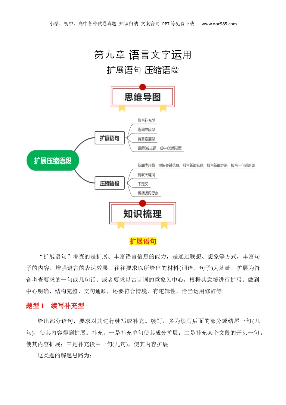 小学、初中、高中各种试卷真题知识归纳文案合同PPT等免费下载www.doc985.com第九章言文字用语运展句段扩语压缩语扩展语句“扩展语句”考查的是扩展、丰富语言信息的能力,是通过联想、想象等方式,丰富句子的内容,增强语言的表达效果。往往要求以所给出的材料(词语、句子)为基础,扩展为符合考查要求的一句或几句话;或者要求以古诗词的意象为中心,根据其意境进行扩写。做到中心明确、结构完整、文句通顺,还要符合情境,有逻辑性,恰当运用修辞等。题型1续写补充型给出部分语句,要求对其进行续写或补充。续写,多为续写后面的部分或结尾一句(几句),使其内容得到扩展。补充,一是补充单句使其成分扩展;二是补充某个文段的开头一句,使其内容扩展;三是补充段中一句(几句),使其内容扩展。这类题的解题思路为:小学、初中、高中各种试卷真题知识归纳文案合同PPT等免费下载www.doc985.com第一步:读懂题目要求,准确把握题目所提供的有效信息。第二步:要把握题目所提供语段或语句的语脉,以此为扩写源头,确定扩写的突破口,搞清整个语段或句子上下文之间的内在联系。第三步:发挥合理的联想和想象。注意推导合理,主旨一致,修辞、句式、意境、感情色彩等符合要求。要从试题形式和内容两方面入手进行扩展。要注意避免只顾形式不顾内容,或者只顾内容不顾形式,草率审题,盲目机械地答题等错误。第四步:检查扩展后的内容是否符合题干要求,语言是否连贯,有无语病,等等。例:根据下面的情境,补写内容。不超过50个字。黑暗中,一石身的一石有一点光,不平地:块头见边颗钻没泽愤愤说“我不知道平人时什把抬得那高,把作。在跟我又有什呢,不都暗淡无光们为么你么你视宝贝现你么两样?吗”石:钻说“是的,我和一,也不光。你样会发”,天露出一星光。石,这时边丝头发现身的石立刻出熠熠光,的光芒甚至比星光更亮、更耀眼。边钻闪烁辉它闪石头明白了:_______________________________________【解析】是一述性段,要求容。这则叙语试题补写内第一段是石石的不平的。第二段是石的回答和星光出后石的所。需头对钻说愤愤话钻现头见要的一句是全部文字的句,要住填写这总结抓关键词语“光发”,准确括概。【答案】钻石虽然不会发光,但它懂得反射别人的光芒,传播别人的光芒,并把别人的光芒传播得更亮。题型2连词成段型连词成段就是提供一组(一般挑选若干)有联系或看似没有联系的词语,要求考生写一段话,将其连缀扩展。这类题目有的要求围绕一定的中心写一段语意完整的话;有的要求充分运用所提供的词语,运用指定的修辞方法,采用特殊的表达方式(或议论,或记叙,或说明),在联想、想象的基础上扩展成意蕴丰富的一段话。这类题的解题思路为:第一步:审准题干。要看清题目要求,把握题目中的有效信息。题目要求的词语都要用到,不能偷换、遗漏或更改。小学、初中、高中各种试卷真题知识归纳文案合同PPT等免费下载www.doc985.com第二步:词语联想。要明确需要串联的几个词语的意义,注意几个词语之间的关系,准确使用词语构造恰当的语境、营造恰当的氛围。第三步:整合答案。扩展后的句子和语段表意要清楚明白,在语意上要符合逻辑,要有实在的意义。自我检查,通读所扩展的文段,确保言通、字顺、意明,且符合字数要求。例:请用所给的四个词语写一段文字,不少于40个字。家濡不同好像风养与众【解析】本于成段型展。四成一段,中心是题属连词扩将这个词连话词“家风”,再由“家风”可以想到家是什、风么“家风”“濡养”了什等容,后面的也可以么内两个词语这样进行想联【答案】(示例)家风在中国传统文化中源远流长,它濡养了一代又一代的中国人,每个家族的家风都是与众不同的。随着传统大家庭在现代社会的逐渐消失,家风在今天好像离我们很遥远。但我们应珍视它,让它的内涵在新时代焕发青春活力。题型3诗意素描型给出古典诗句或名句,要求对其进行情景式扩展或赏析式扩展。这类题的解题思路为:第一步:审读题干,明确要求。第二步:读透诗歌,即理解提供的材料。把握原诗的意境,理解作者的情感,做出合理的想象,构造出合理的场景。第三步:想象联想。展开合理想象,...