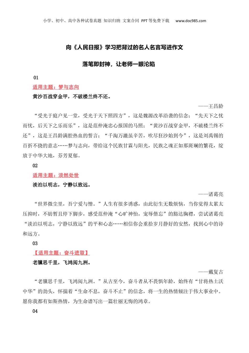 小学、初中、高中各种试卷真题知识归纳文案合同PPT等免费下载www.doc985.com向《人民日报》学习把背过的名人名言写进作文落笔即封神,让老师一眼沦陷01适用主题:梦与志向黄沙百战穿金甲,不破楼兰终不还。——王昌龄“受光于庭户见一堂,受光于天下照四方”,这是魏源改革沿袭的信念;“先天下之忧而忧,后天下之乐而乐”,这是范仲淹忠心报国的马照;“黄沙百战穿金甲,不破楼兰终不还”,这是王昌龄满腔热血的誓言;“千淘万漉虽辛苦,吹尽狂沙始到今”,这是刘禹锡的百折不挠的意志……梦与志向,带给这个民族甘霖与阳光,民族之魂正如那斑斓的繁花,绽放于中华大地,芬芳夏郁。02适用主题:淡然处世淡泊以明志,宁静以致远。——诸葛亮“世界微尘里,吾宁爱与憎。”人生有很多诱惑,由此衍生无数烦恼,当你觉得太累太压抑时,不妨暂且停下脚步,感受范仲淹“心旷神怡,宠辱偕忘”的豁达胸襟,尝试诸葛亮“淡泊以明志,宁静以致远”的平和心态……相信你会重拾岁月静好的安然,找到心中的诗和远方。03【适用主题:奋斗进取】老骥思千里,飞鸿阅九洲。——戴复古“老骥思千里,飞鸿阅九洲。”从古至今,奋斗者从不畏惧年龄,始终有“甘将热土沃中华”的劲头,怀揣着“生命不息,奋斗不止”的信念,将一生的热情倾注于伟大事业中。愿你我都有如斯热情,为生命谱写出一篇壮丽无悔的鸿章。04小学、初中、高中各种试卷真题知识归纳文案合同PPT等免费下载www.doc985.com适用主题:家国情怀朱门酒肉臭,路有冻死骨。——杜甫《自京赴奉先县咏怀五百字》杜甫的一生,深刻诠释着何为家国情怀。从“白头搔更短,浑欲不胜簪”的凄清自画中,我们窥见他对国运兴衰的深切忧虑;从“会当凌绝顶,一览众山小”的豪迈誓言中,我们感受到他对入士报国的雄心渴望;从“朱门酒肉臭,路有冻死骨”的沉痛描绘中,我们看到他对民间疾苦的悲切同情。大爱为民,大义为国,其精神如歌,跨越时空,触动每一个新时代青年,以史为鉴,放眼世界广阔,投身强国浪潮。05适用主题:时光流逝、珍惜时间等江水流春去欲尽,江潭落月复西斜。——张若虚《春江花月夜》“江水流春去欲尽,江潭落月复西斜。”时间分秒不停,人生流逝如流水。东晋祖逖闻鸡起舞、梁代刘绮然荻读书、西汉匡衡凿壁偷光……他们皆是珍惜时光的真实写照。青年一代作为追梦者,作为奋斗者,理应追风赶月,分秒必争,不负韶华!06适用主题:青春力量、后生可畏、奉献奋斗桐花万里丹山路,雏凤清于老凤声。——李商隐李商隐曾言:“桐花万里丹山路,雏凤清于老凤声。”君可见,把青春和事业奉献给脱贫事业的黄文秀,带领群众攻坚克难向前飞;君可见,怀梦回国的耶鲁学子秦玥飞植根基层,积极为人民服务。无数青年如苔花微微,却馥郁相会,携翩然而至之春,所谓芳林新叶催陈叶,他们一路不啻微光,造炬成阳。07适用主题:取长补短、虚心学习梅须逊雪三分白,雪却输梅一段香。——宋·卢梅坡《雪梅》小学、初中、高中各种试卷真题知识归纳文案合同PPT等免费下载www.doc985.com“独学而无友,则孤陋而寡闻。”各民族文化交相辉映,因互鉴而丰富多彩。在文化交流过程中,不能囫囵吞枣地吸纳他国文化,而应取长补短、择善而从。“梅须逊雪三分白,雪却输梅一段香。”在文明的交流借鉴过程中,我们要不断发展自身文化,打造各国平等交流的平台,这对中华民族文化复兴以及世界文明繁荣都是大有裨益的。08适用主题:时光流逝、珍惜时间、努力向上等夫天地者万物之逆旅也;光阴者百代之过客也。——李白《春夜宴从弟桃花园序》天地悠悠,人海茫茫,星霜荏苒,居诸不息。正如青莲居士所言:“夫天地者万物之逆旅也;光阴者百代之过客也”,天地滋养万物,光阴恍恍百代,生命的旅途匆匆,惟有珍惜才能让短暂的人生铸就永恒的光彩。因为争分夺秒,法国作家巴扎尔克根据创作时间表日夜沉浸在写作中,终成一代名家;因为惜时如金,我国近代绘画大师齐白石在八十五高龄时也不闲一日坚持创作,作品享誉国内。珍惜时光,力争上游,少年扬帆起航吧!09适用主题:志向坚定、高风亮节月缺不改光,剑折不改刚。——梅尧臣《古意》北宋著名的文学家、政治家范仲淹从小...